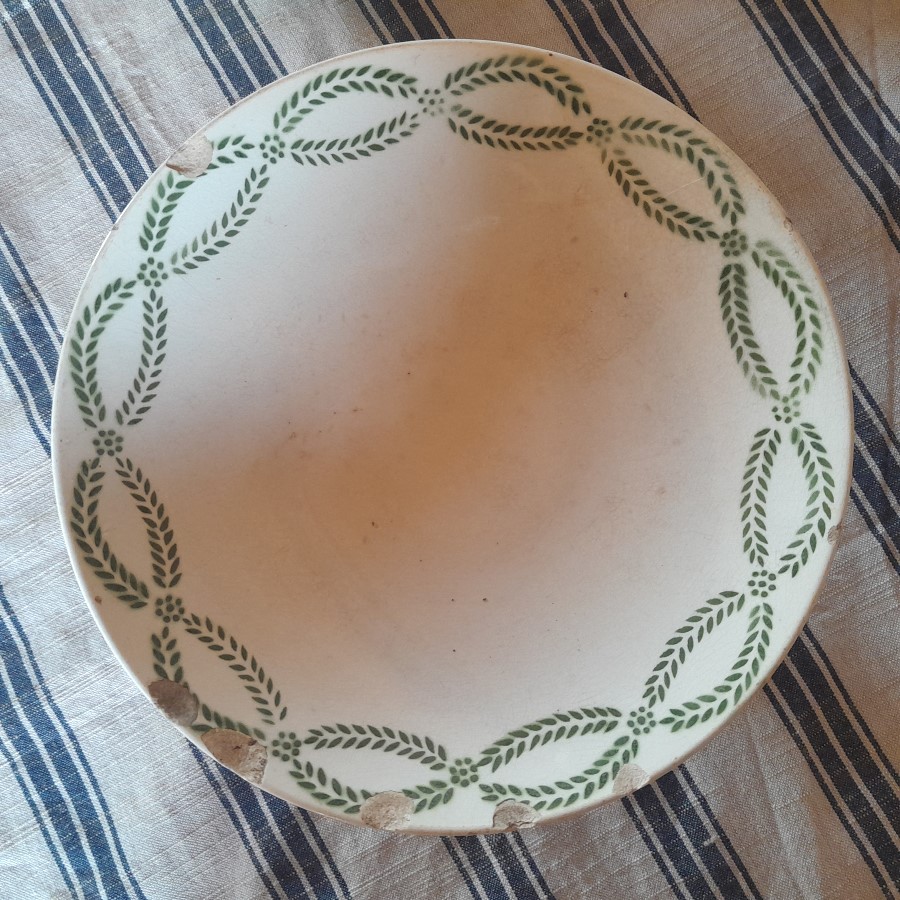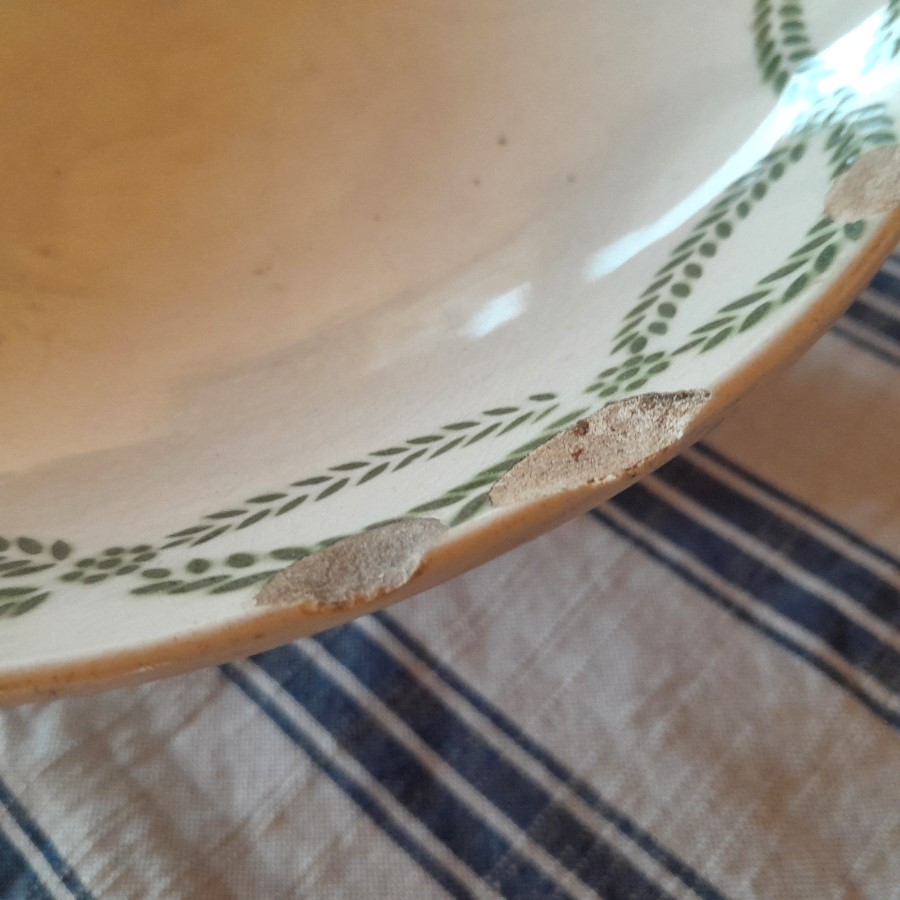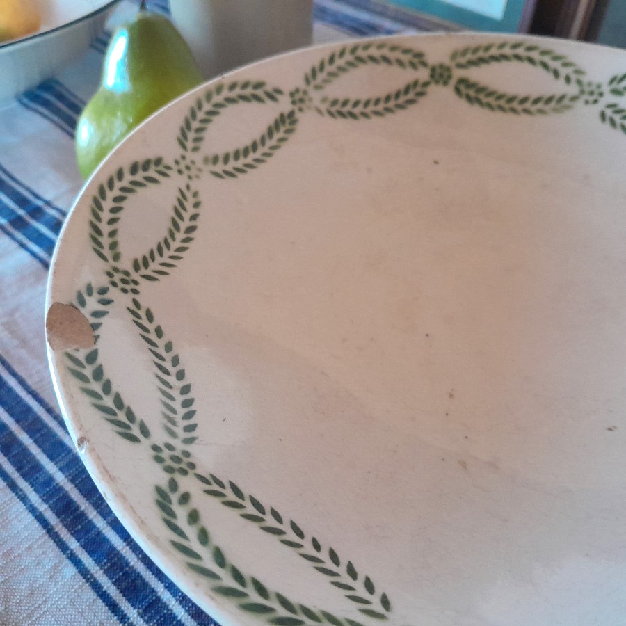 白地に緑のリース模様が縁に沿って入っているシンプルなデザイン。厚みがあり置いた時も安定しています。表面は滑らかでツヤがあります。縁に大小の欠けが8箇所ほどあります。貫入のほか、多少の変色がまばらに見られます。