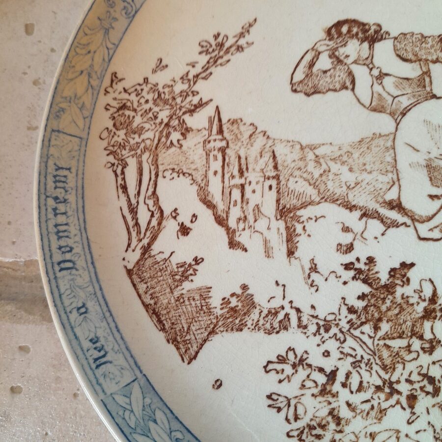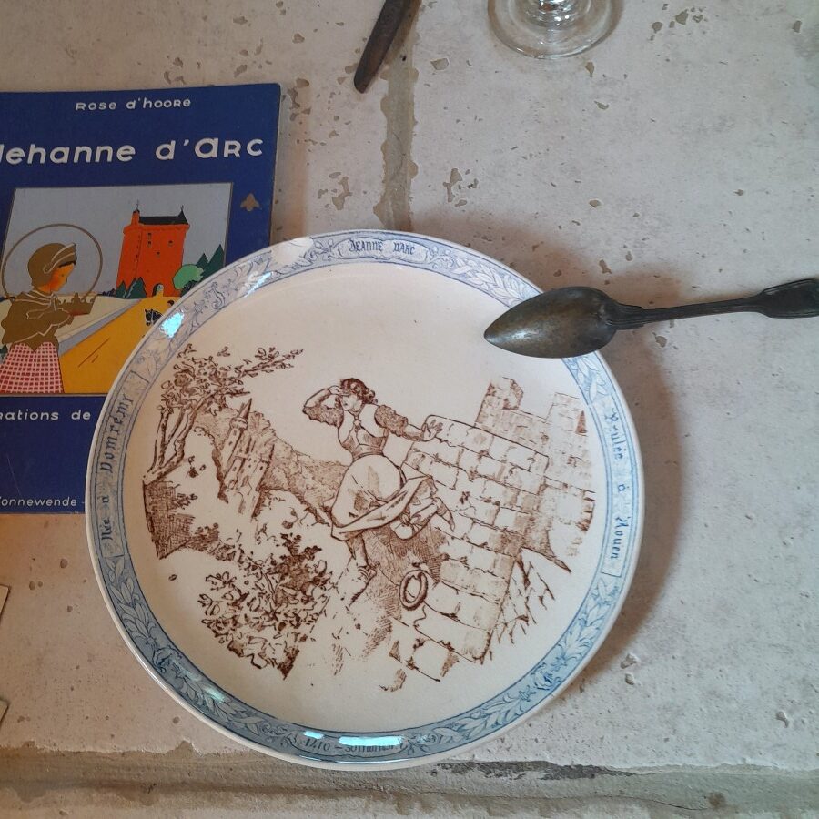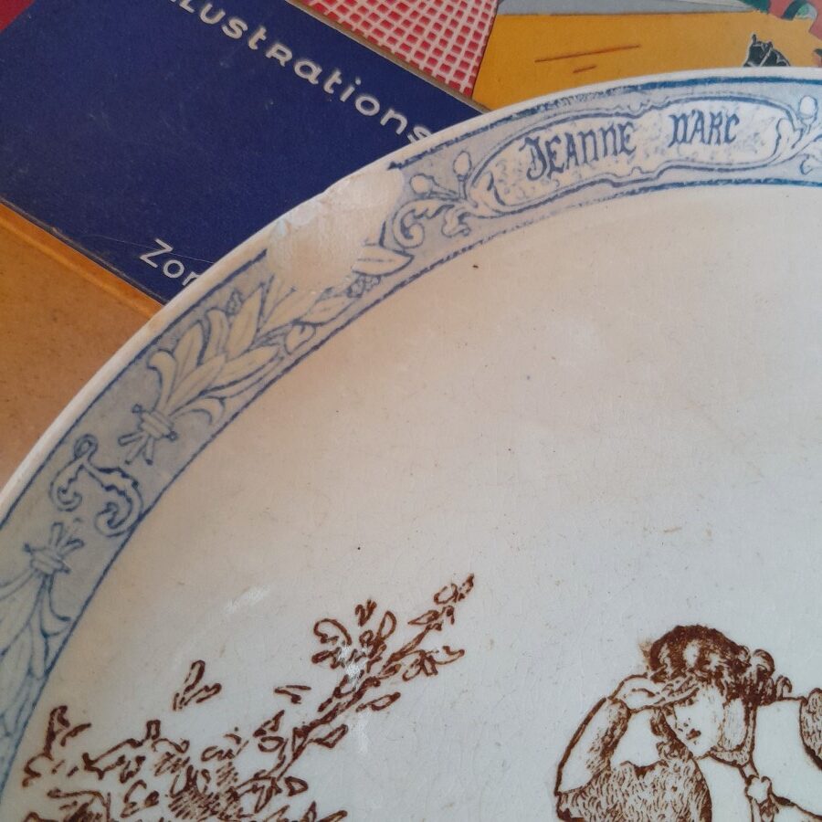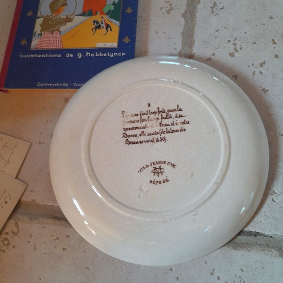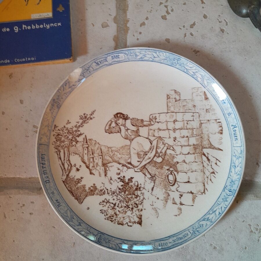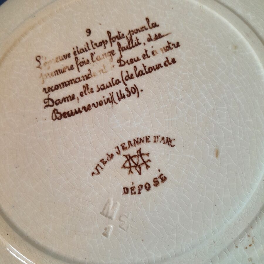 クレイユモントローの刻印が底に入った、ジャンヌダルクの生涯の1シーンを描いた飾り皿です。