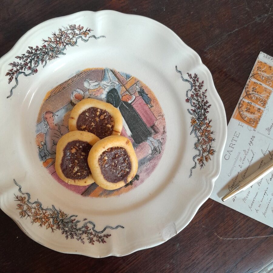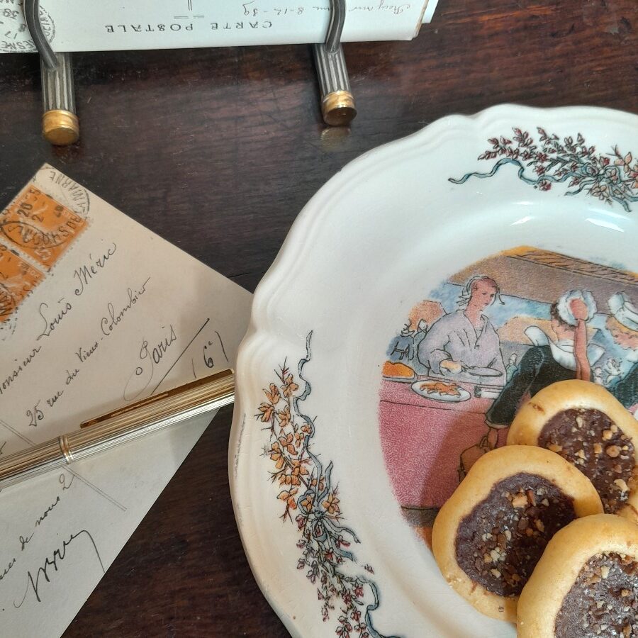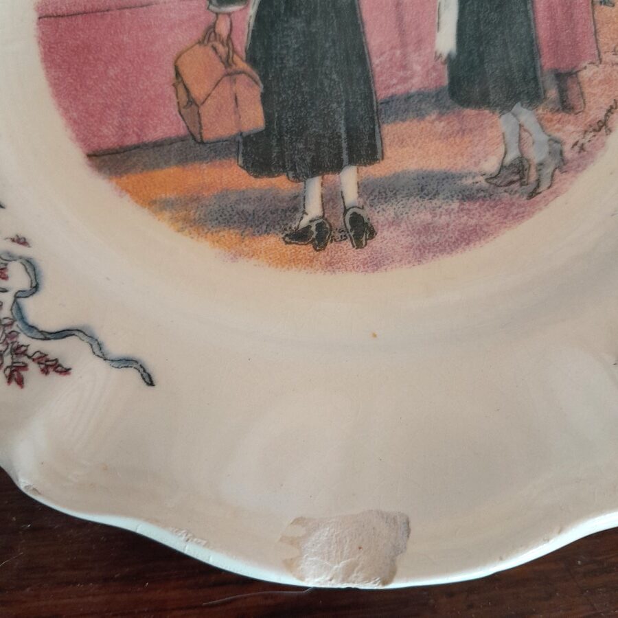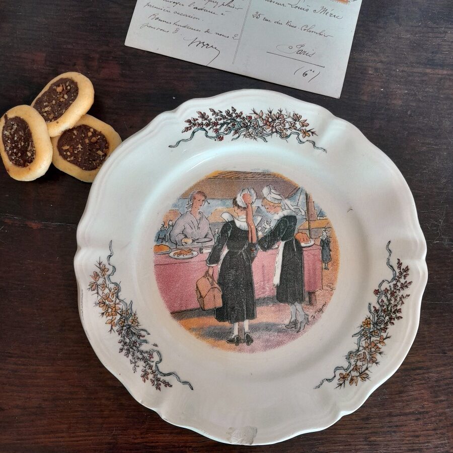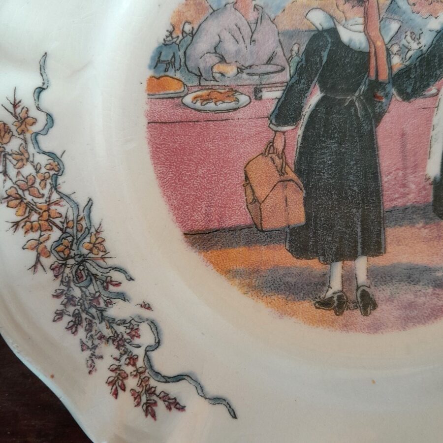 サルグミンヌ窯から、ポンタヴェンの市場と題されたお皿には、ブルターニュの伝統衣装を身につけた女性が市場で買い物をするようすが描かれています。