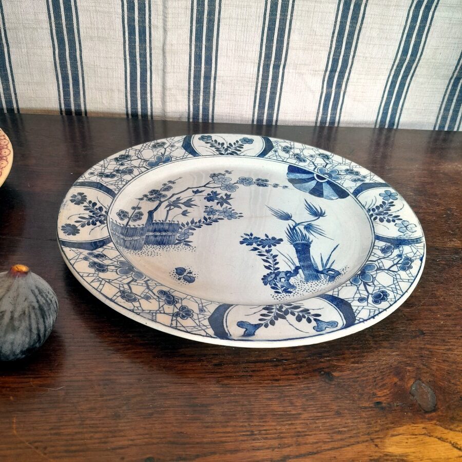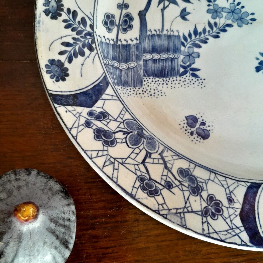 中央にひび割れが入っているほか、目立った傷みはありません。どこか和洋折衷を感じさせるデザインが面白い一品です。お皿一枚につきリネンのトーション一枚をランダムでお付けします。