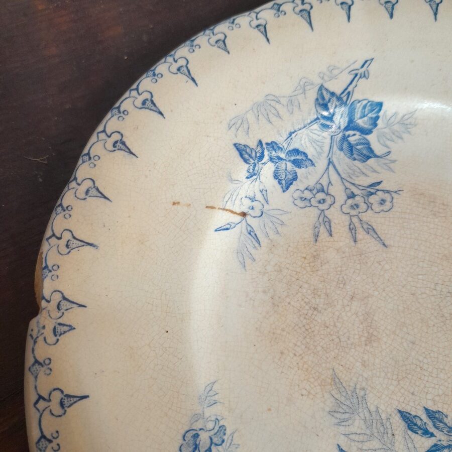 中央に貫入が広がり、その部分は薄く茶色がかっています。プリントはやや濃いめの青。