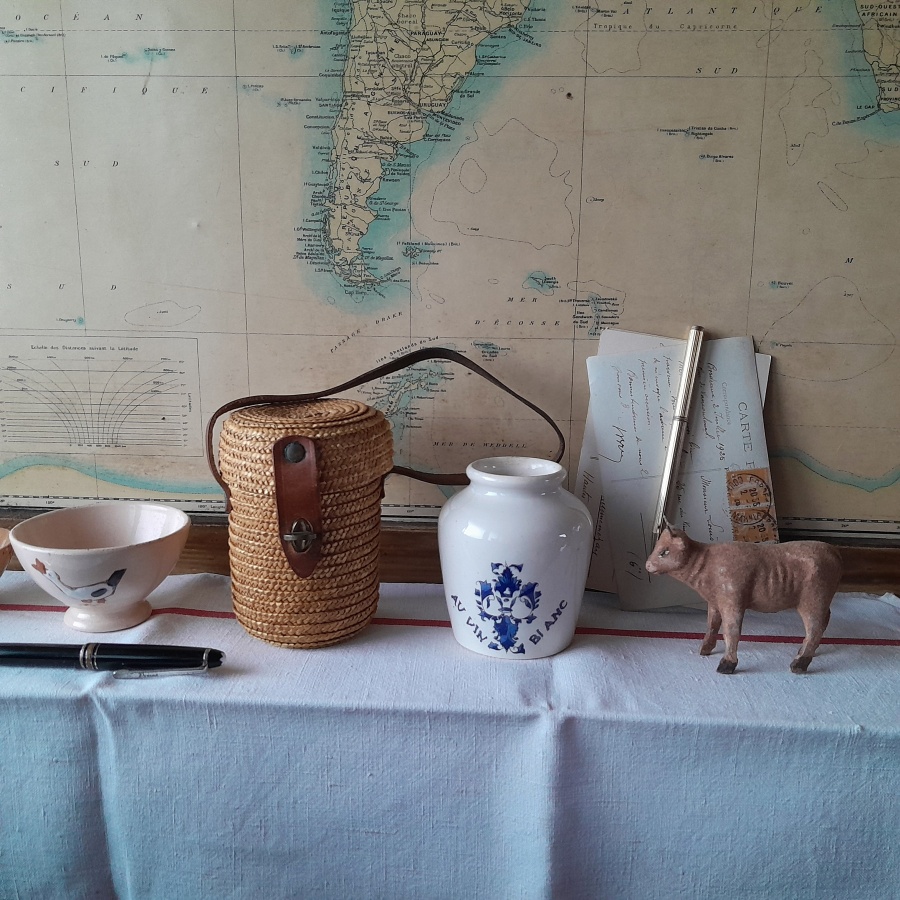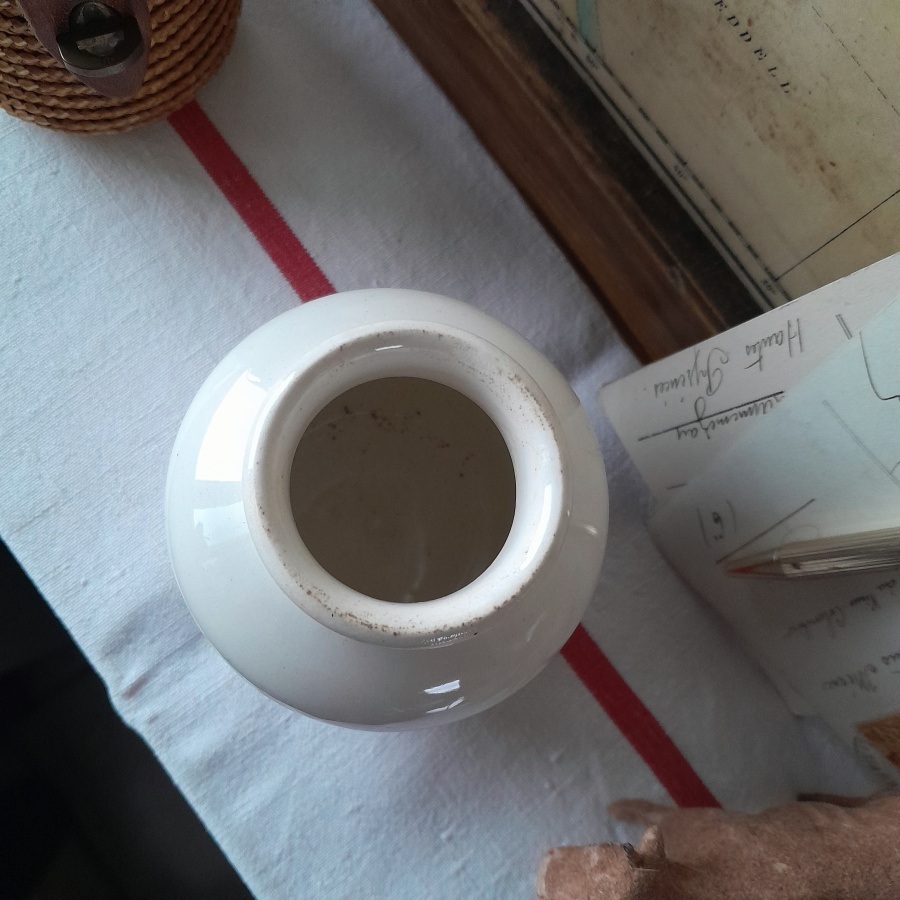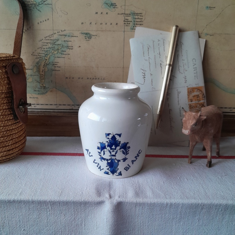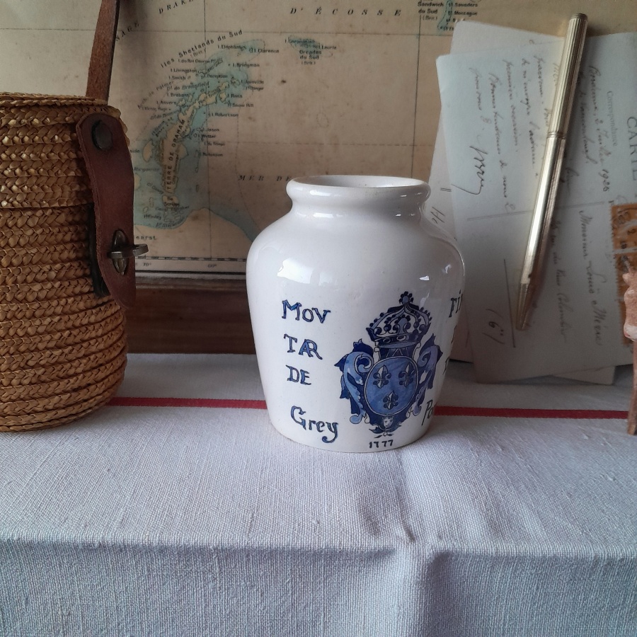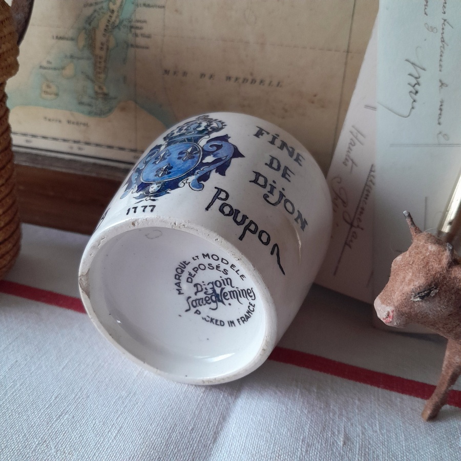 壺製作はサルグミンヌで、厚みがありぽってりとした質感で重さもあります。ほかのマスタードポットに比べて少し小ぶりで、手書き文字とエンブレムのデザインと色合いも素敵です。多少の欠けや汚れなどが見られますが、状態は良好。