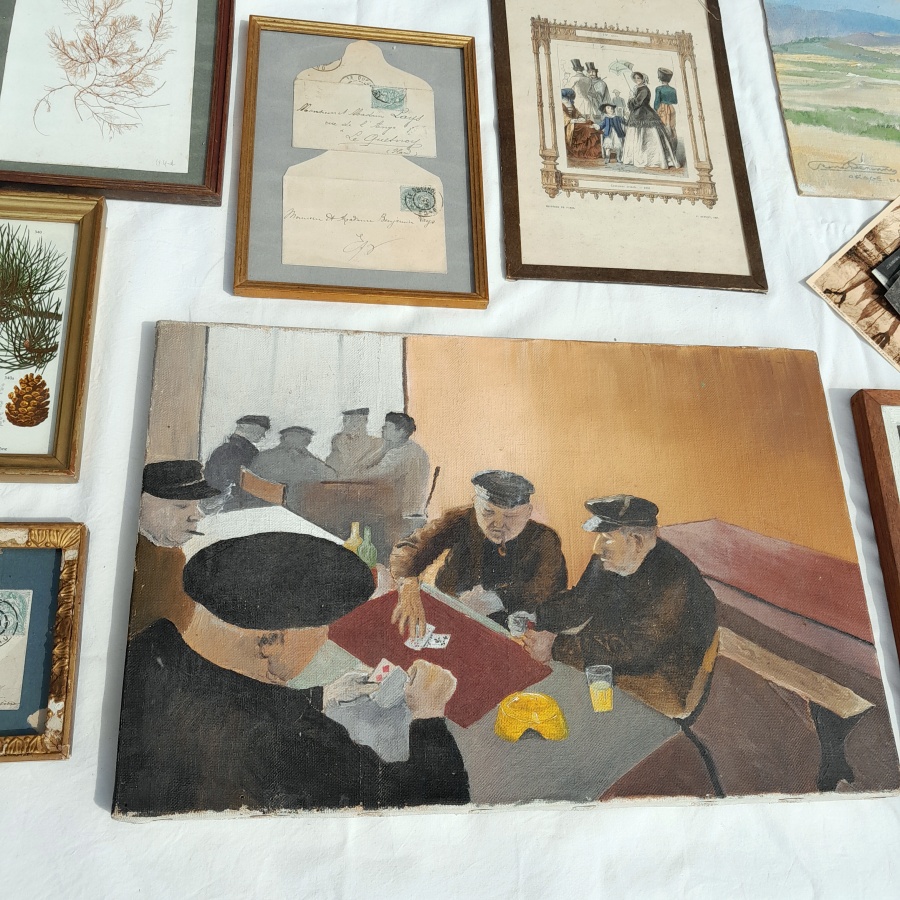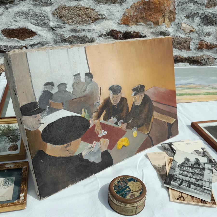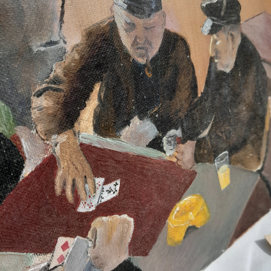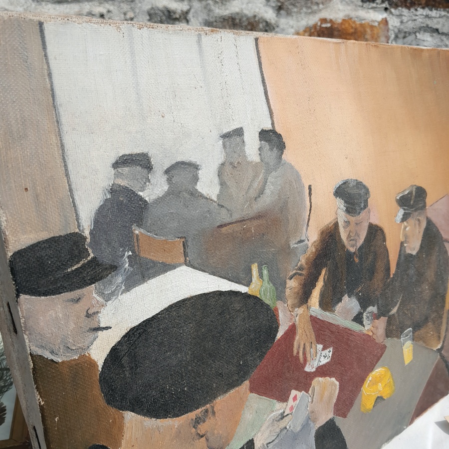 どこかの海辺のカフェでカード遊びにいそしむ男性たちを描いた油絵です。