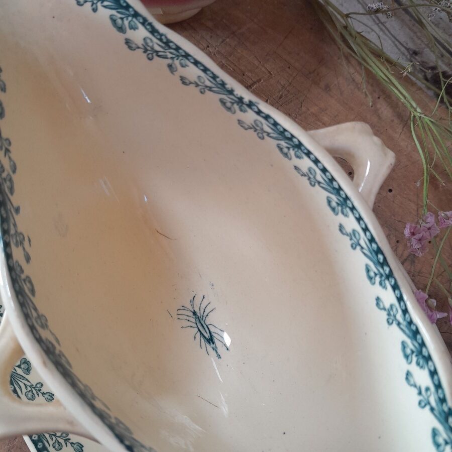 装飾的な持ち手、側面のドレープのようなラインなど、細部までこだわったデザインが窺えます。全体に草花のモチーフが散らばり、底には足の長い虫がひそんでいます。底の刻印から、19世紀末頃に作られたものと思われます。