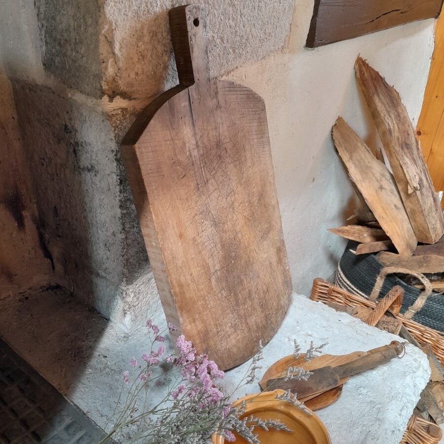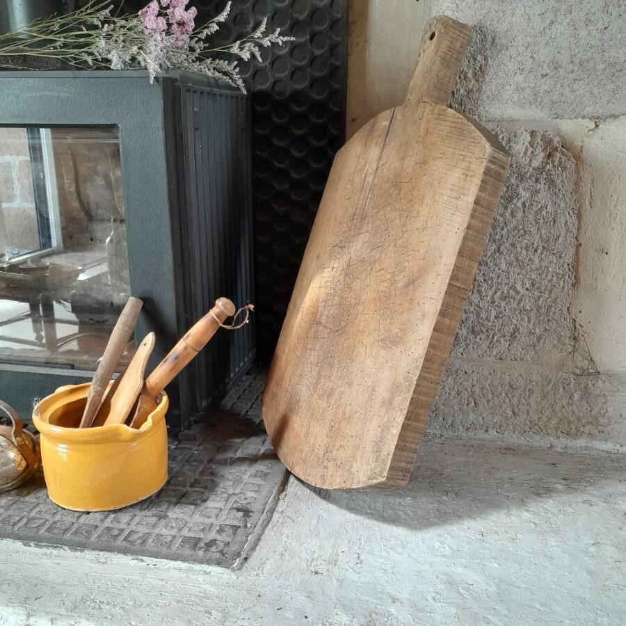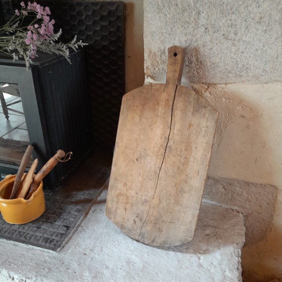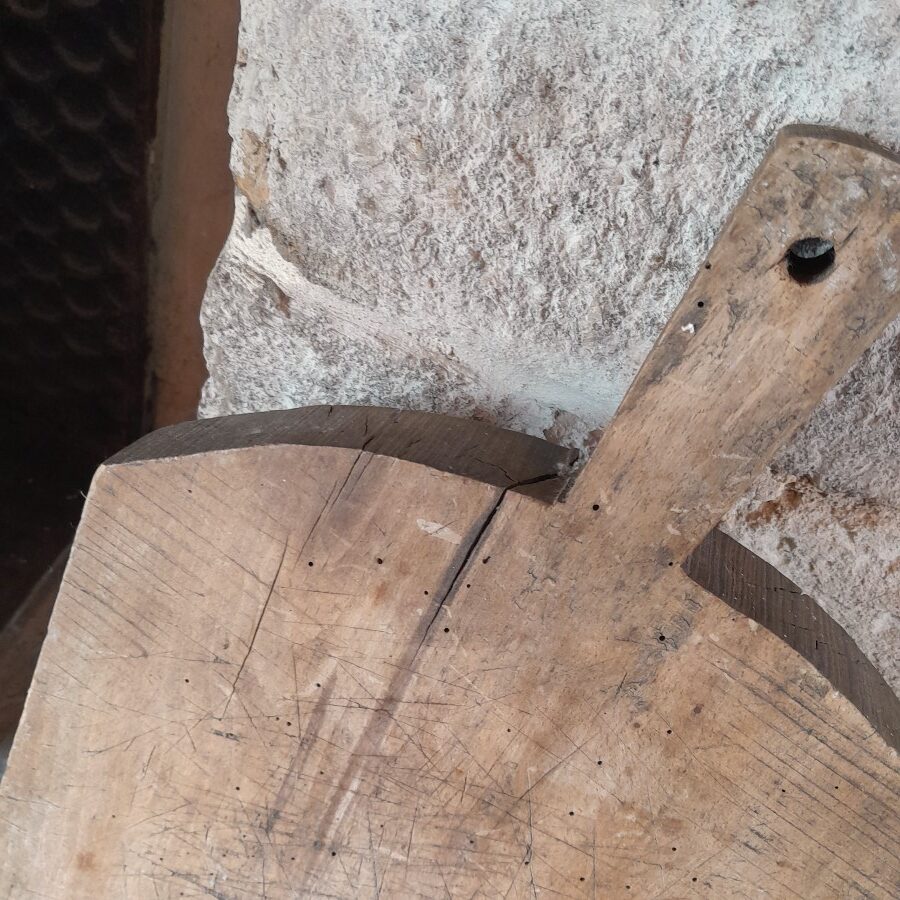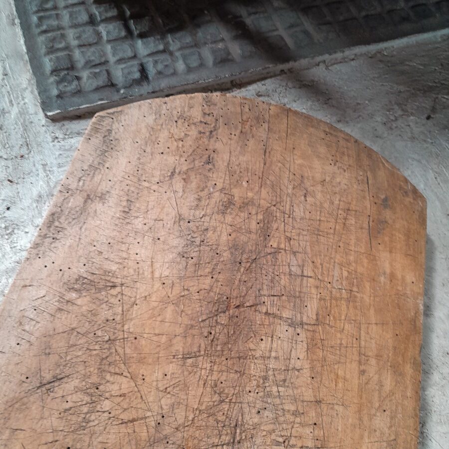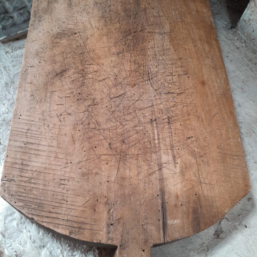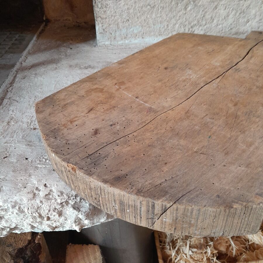 片面には包丁を使った跡がたくさん入っており、もう片面には大きなひびが入っています。が、厚みがあるため早々には割れそうにありません。キクイムシによる穴がたくさん見られますが、木くずが出てくるようすは現在のところ無いようです。