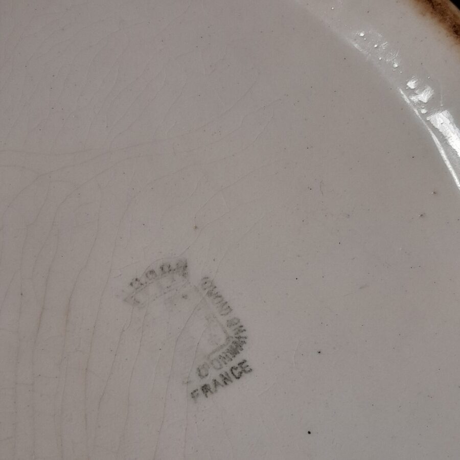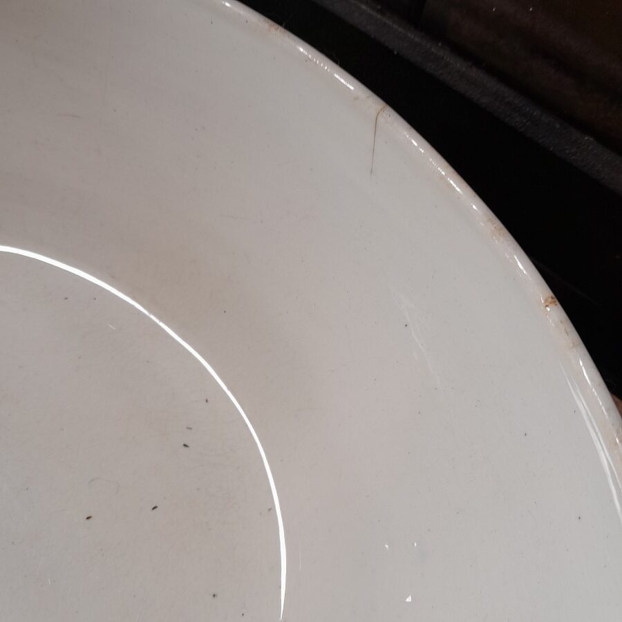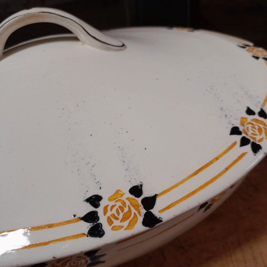 楕円形のやさしい形とシンプルな薔薇のモチーフ、落ち着いた色合いで、かなりの大きさですが圧迫感を感じさせません。表面はなめらかでツヤがあり、底にはうすく刻印が見られます。貫入、ちいさなひびが数か所、茶ばみなどが見られますが、全体的にとてもきれいな状態です。