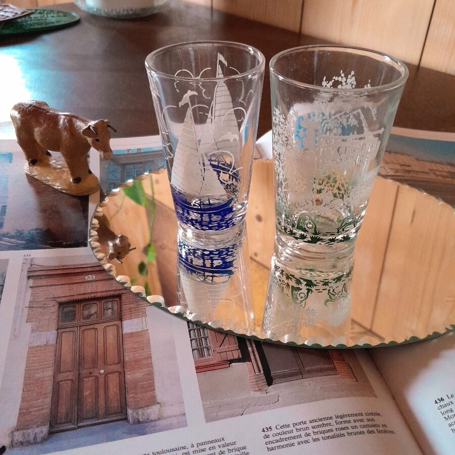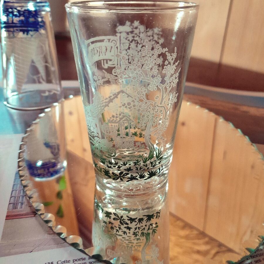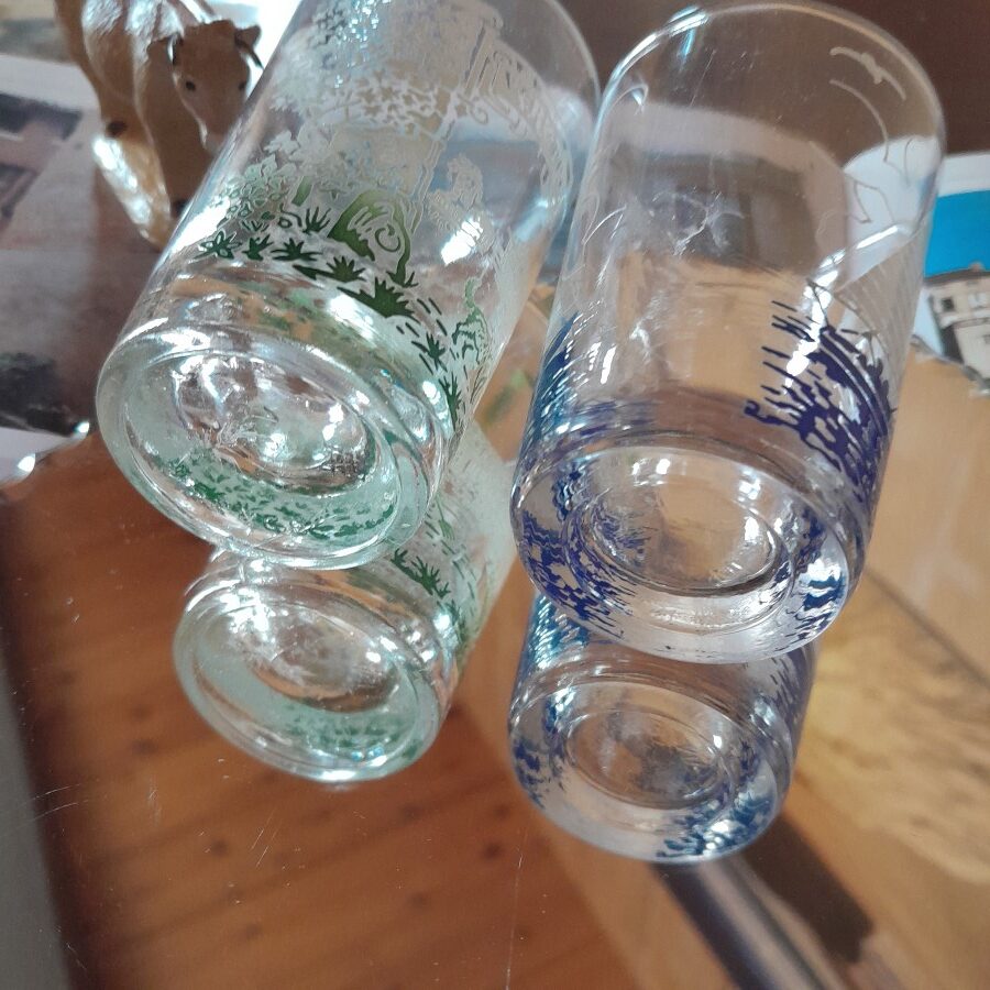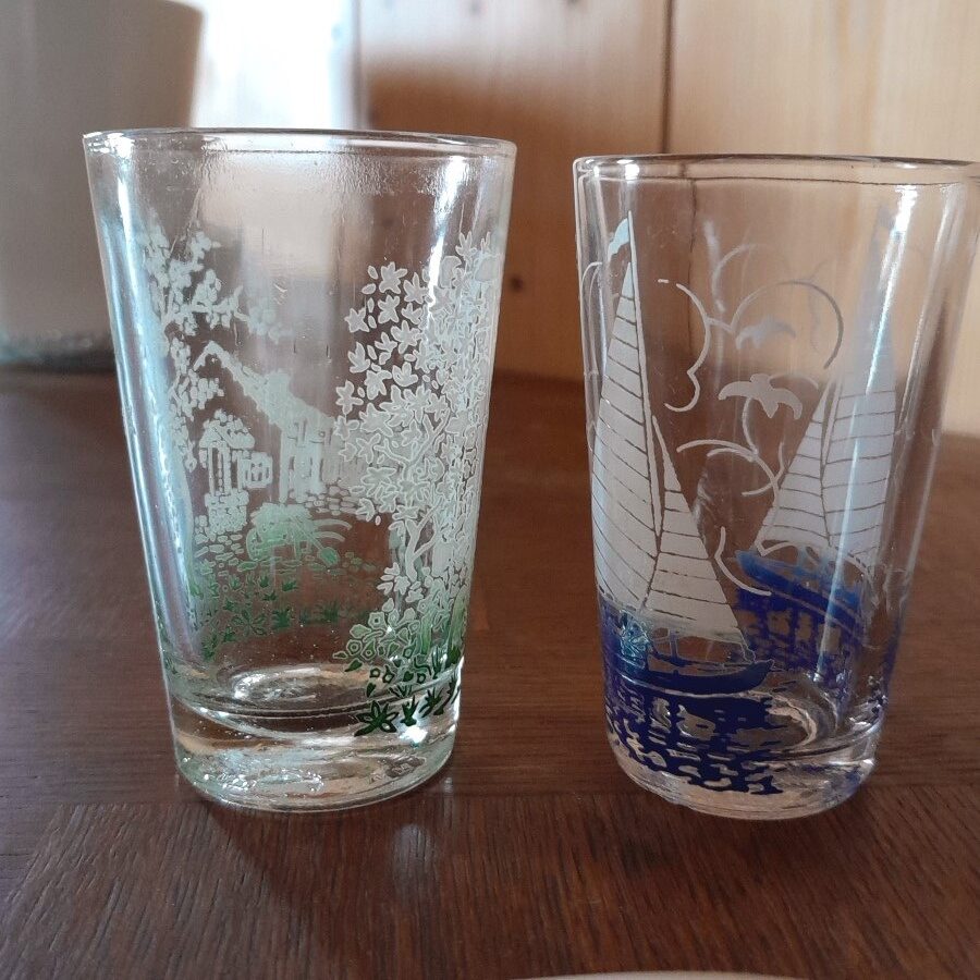 緑っぽい方は田舎の家と庭、青い方は海を走るヨットが描かれています。緑の方の底にはフランス製という刻印があります。ガラスにはしっかりとした厚みがあり、作成時の気泡や着色のかすれなども見られます。底に多少の割れやひびのような跡がありますが実用に問題はありません。