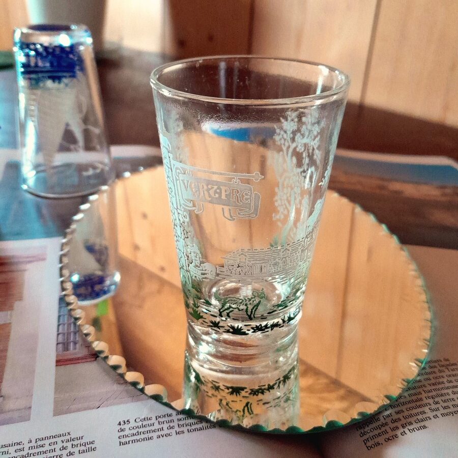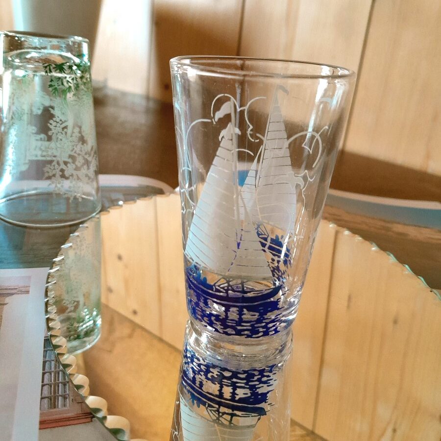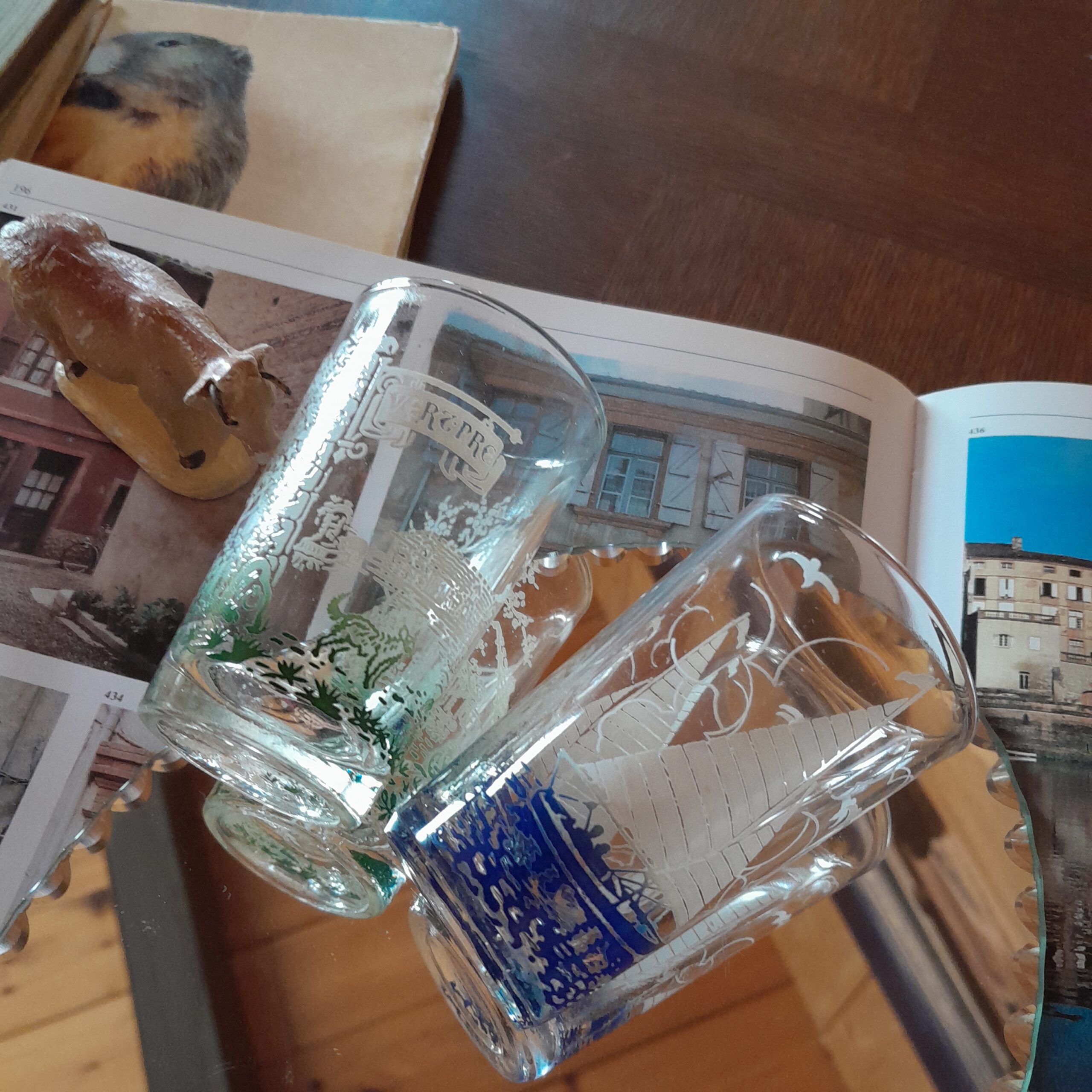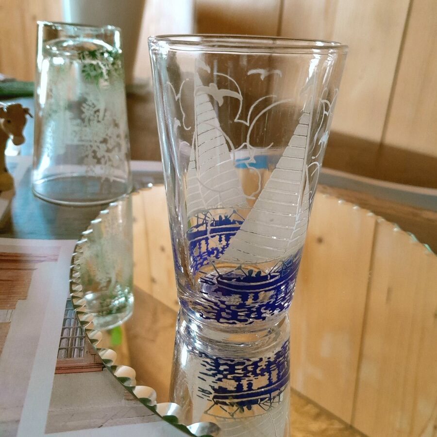 緑っぽい方は田舎の家と庭、青い方は海を走るヨットが描かれています。緑の方の底にはフランス製という刻印があります。ガラスにはしっかりとした厚みがあり、作成時の気泡や着色のかすれなども見られます。底に多少の割れやひびのような跡がありますが実用に問題はありません。