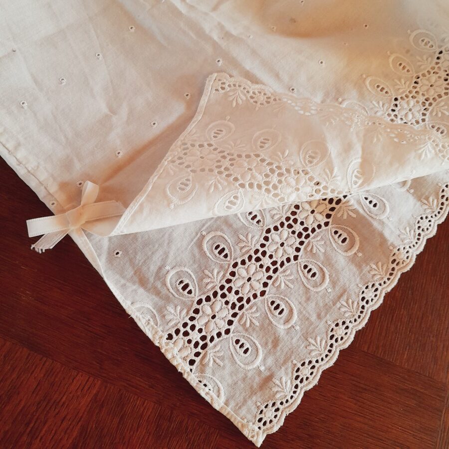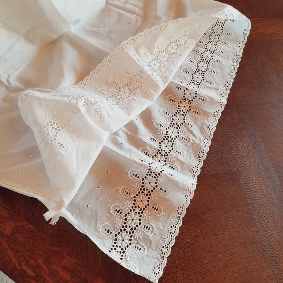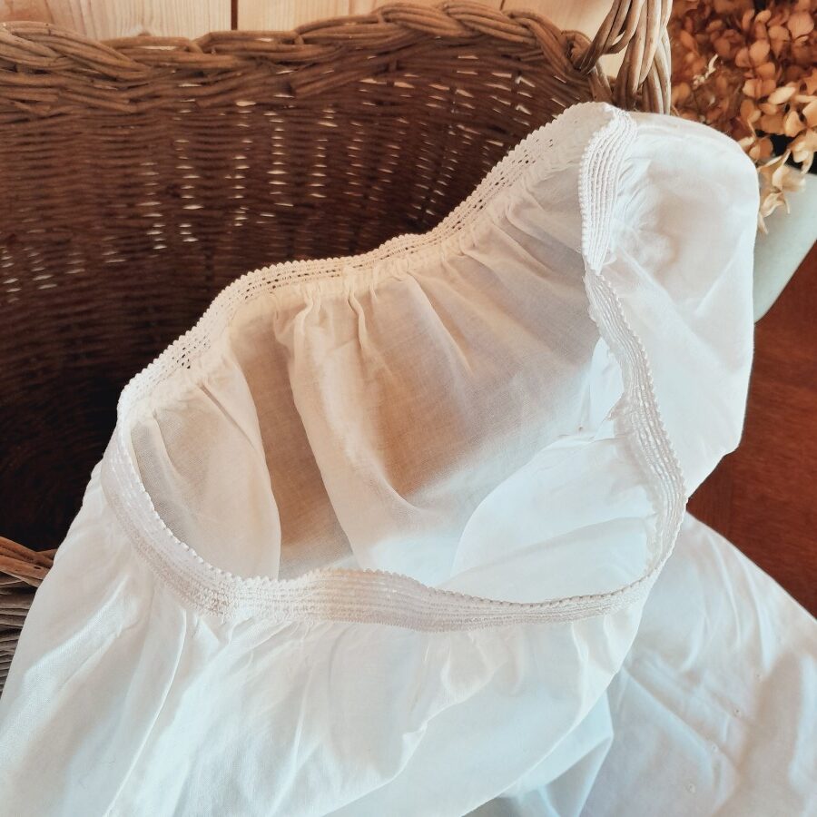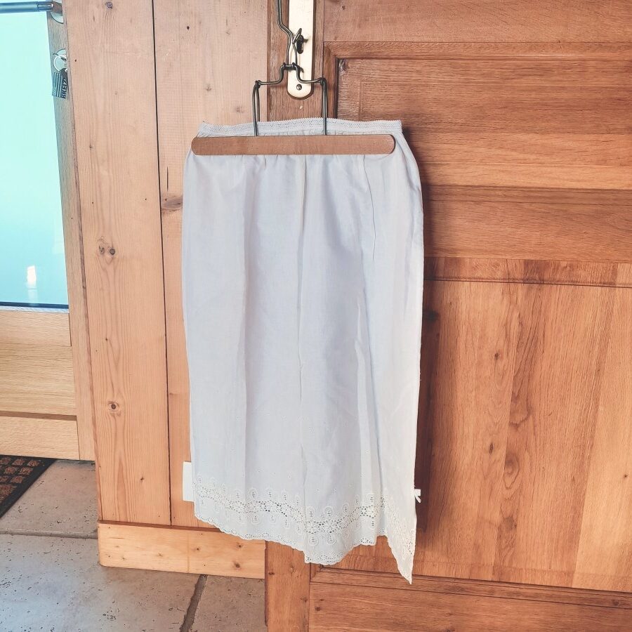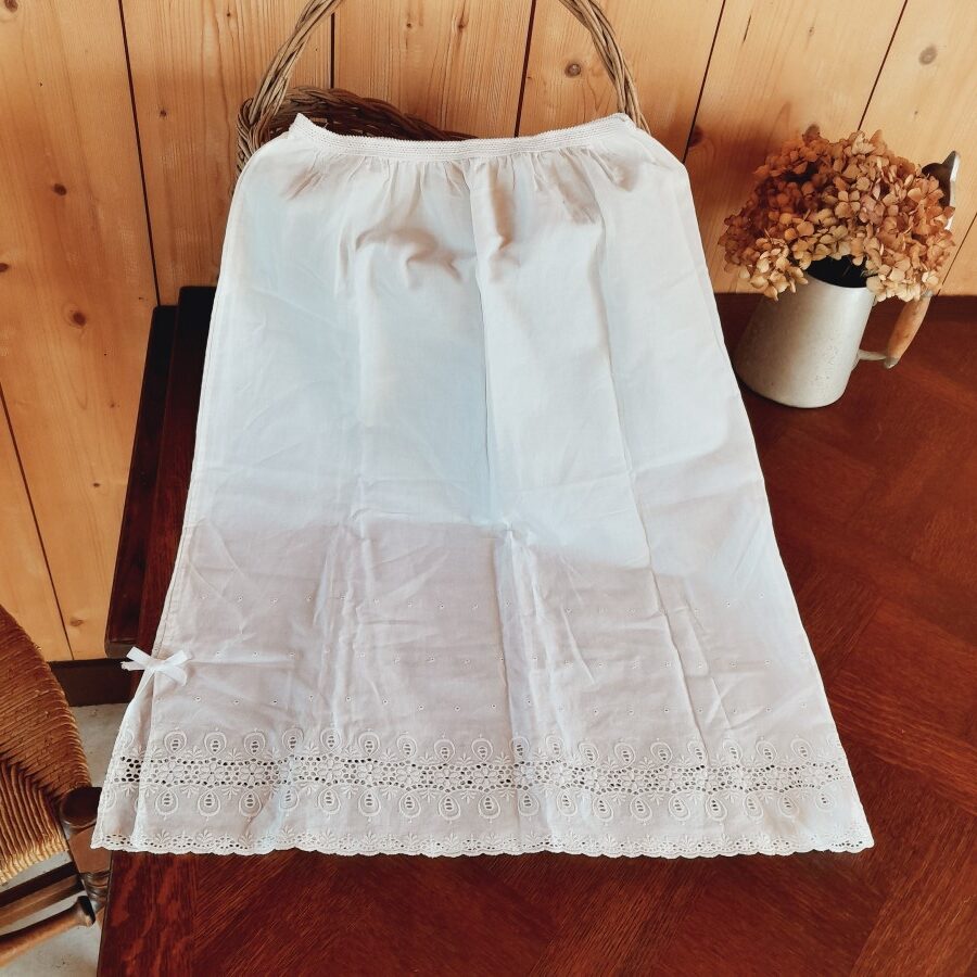 機械刺繍と思われ、比較的新しいお品のようです。裾に透かし刺繍が施され、さらに穴あきドットが3列その上に並び、スリットが一か所入っています。ウエスト部分は伸び縮みします。多少の茶ばみが見られますが目立った傷みはなく、とてもきれいな状態。160㎝で着用するとひざ下までくる長さです。