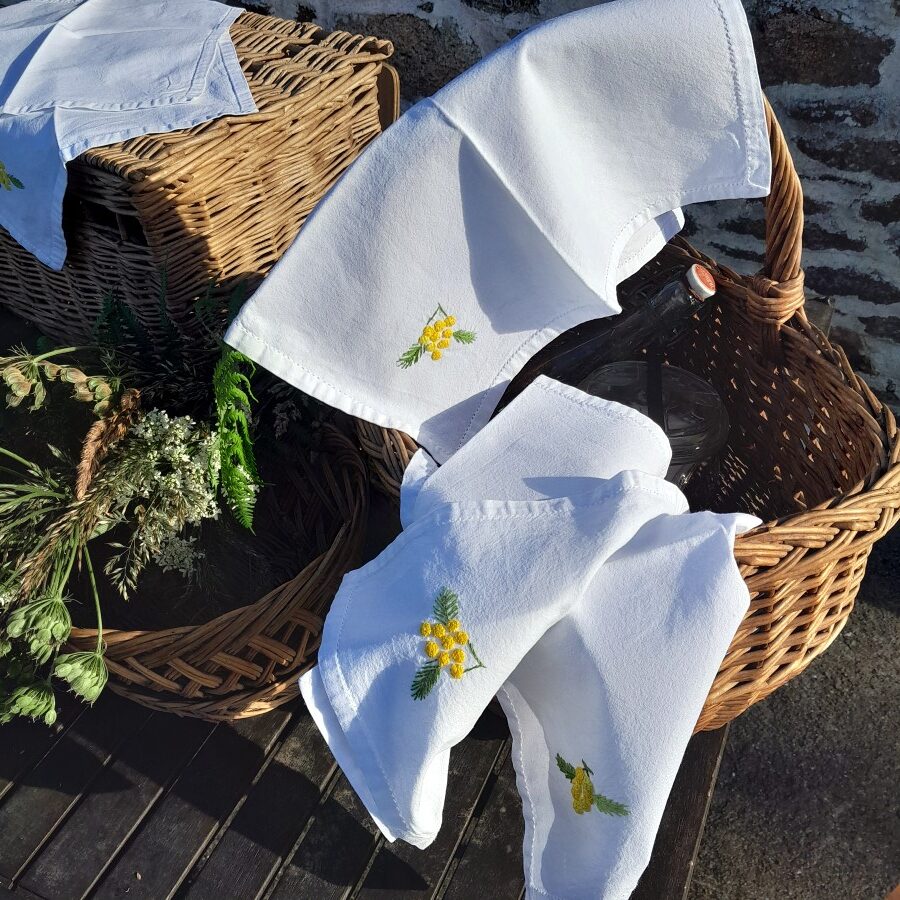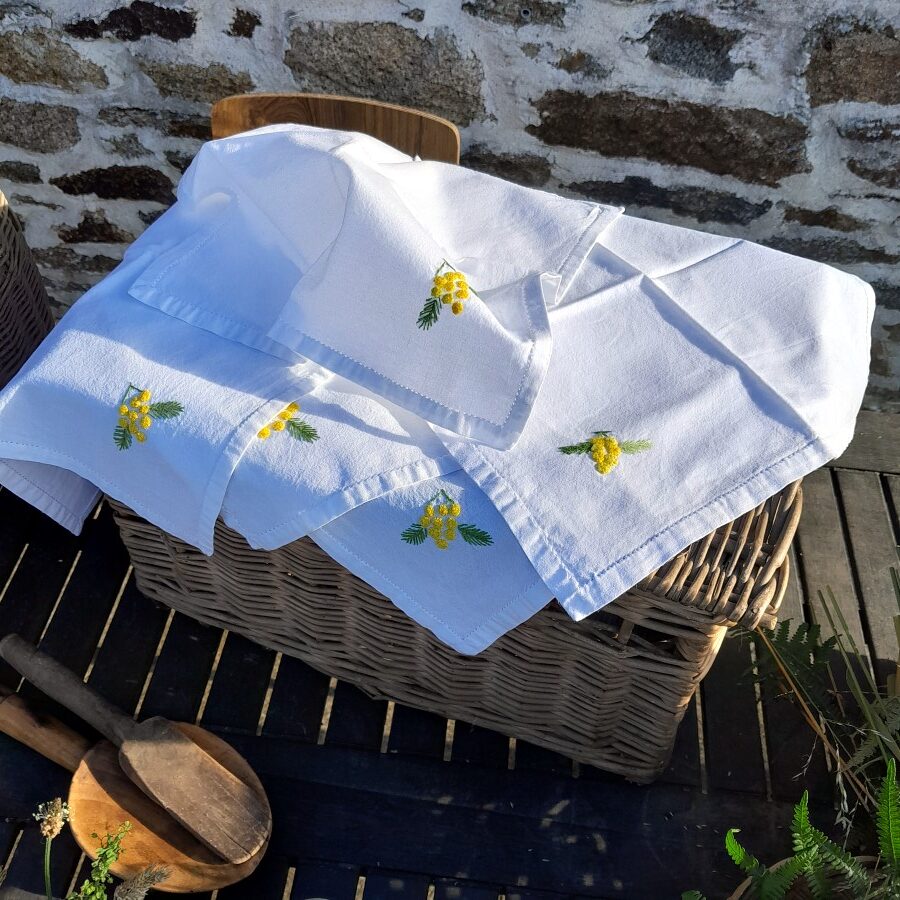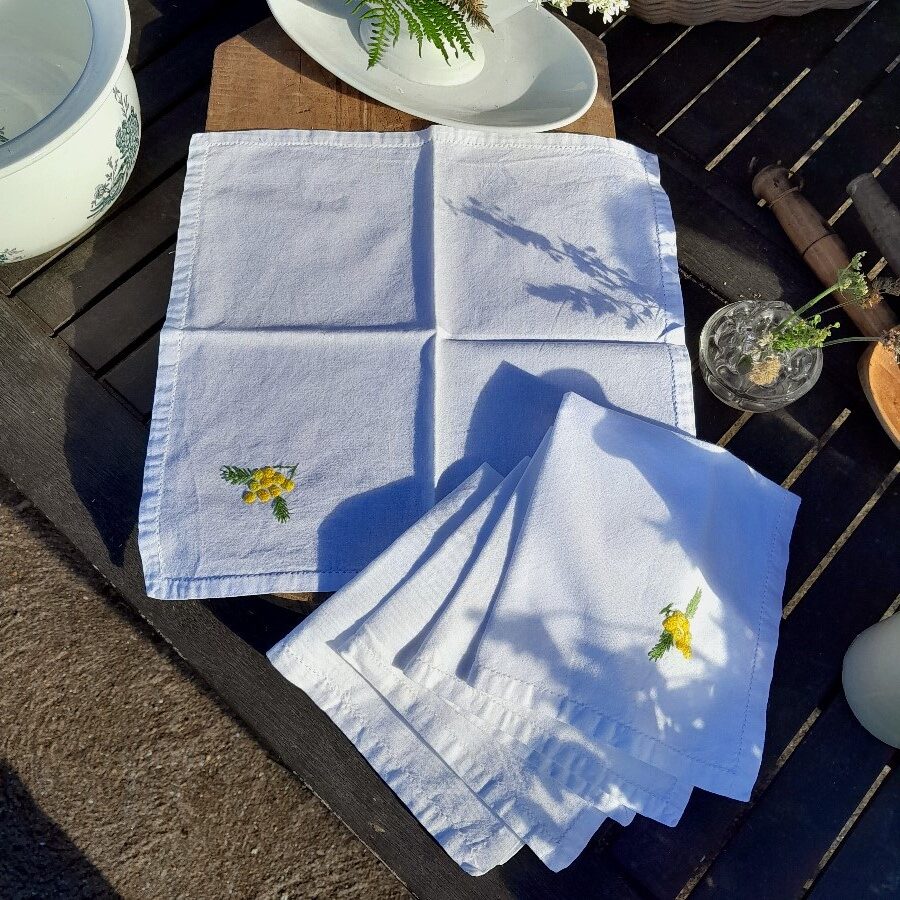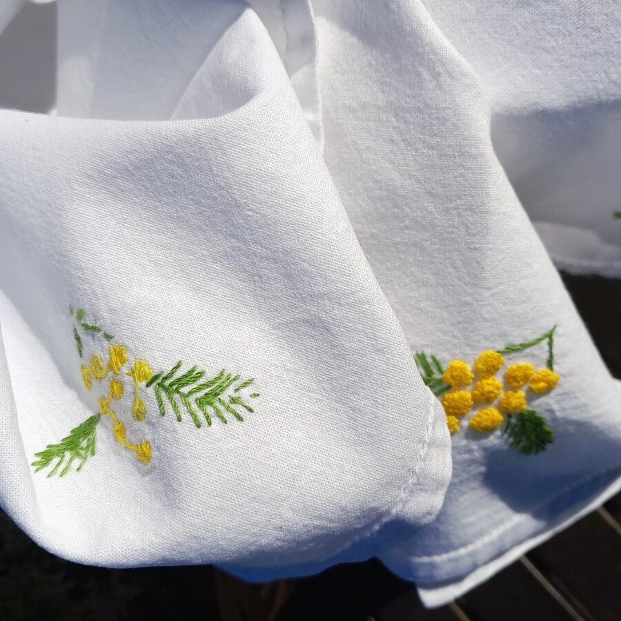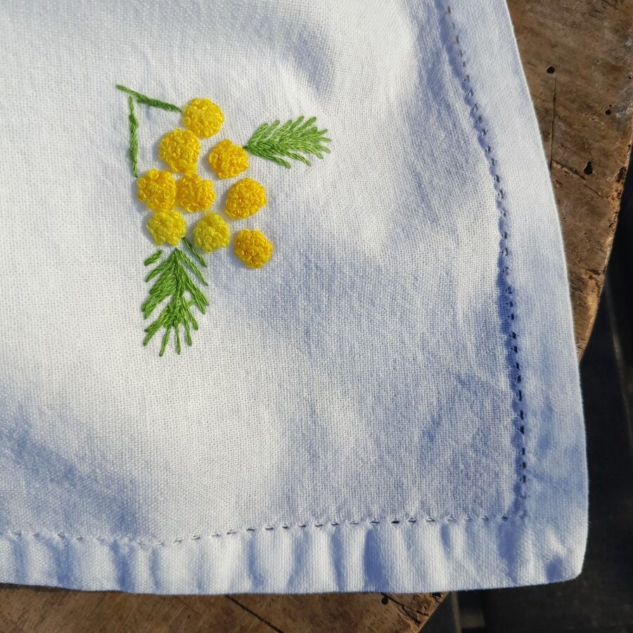 手刺繍でミモザの花がワンポイントで入り、四辺の縁には点線のように穴が開けられて縫われた、丁寧な作り。布には張りがあり目が細かく、さらりとした手触りです。いずれも多少の汚れはありますが、全体的にきれいな状態です。
