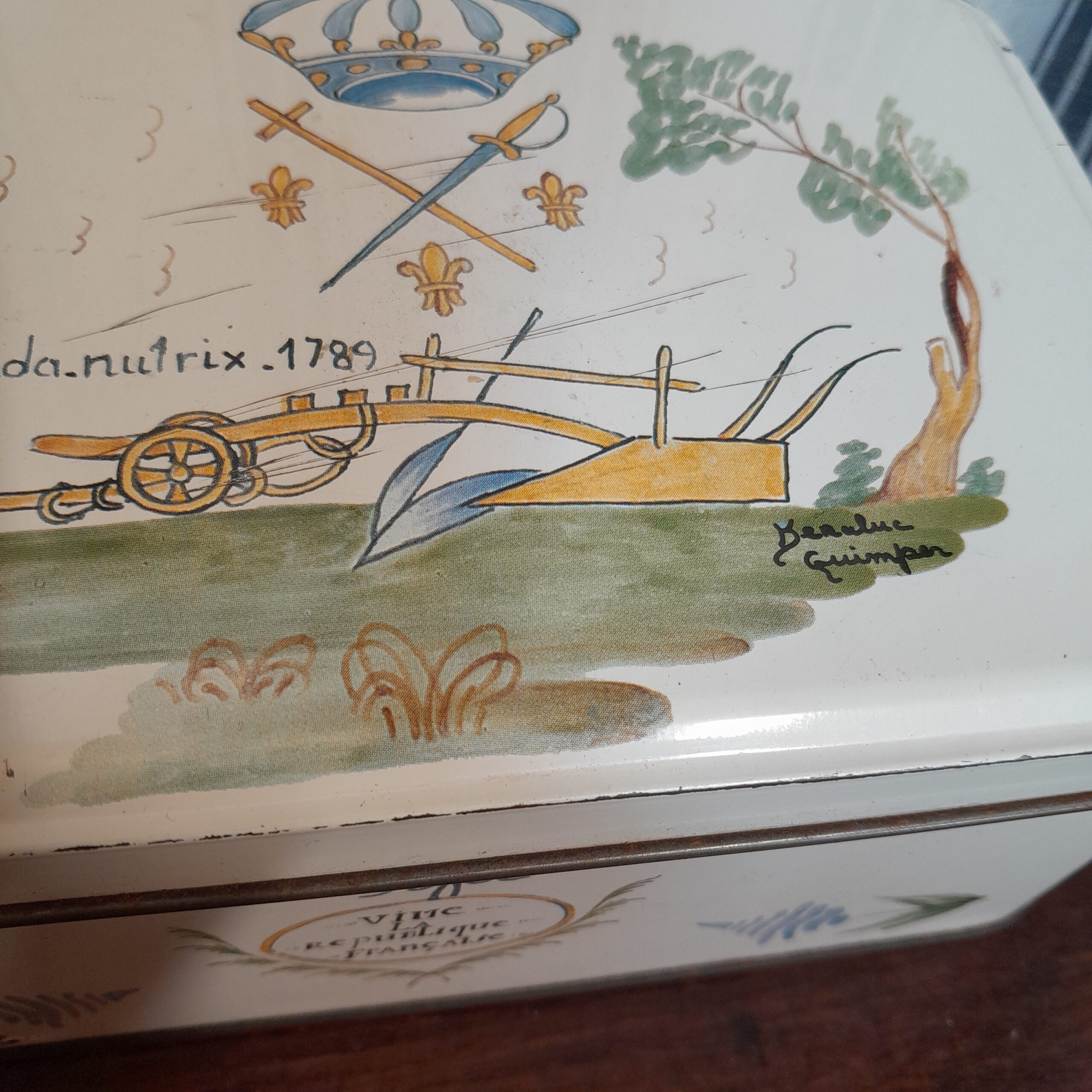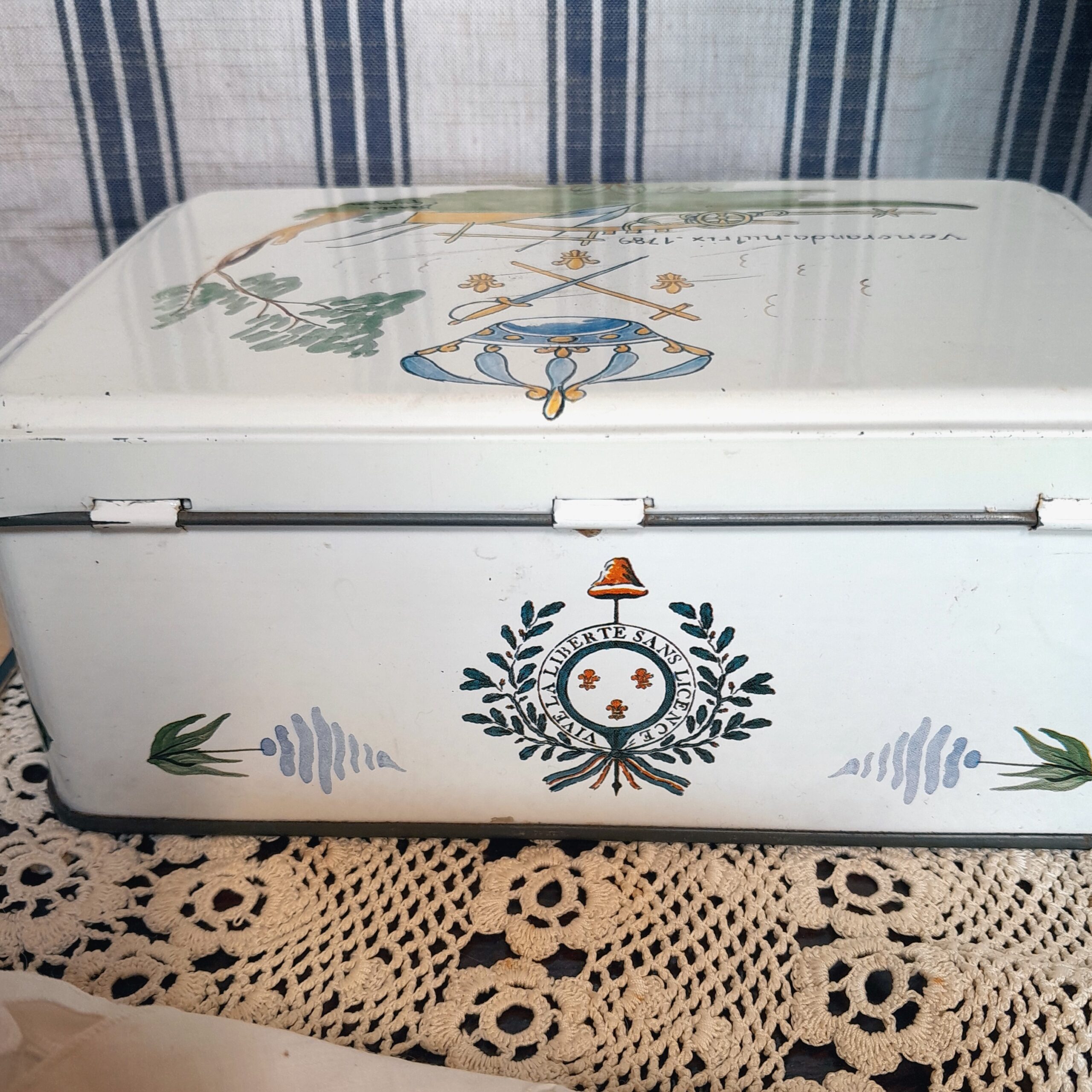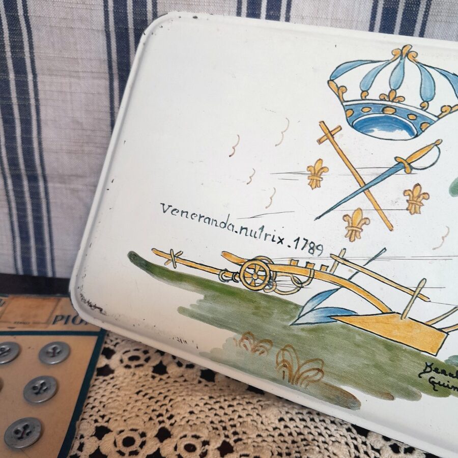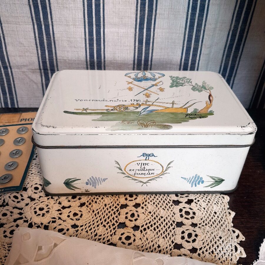 缶はフランス中央部 Nevers の陶器メーカーのものと思われるデザインで、手描きのイラストと自然な淡い色遣いがクラシカルな印象です。ふたの開閉は比較的スムーズで、置いた時に少しカタカタします。セットの内容は写真を参照ください。以前もしくは現時点でサイトにてご紹介しているお品も含まれています。