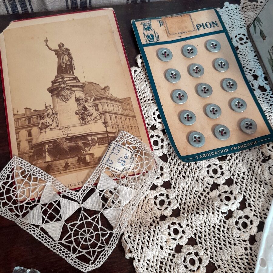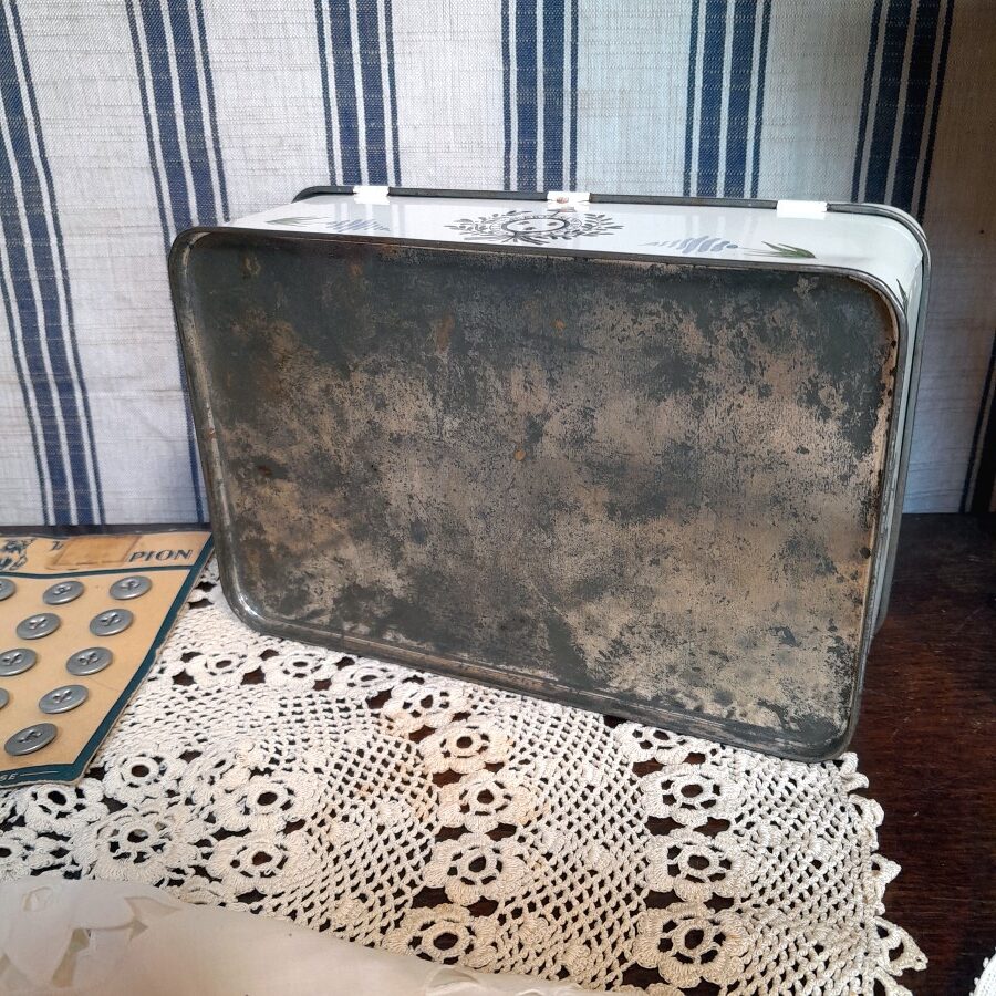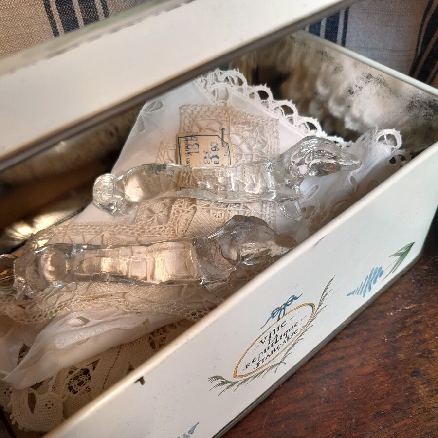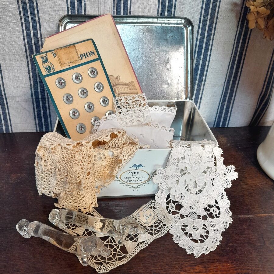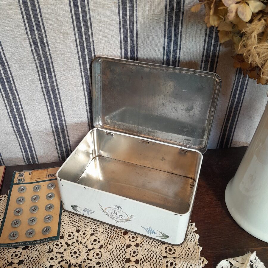 缶はフランス中央部 Nevers の陶器メーカーのものと思われるデザインで、手描きのイラストと自然な淡い色遣いがクラシカルな印象です。ふたの開閉は比較的スムーズで、置いた時に少しカタカタします。セットの内容は写真を参照ください。以前もしくは現時点でサイトにてご紹介しているお品も含まれています。