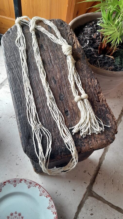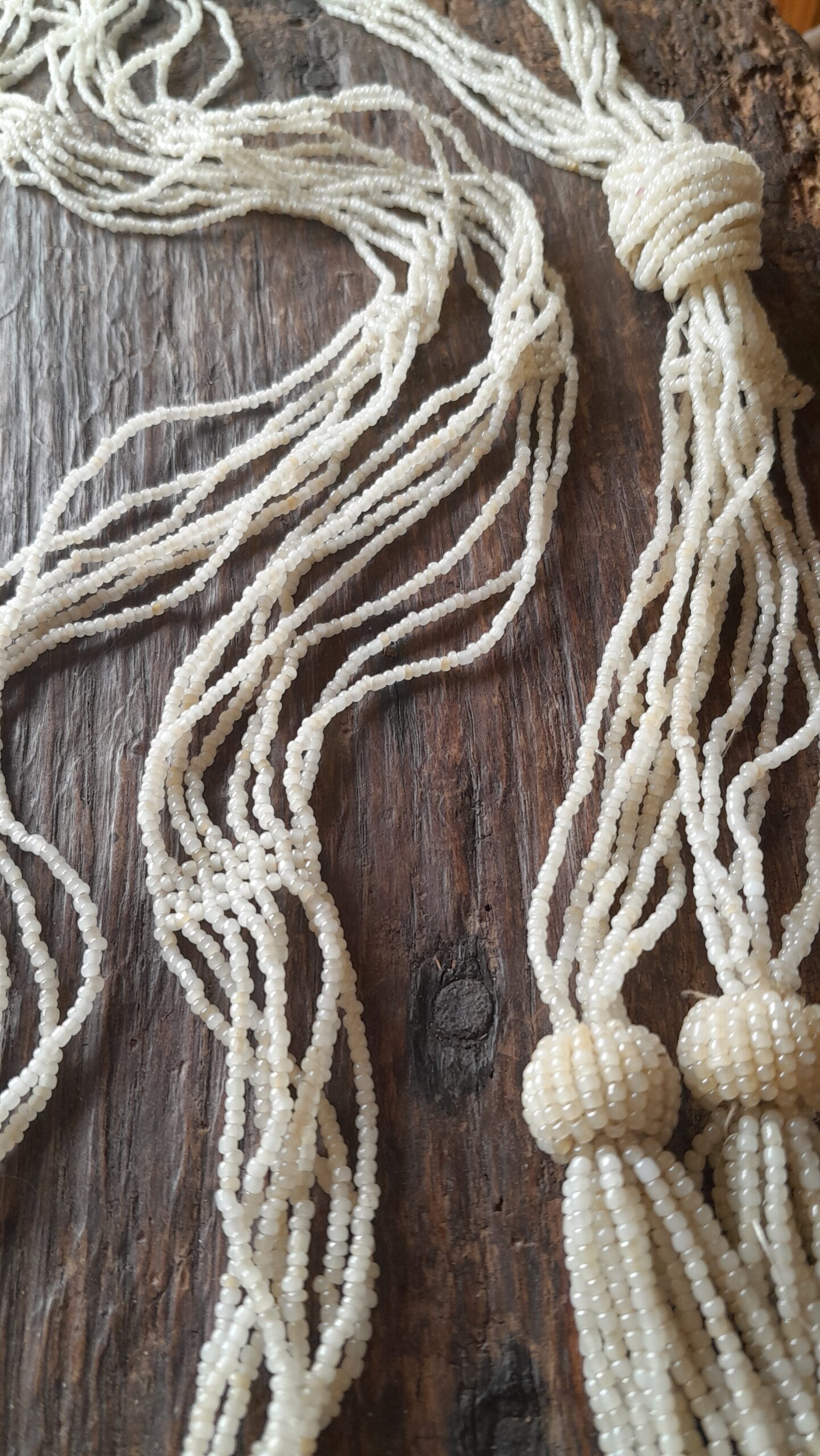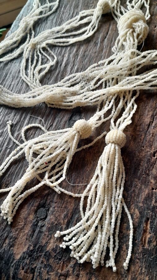 白いビーズを長く繋げて束にし、所々でつなぎ合わせたりボール状にまとめたりと、細かい手仕事のあとが伺えるお品です。束の一部が切れている箇所があります(玉結び済み)。経年によりややグレーがかった色味になっています。