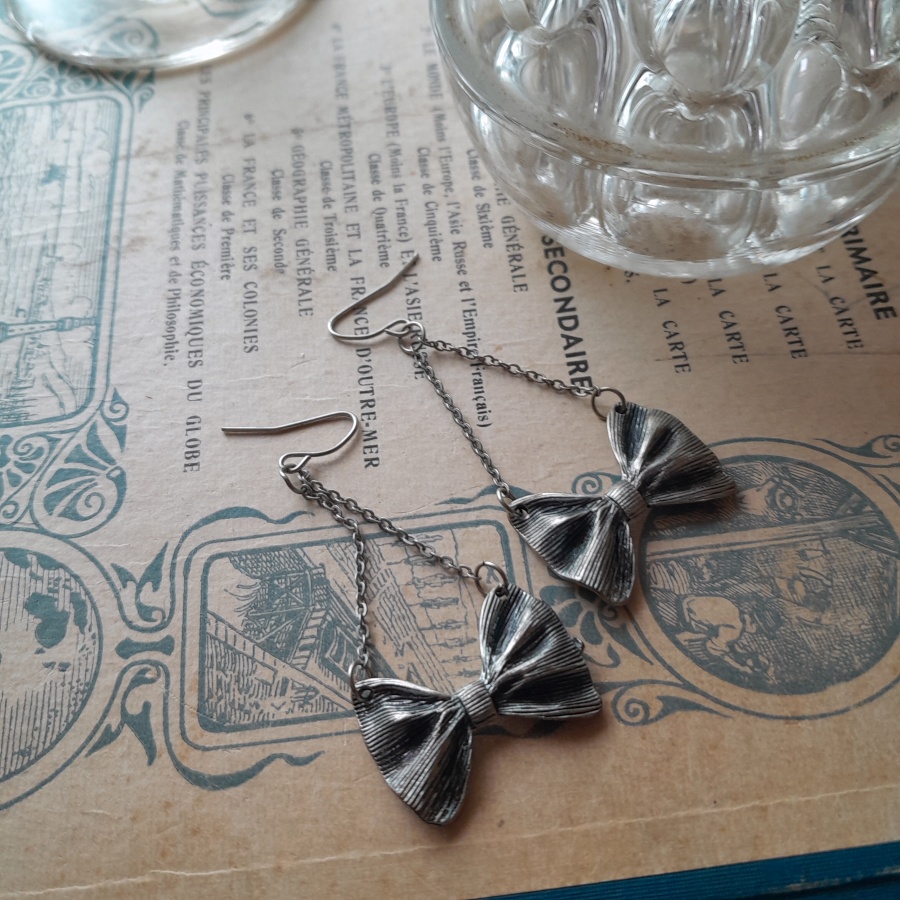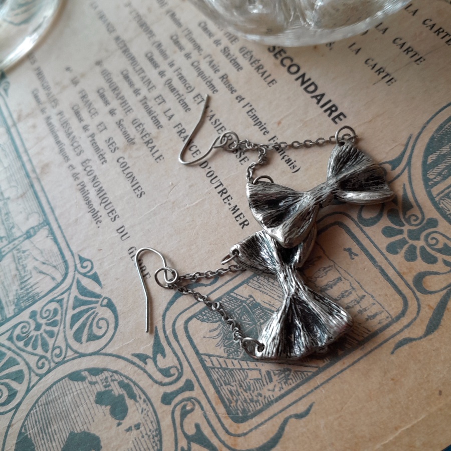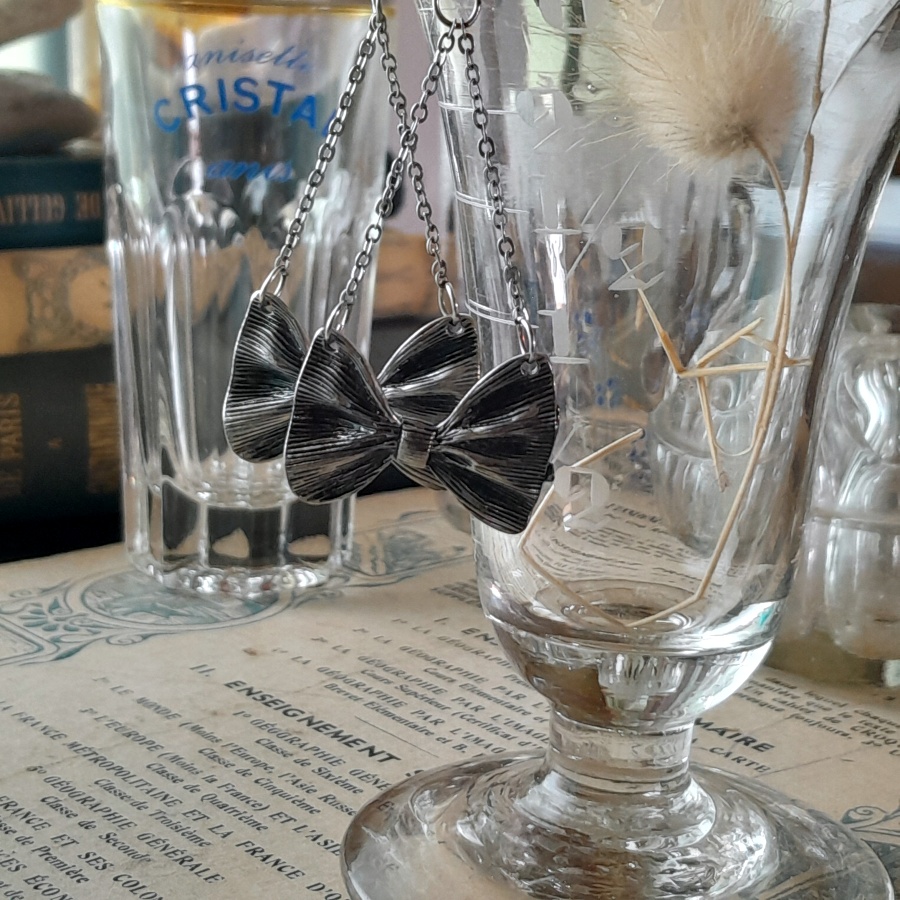 ストライプ柄でリボンのしわも細かく表現され、銅版画のような表情です。古いお品ではないため状態も良好です。前後左右に自由に揺れ、長さもあるので存在感のあるお品です。
