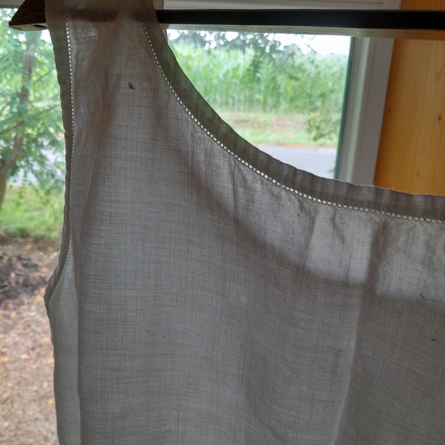 生地はやや薄手で、裏が少し透けて見える厚さです。ストンとまっすぐに落ちるくらいの張り具合です。目立った傷みはなく、きれいな状態です。