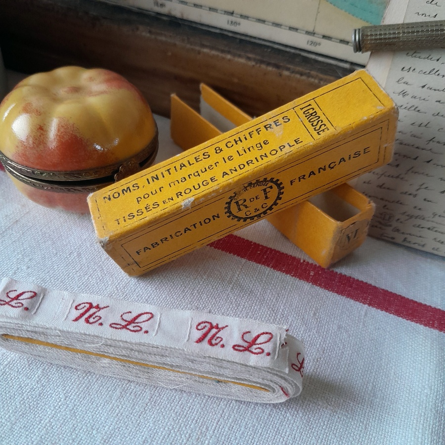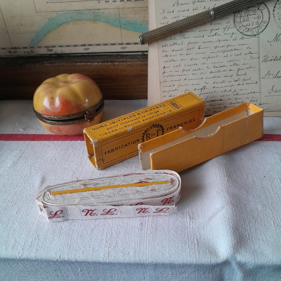 リボン巻きの芯がそのまま残っており、箱も一面が無くなっているほかは大きなダメージはありません。手仕事のおともに。