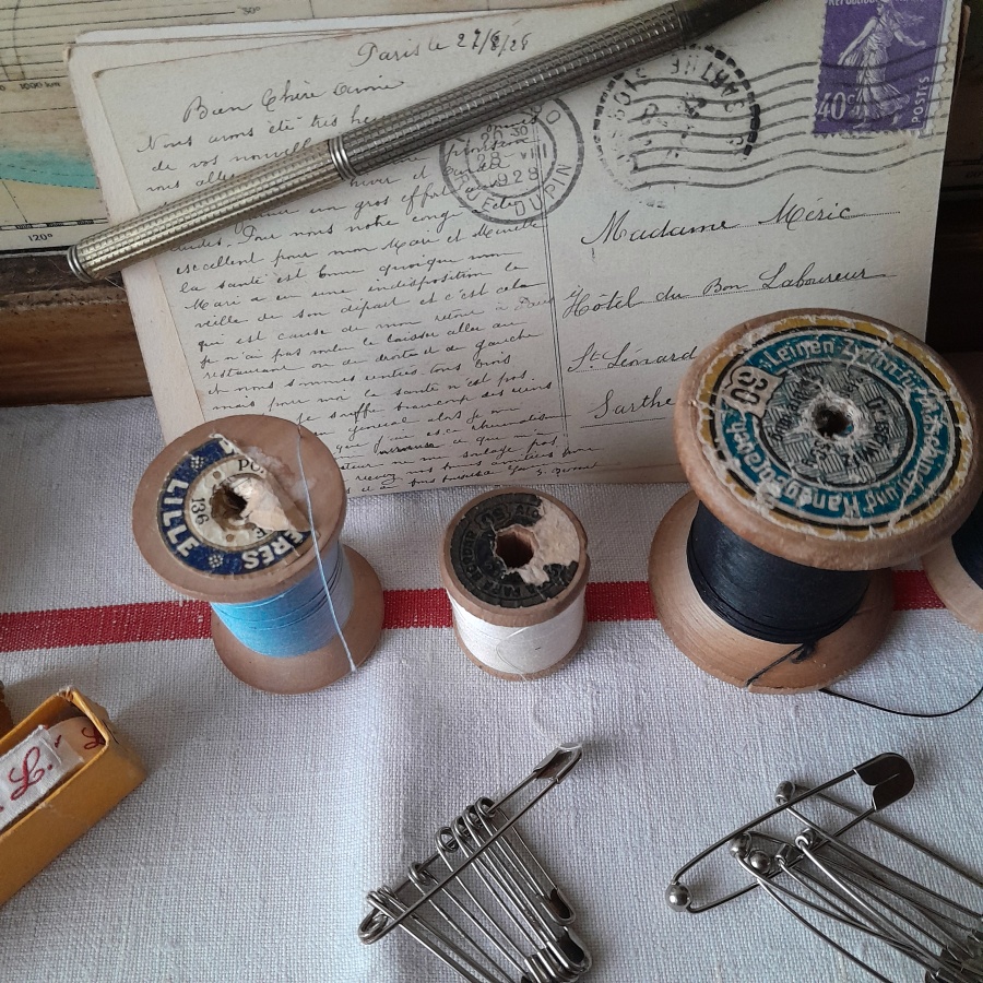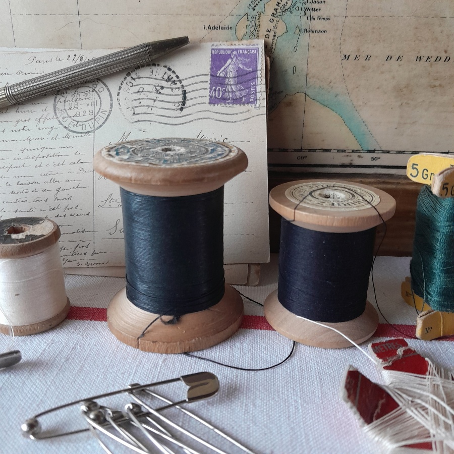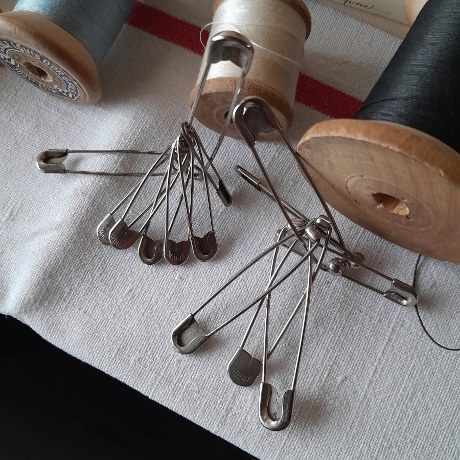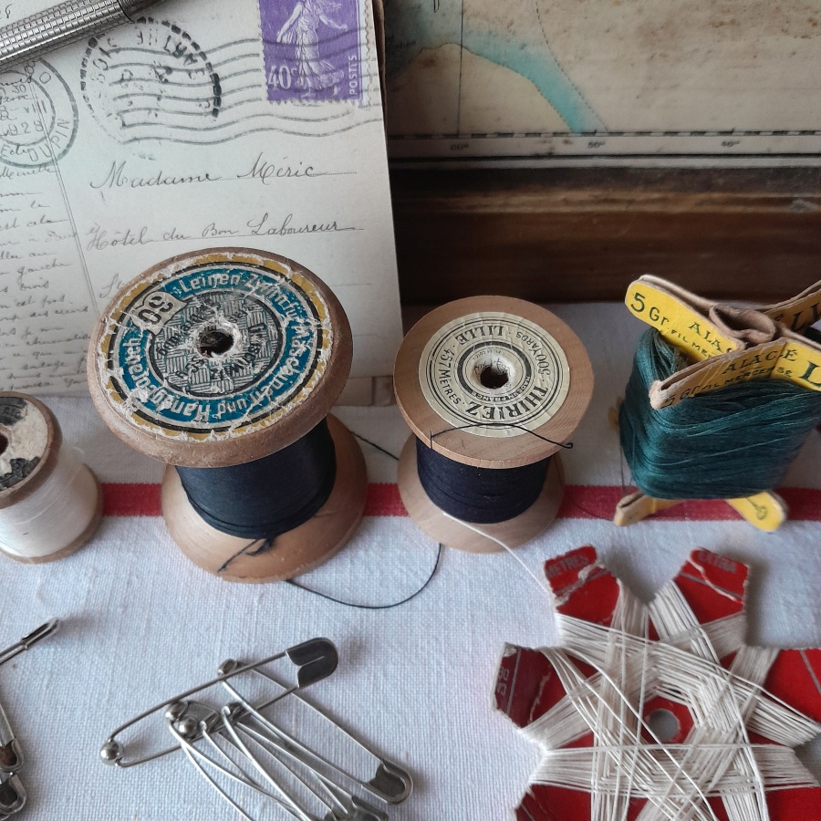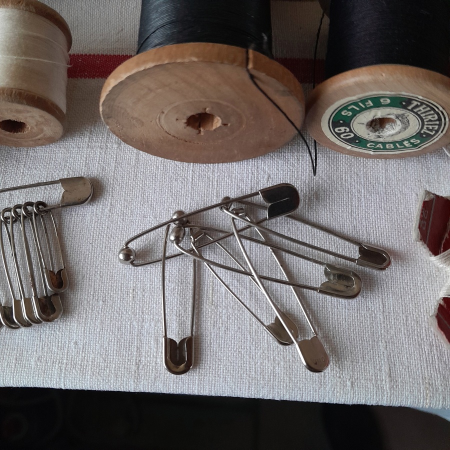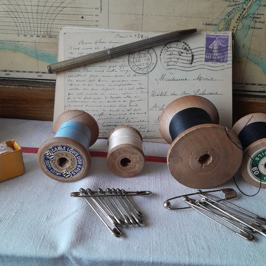 木の糸巻き、紙の糸巻き、レトロデザインの安全ピンなどをまとめたセットです。
