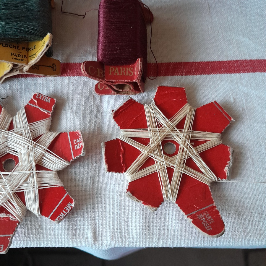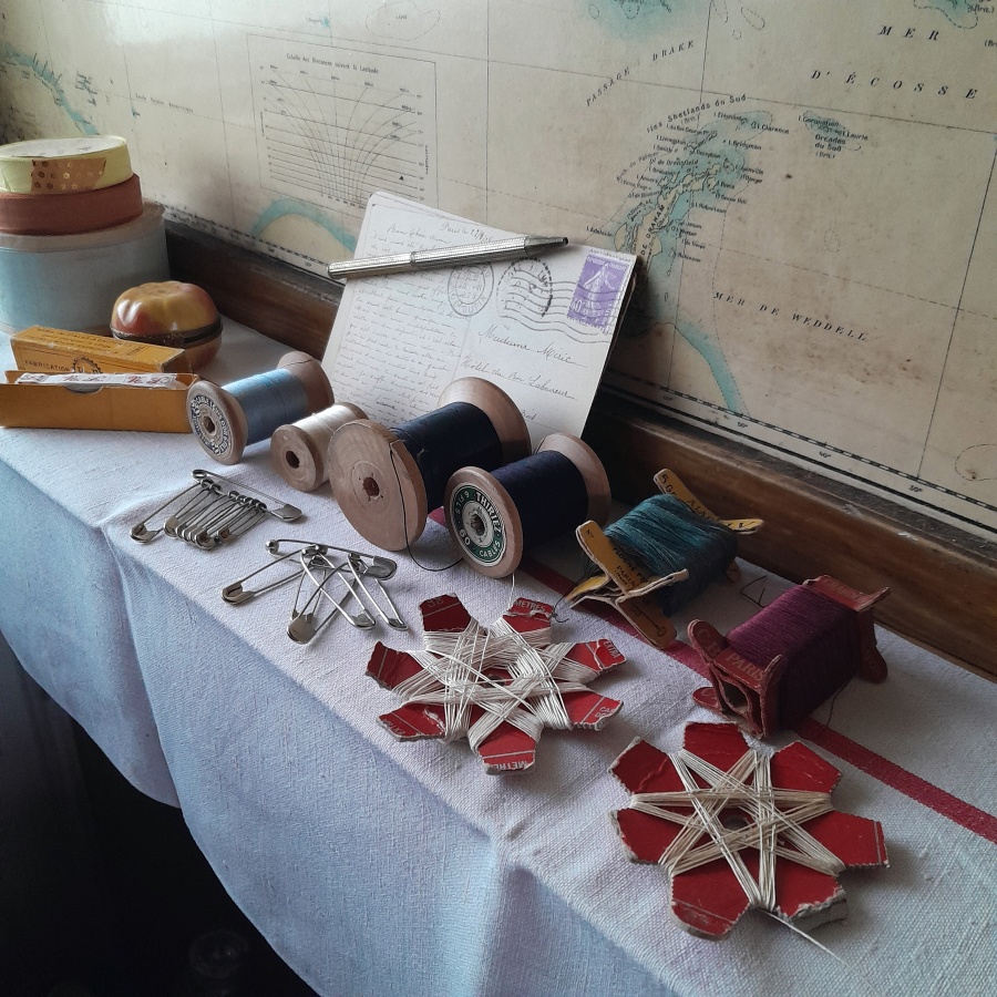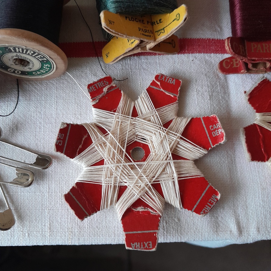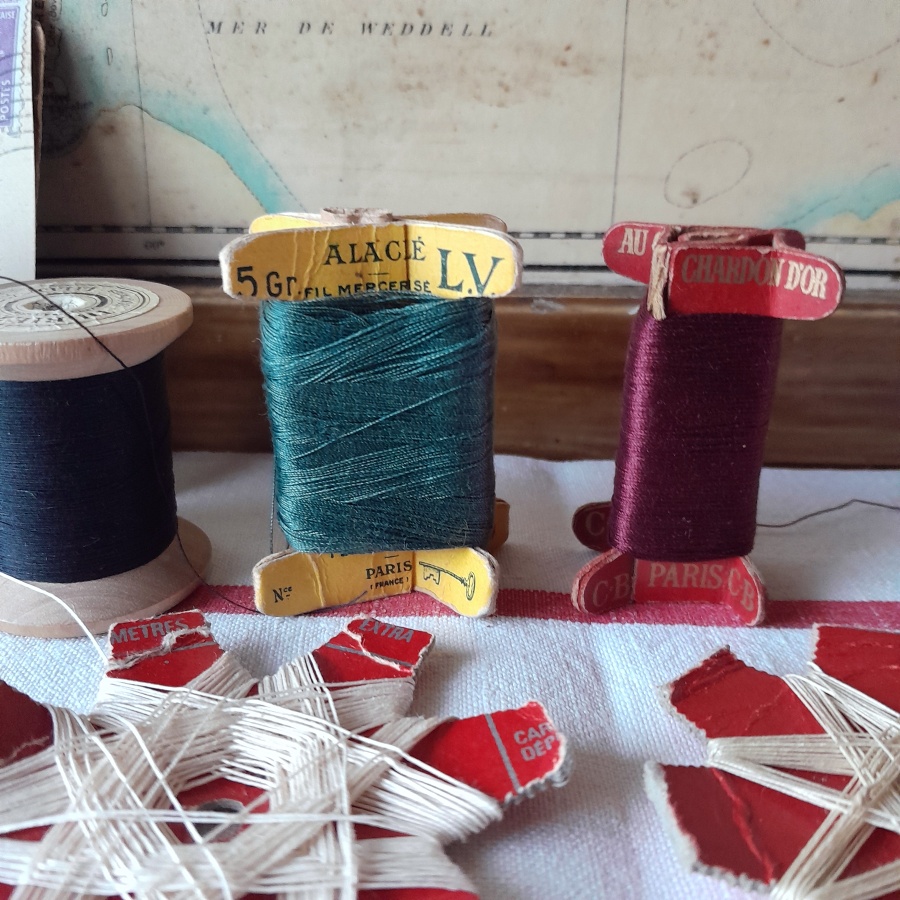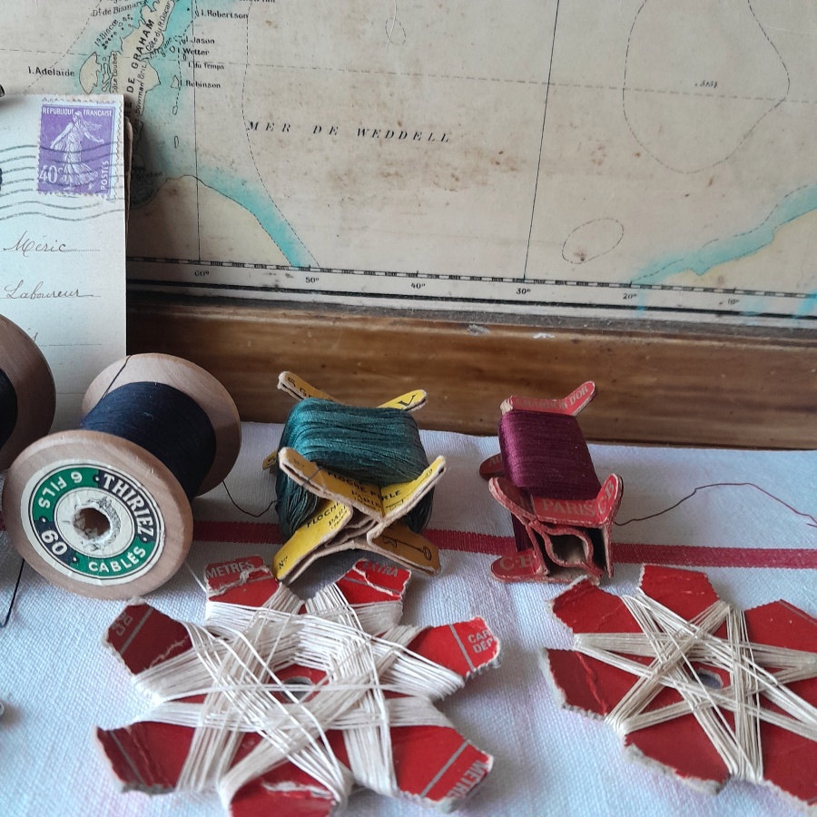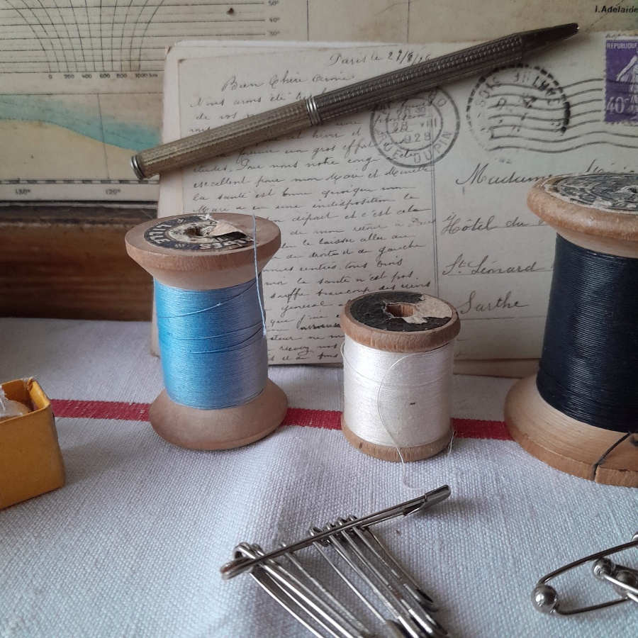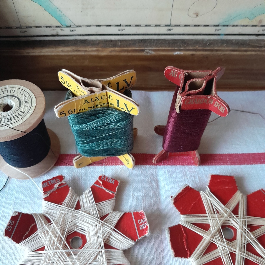 木の糸巻き、紙の糸巻き、レトロデザインの安全ピンなどをまとめたセットです。