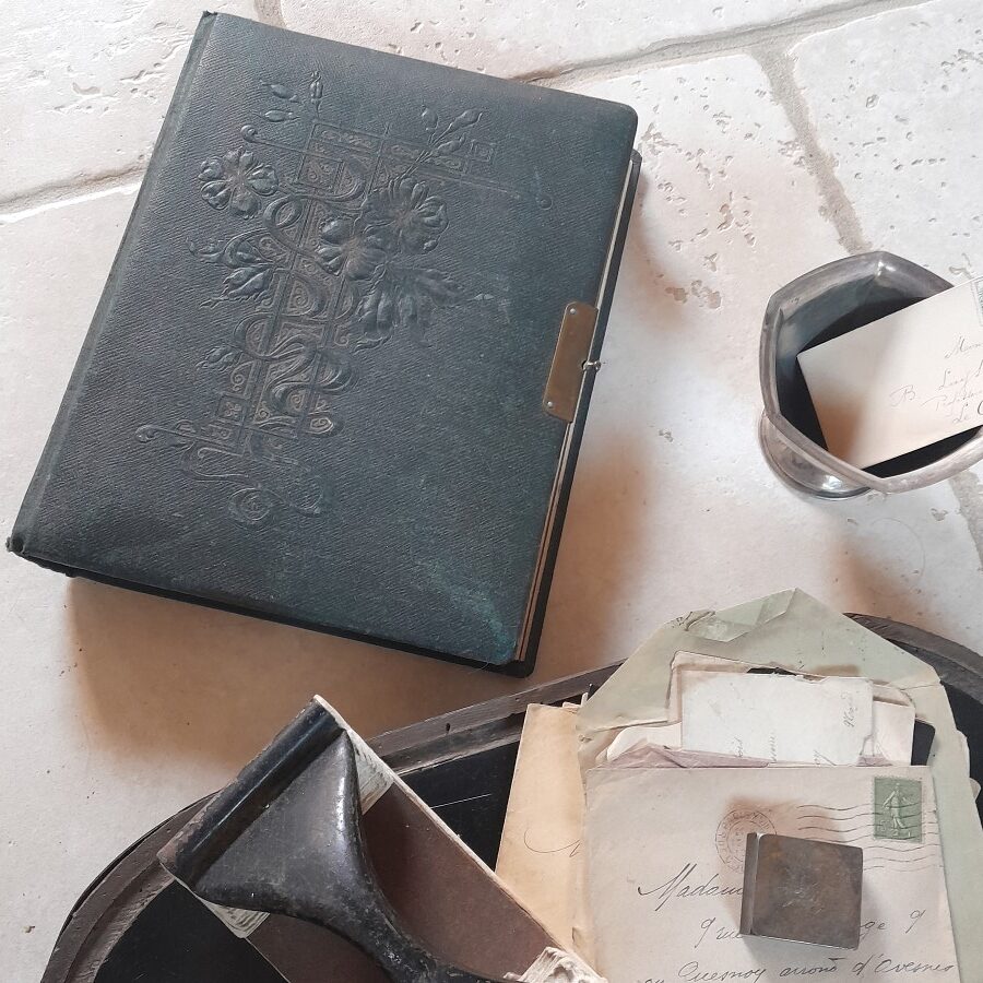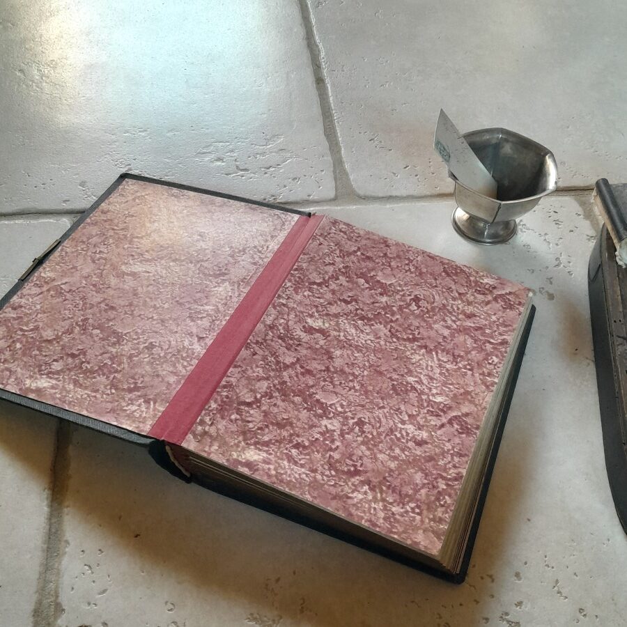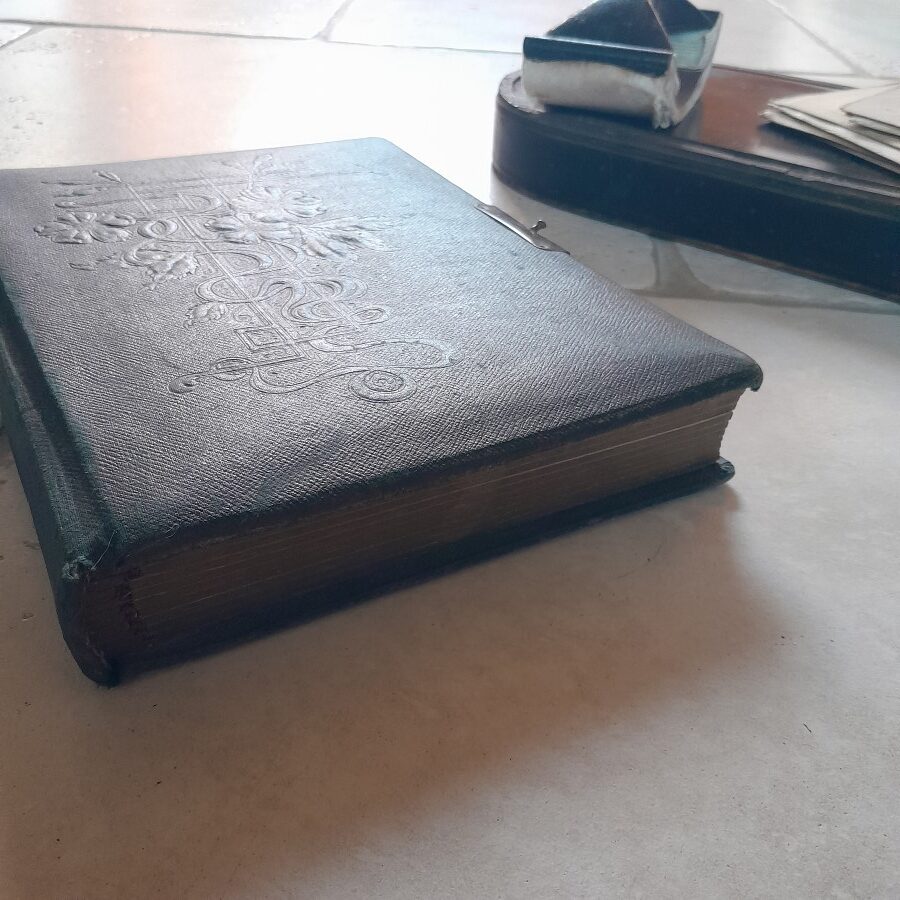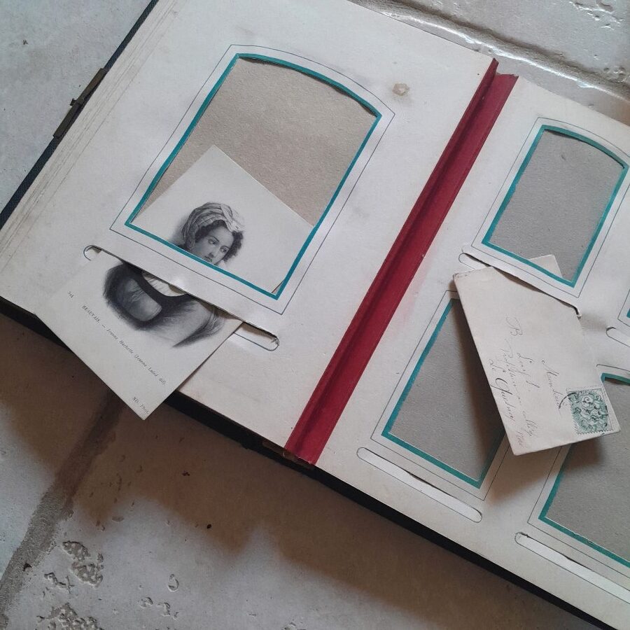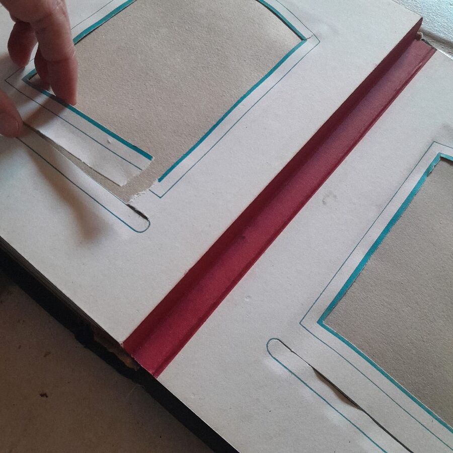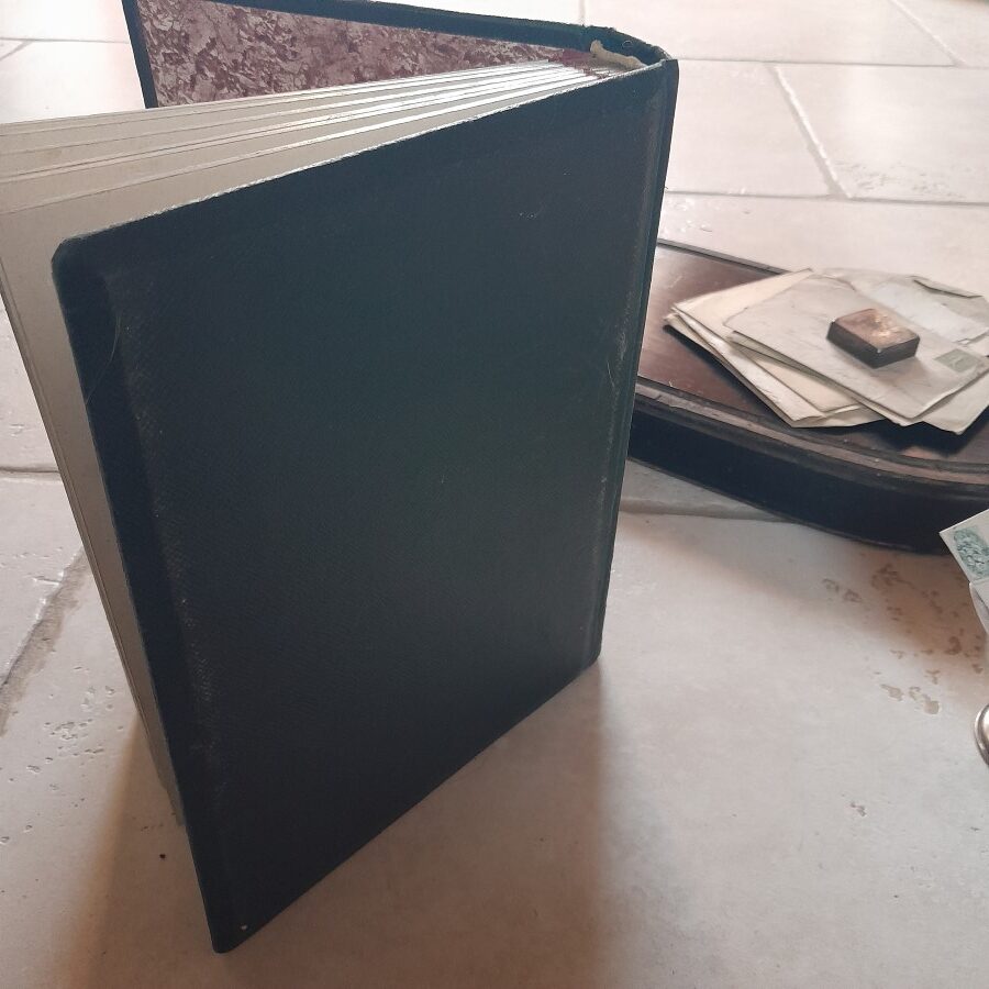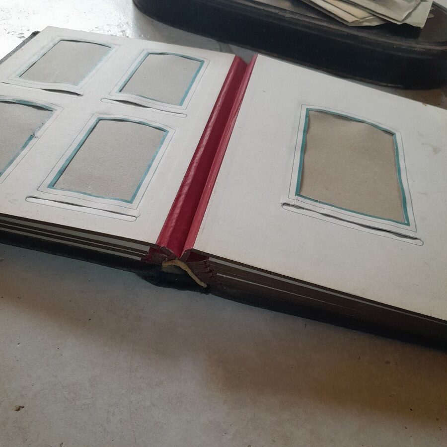 一枚のページが3ミリほどの厚みで、それぞれ一枚か四枚の写真が入れられるスペースがあります。見開いた時に平らになるように作られているので、開いて置いた時も安定しています。紙には多少の破れや茶ばみ、ヨゴレなどが見られますが全体に状態は良好です。おそらく留め金の受け部分が無くなっています。