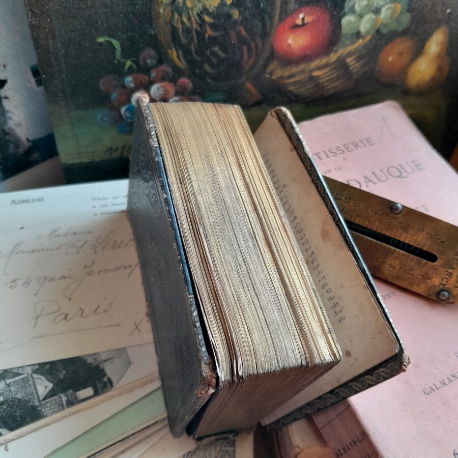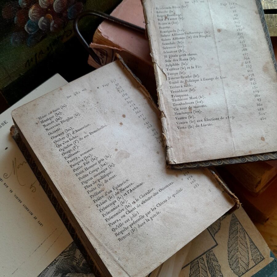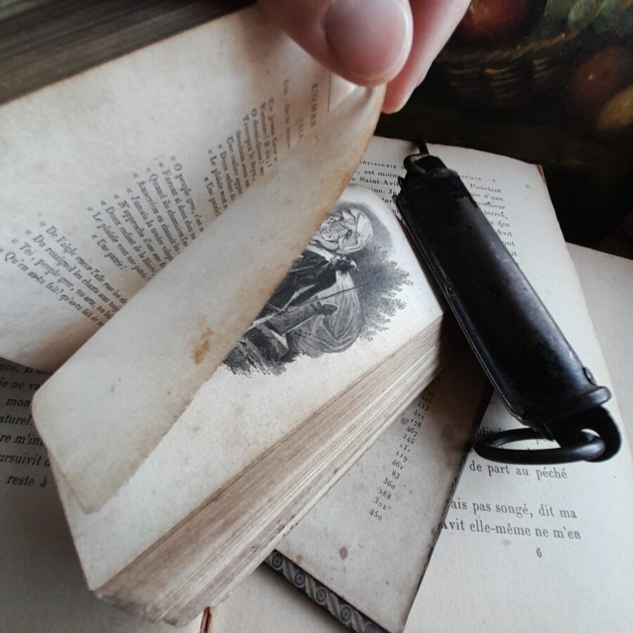 はじめの30ページほどが欠けて無くなっています。かなり小さいフォントで、余白が多めに取られた装丁。挿し絵は繊細な銅板画で、保護のためパラフィン紙がかかっています。傷みにより、表紙と本体で3つに分かれています。シミや茶ばみなどの傷みが目立ちます。