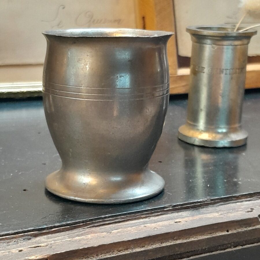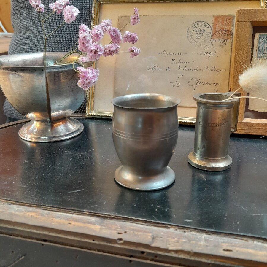 胴体に三本のラインが入っているだけのシンプルなデザインです。外側にひらいた口径の縁はややゆがんでおり、切り口が鋭くなっています。底にはフランス製や錫といった刻印が入っています。多少の変色やキズが見られます。