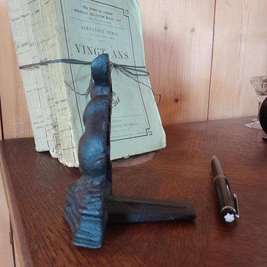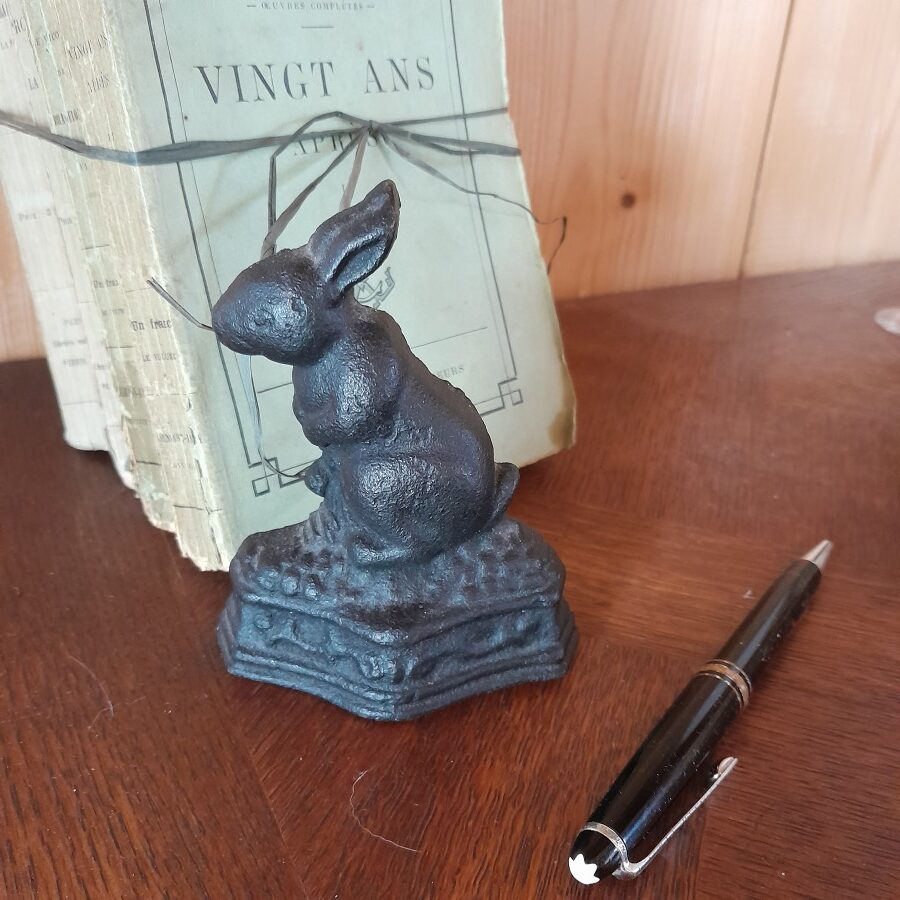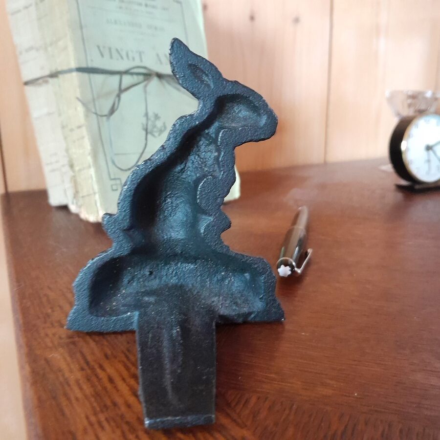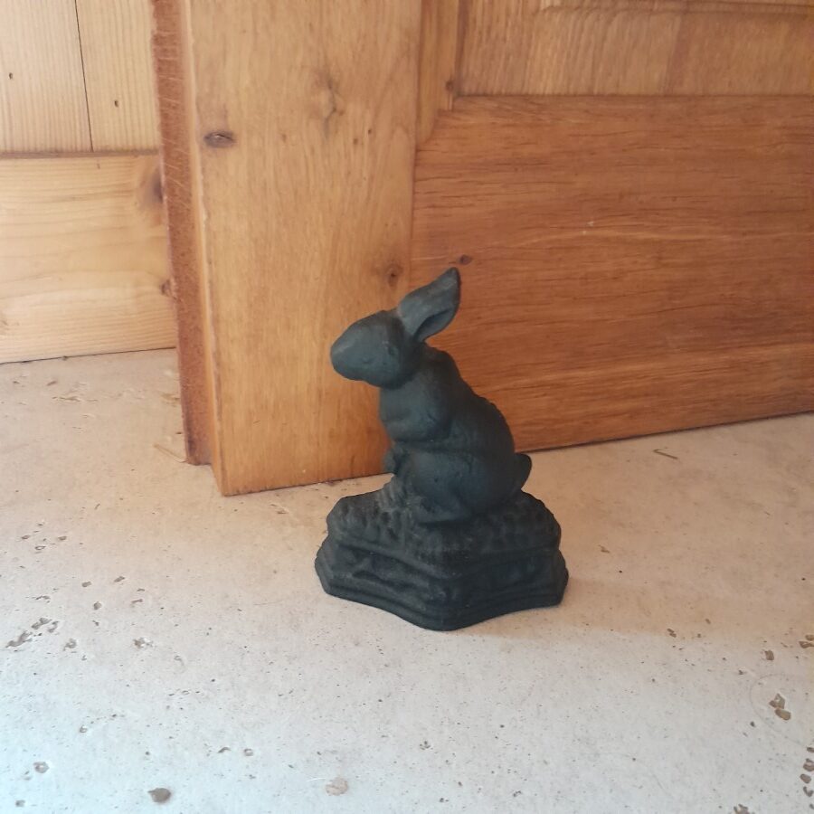 うさぎが横を向いて台座の上に乗っているデザインで、細工はやや大雑把ですがうさぎの柔らかい線がよく出ています。置いた時に多少カタカタとしますが、ドアに嚙ませることで安定します。