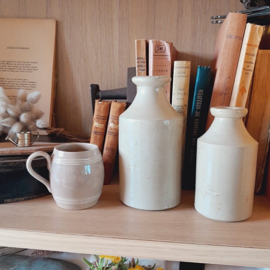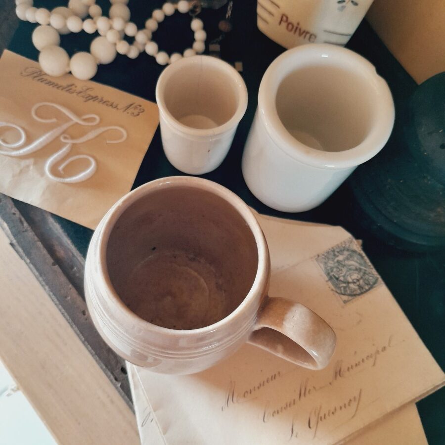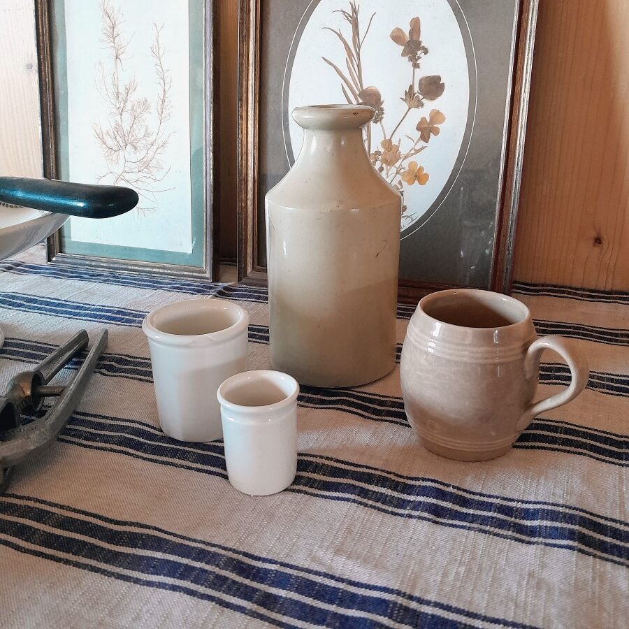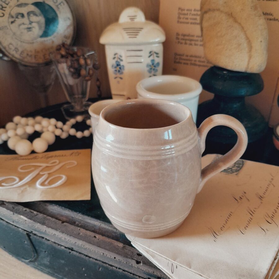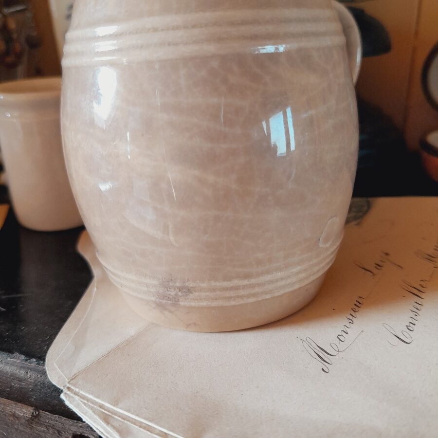 ミルクピッチャーにしては小さめで注ぎ口もなく、口径がやや狭まっているのでお茶を飲むのにもあまり適さないデザインですが、その形と三本ラインの簡素な装飾、色味といいなんとも言えない魅力があるお品です。目立つ傷みはありません。