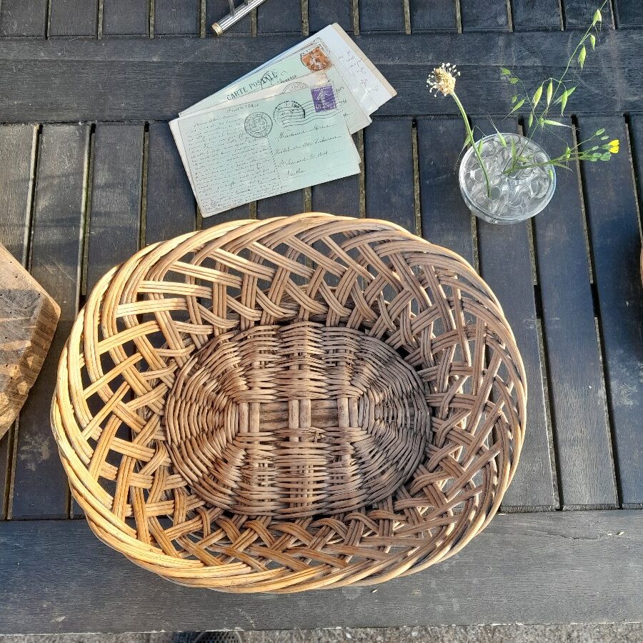 食卓で田舎パンなどの半身をリネンの布とともに無造作に入れておきたい、楕円形のパニエです。