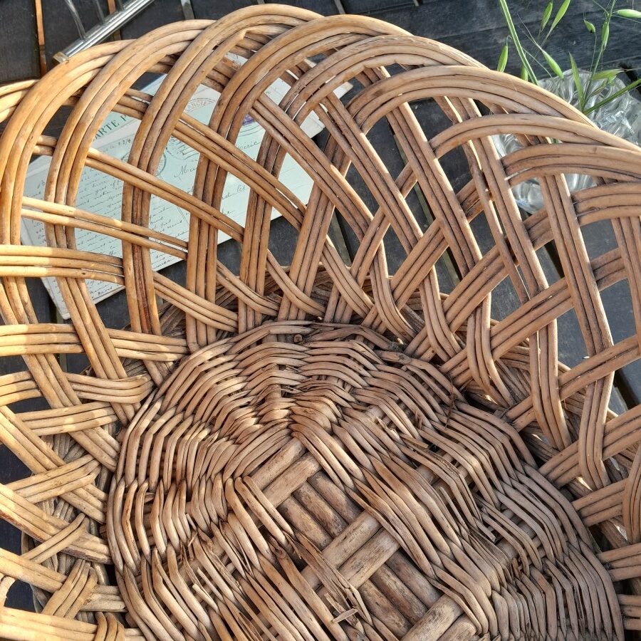 ざっくりとした編み、底の立ち上げ部分の工夫、手作り感あふれる多少のゆがみなどが魅力です。籐の一部が折れたりして無くなっていたりする箇所がありますが、作りがしっかりとしているので使用に問題はありません。マットでやや色褪せています。