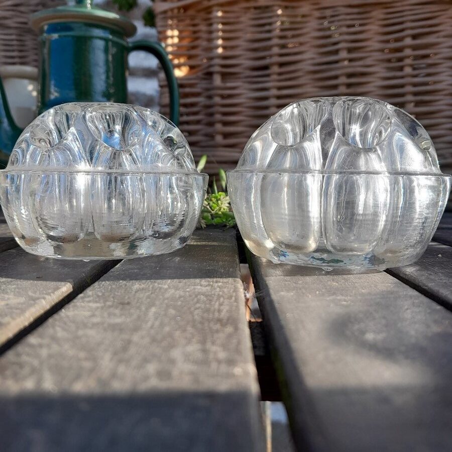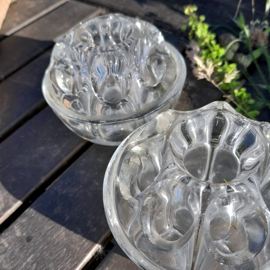中央にひとつ、周囲に八つの穴があいており、それぞれ分かれているので水が中で混ざりません。ガラスは厚く、重さもあるので置いた時に安定しています。底にはフランス製の刻印入り。内側の多少の汚れが残っているほか、目立った傷みは見られません。
