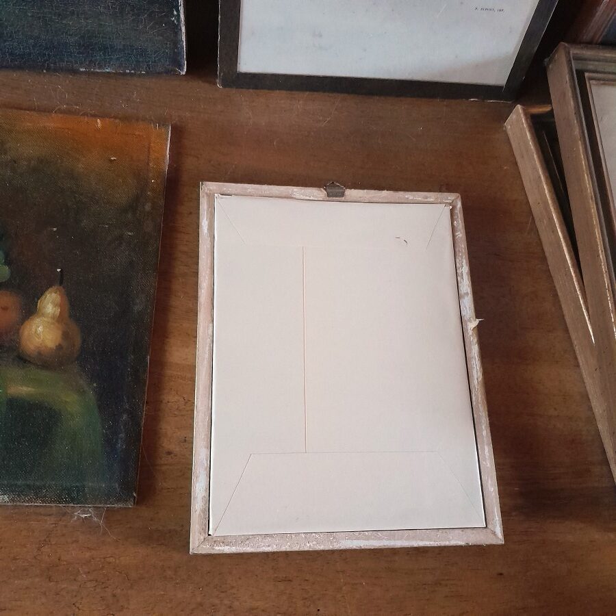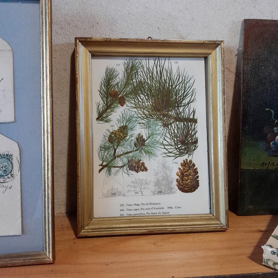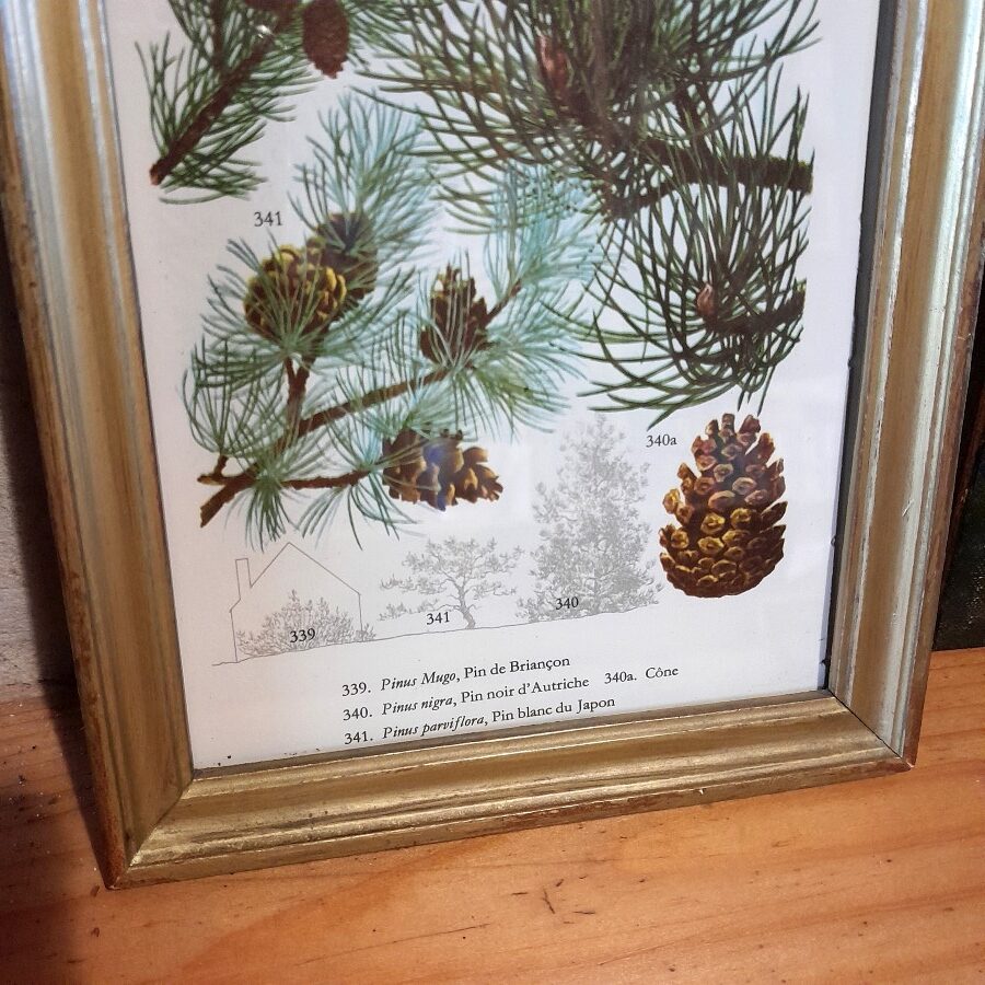 350種以上の植物を130ページほどに収めた辞典の糸綴じをほどき、本体に挟んだ状態にしてあります。上下を少し折り込むか切り取ることで額に収まるサイズになります。額は木製で塗装がところどころ剥げています。壁に掛けるフックがついています。