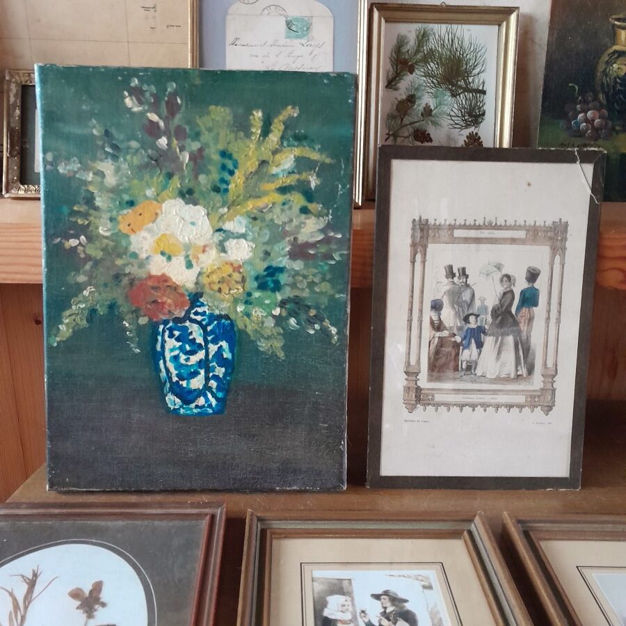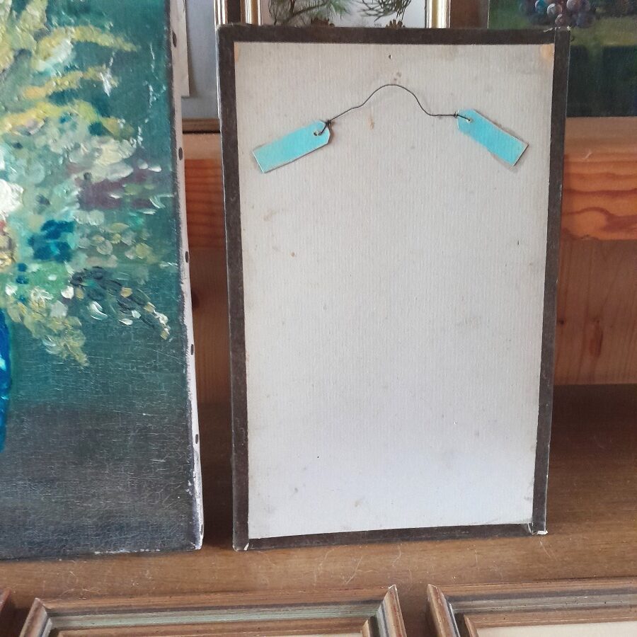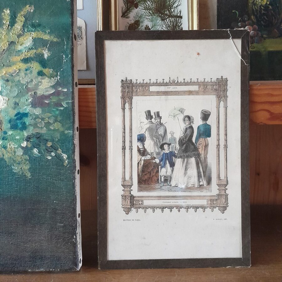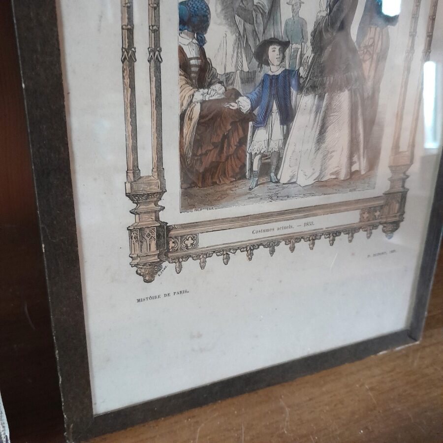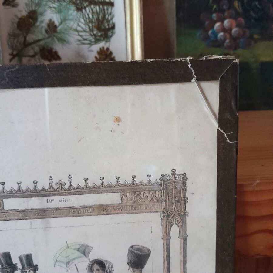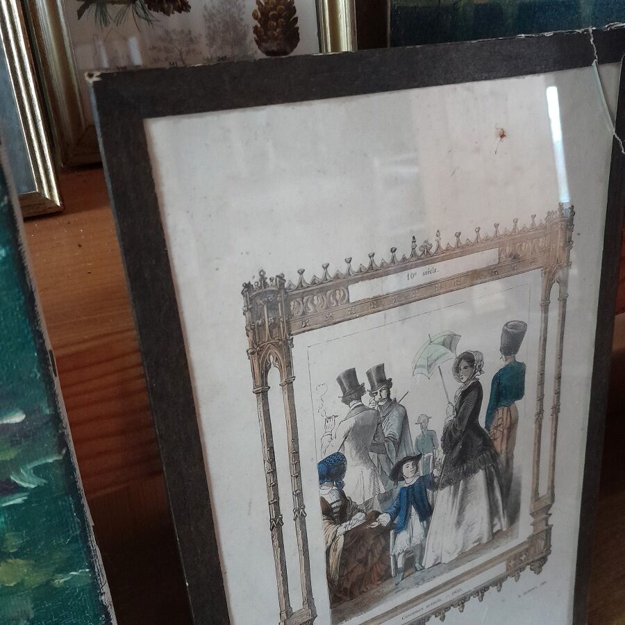 銅板画ならではの繊細な線、外出着でたたずむ人々、それを囲むゴシックな枠の雰囲気など、クラシカルな雰囲気がたっぷりと味わえます。ガラスの縁を紙のテープで囲んだだけの簡単な作りです。右上の角の一部のガラスが割れていますが、テープで固定されており動かさなければ外れない状態です。