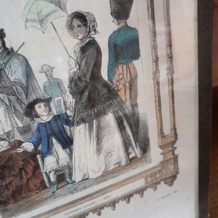 現代の服と題された彩色銅板画をガラスの額に収めた一品です。