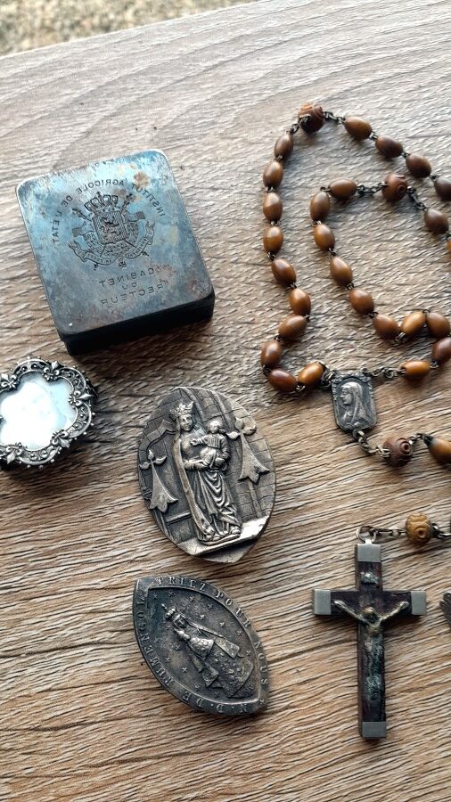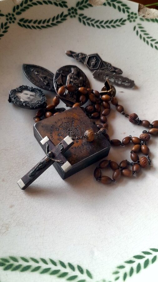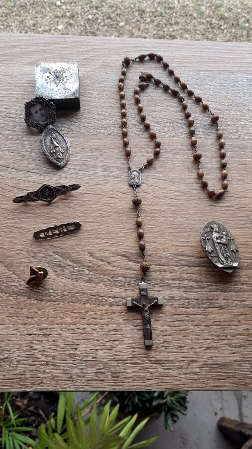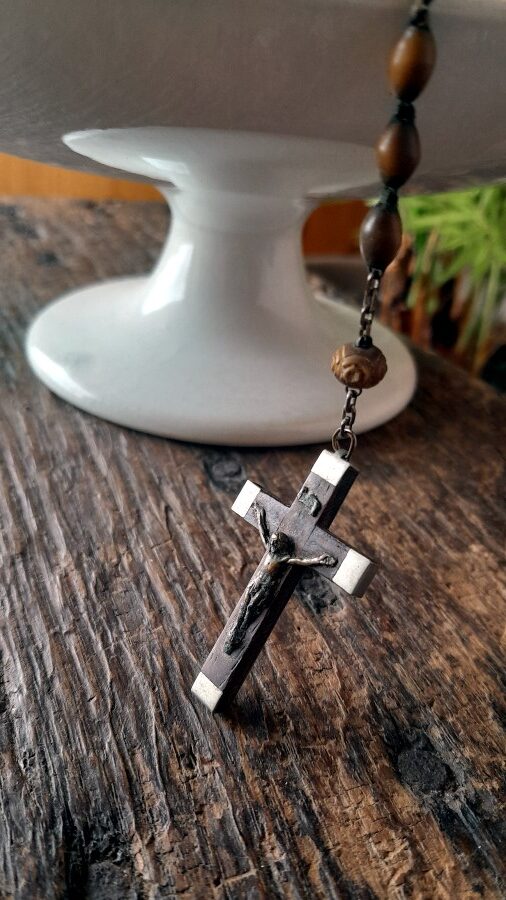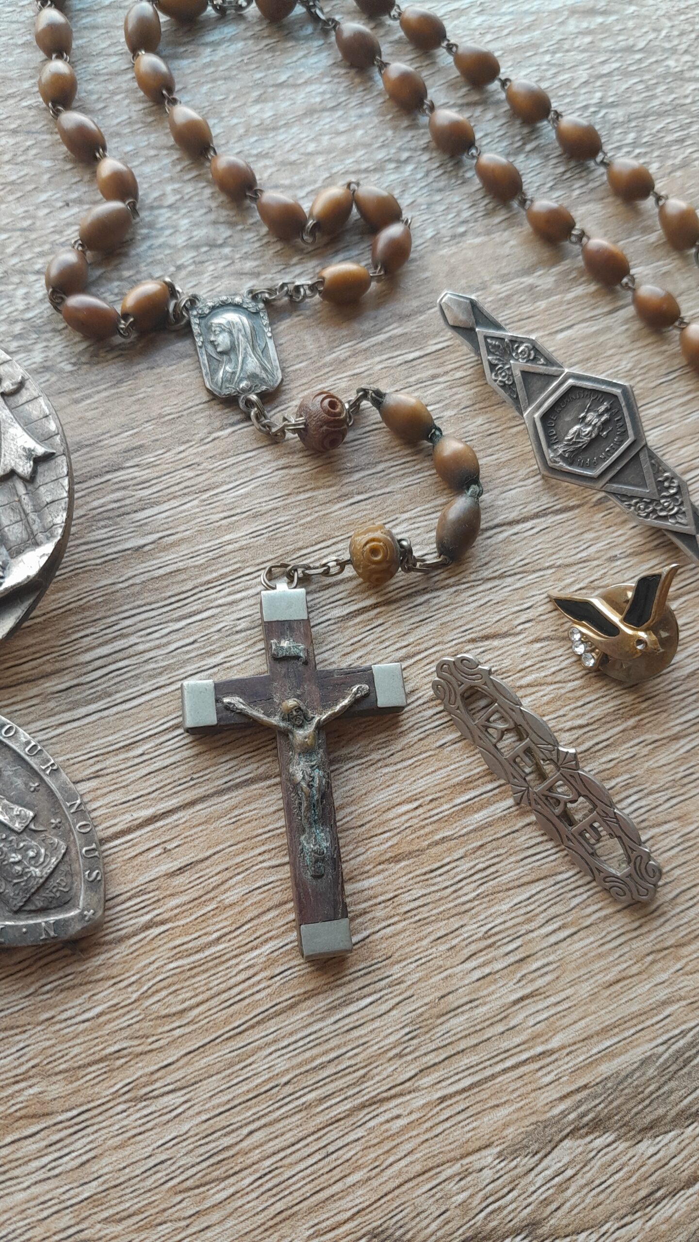 茶色のピースは木製か、軽く滑らかな手触りでツヤがあります。十字架の裏にはルルドの文字。輪はちょうど頭を通して首に掛けられるサイズです。金属部分に特に経年による変色等が見られます。