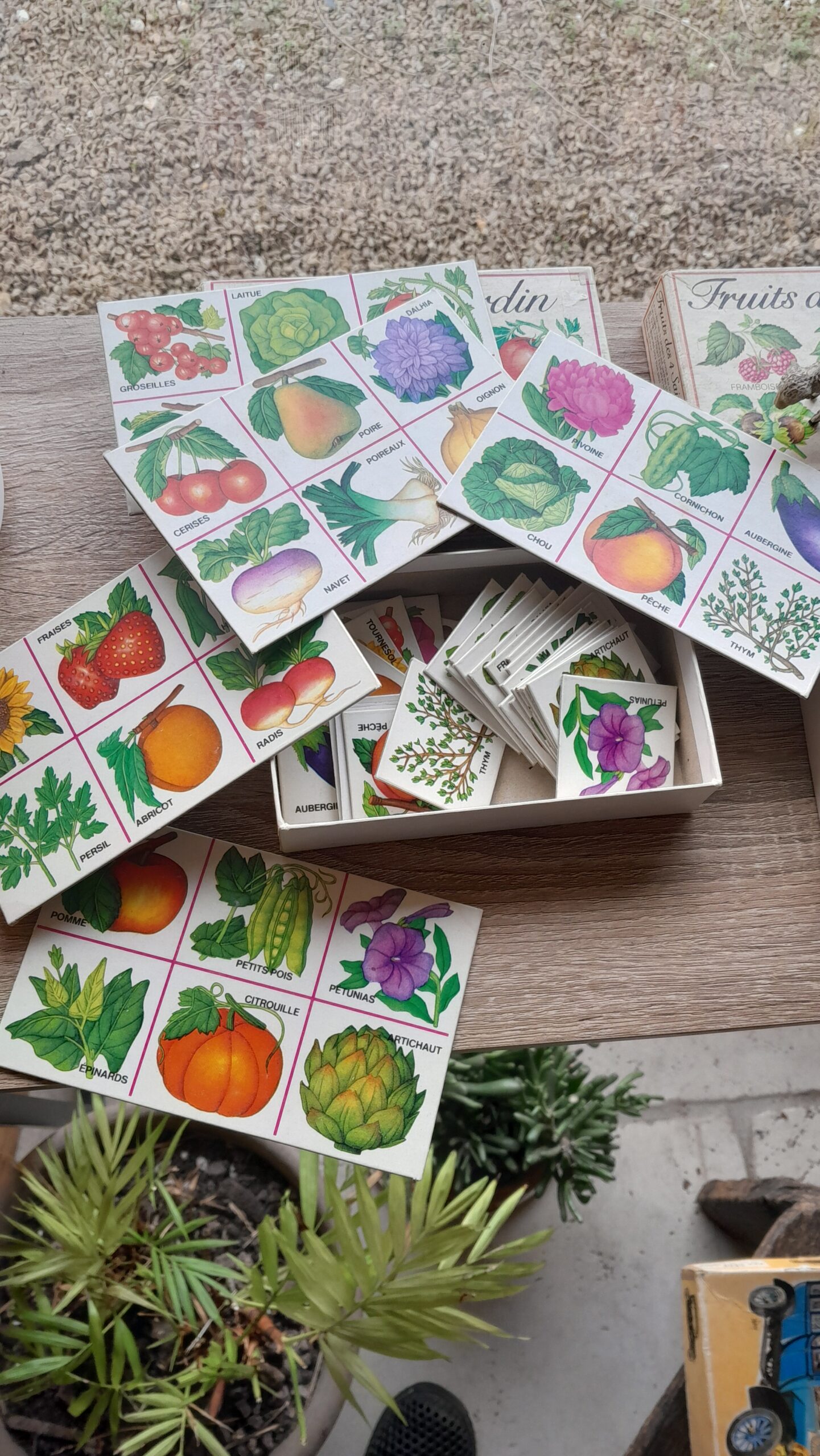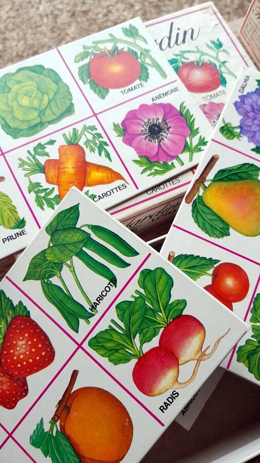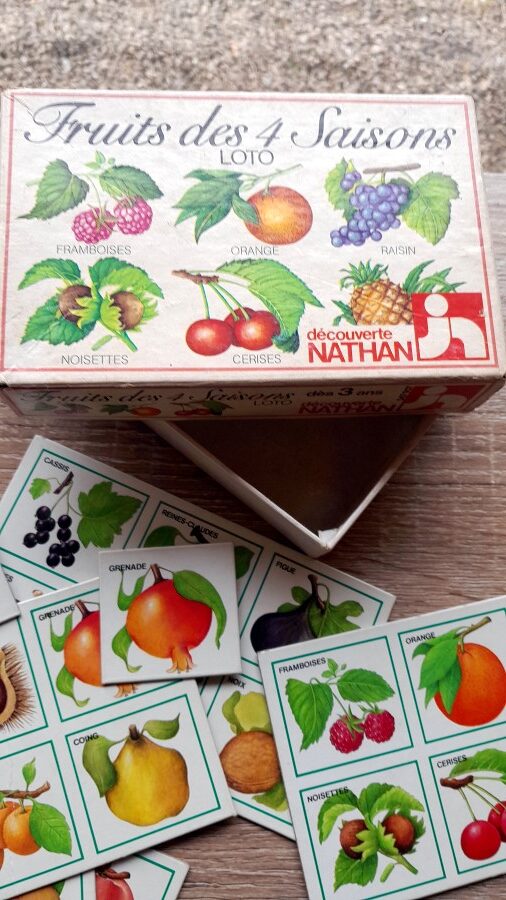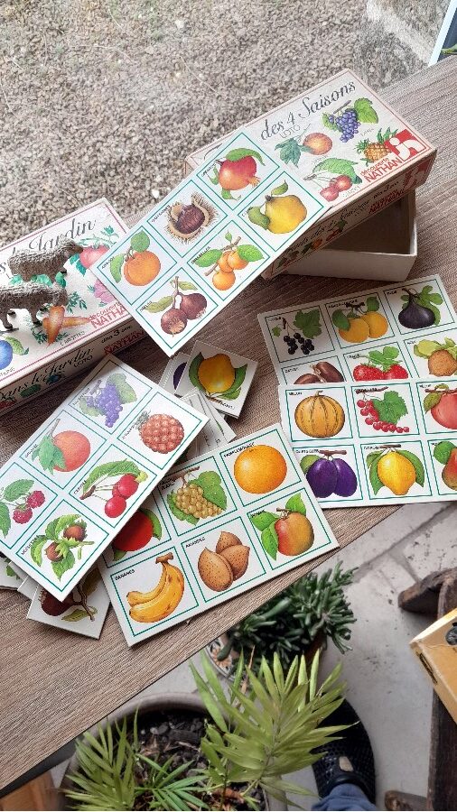 フェルナン・ナタン社から、ややリアル寄りのイラストのロトゲームです。各セットにシートが5枚、ロトのカードがそれぞれ6枚で計30枚ついています。どちらも全て揃っています。森や畑で見られる動植物や昆虫などをテーマにしており、レトロな雰囲気のイラストが素朴で懐かしい印象です。箱には多少の汚れなどが見られますが、中身は比較的きれいな状態です。
