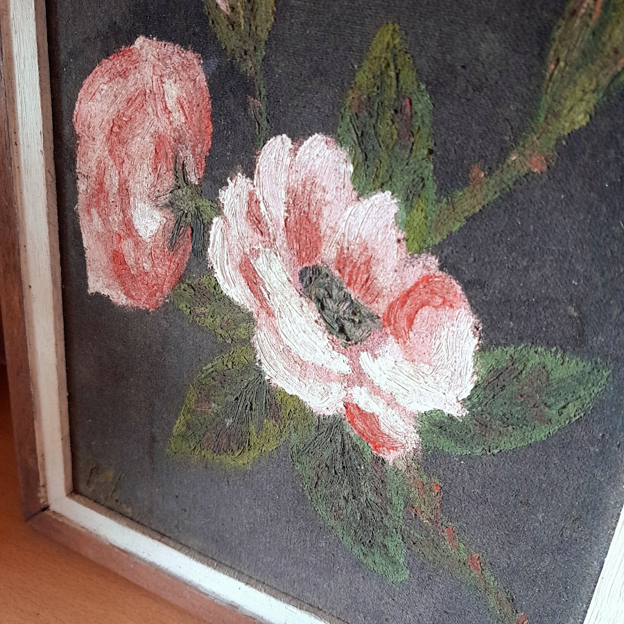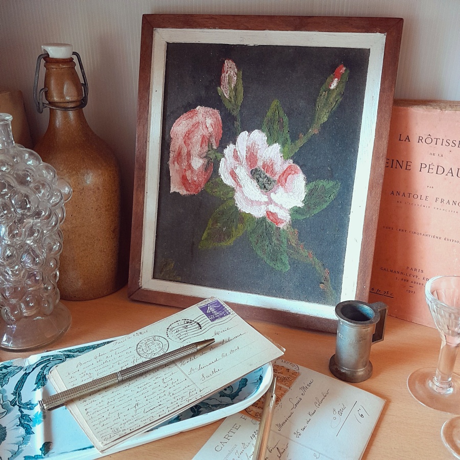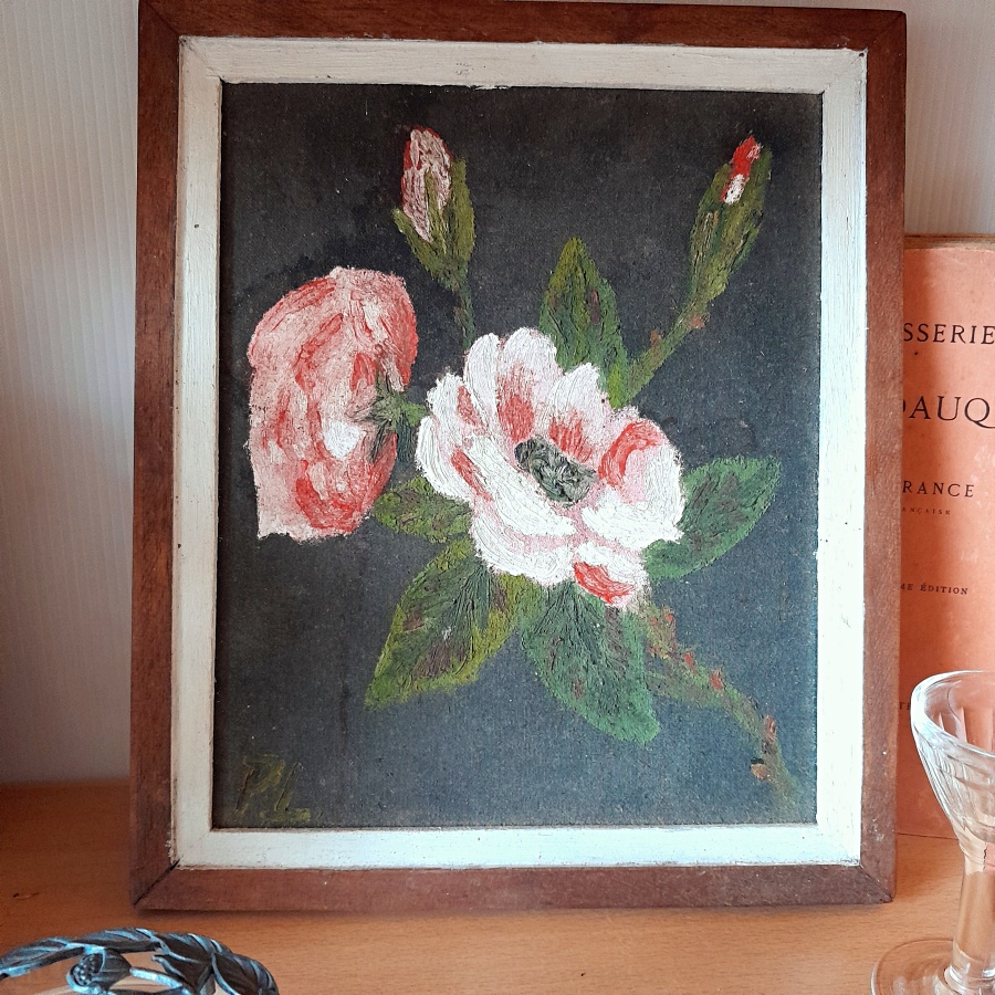 光を全く反射しないマットな表面で、筆のタッチはざっくりと残っています。左下にPLのサイン入り。額の内側縁は白で塗られ、シンプルな木枠もマットです。お好みで、裏のくぎを外して枠から外しても。他の絵や小物との合わせ方を楽しんでみてください。