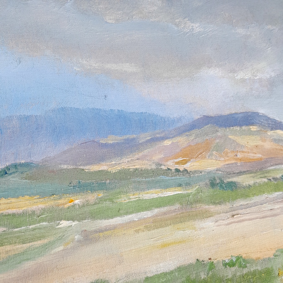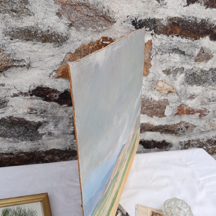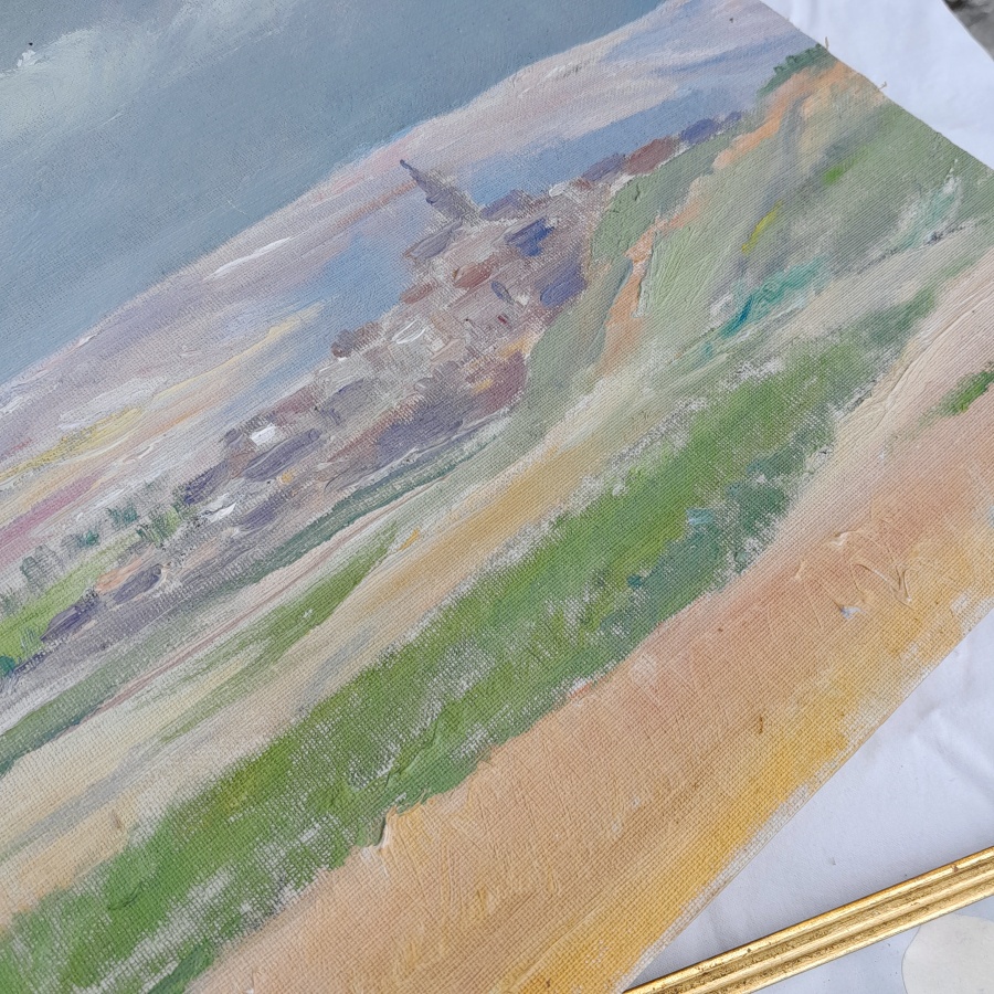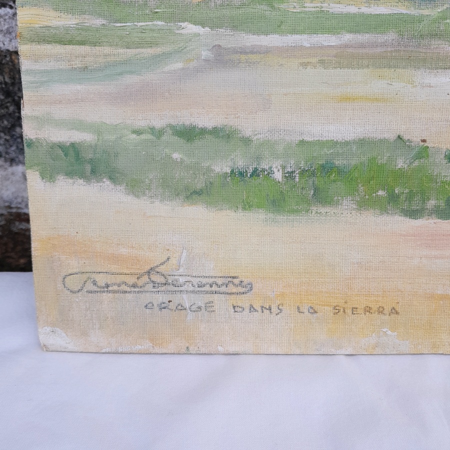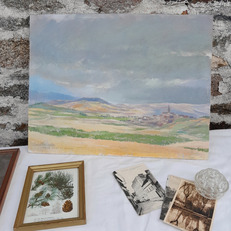 厚紙に直接描き込まれ、壁に掛ける留め具などはついていません。田舎の小村、広がる平らな風景とその奥のなだらかな山、そして次第に荒れてくる空。フランスの田舎ではよく見られる、光と影が描く景色を上品に表しています。左下には作者のサインとタイトル入り。