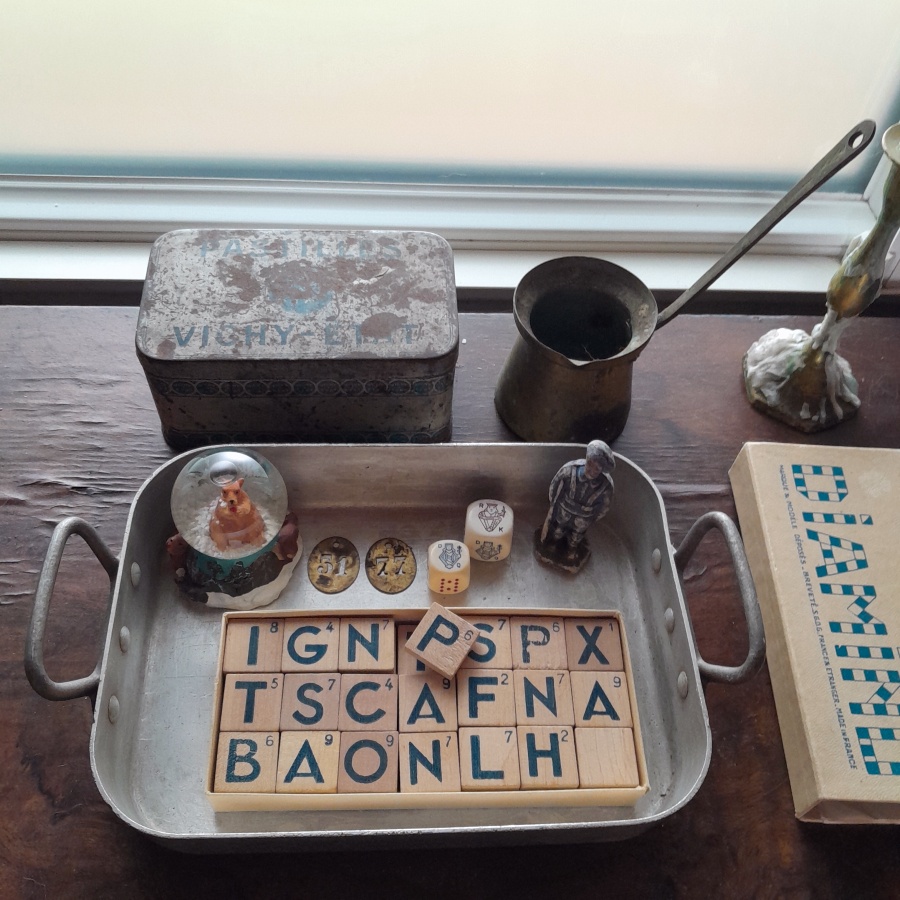 角が丸みを帯び、ツヤがあり滑らかな手触り。年代は不明です。多少の汚れなどが見られます。雑貨としてデザインを楽しみたいお品です。
