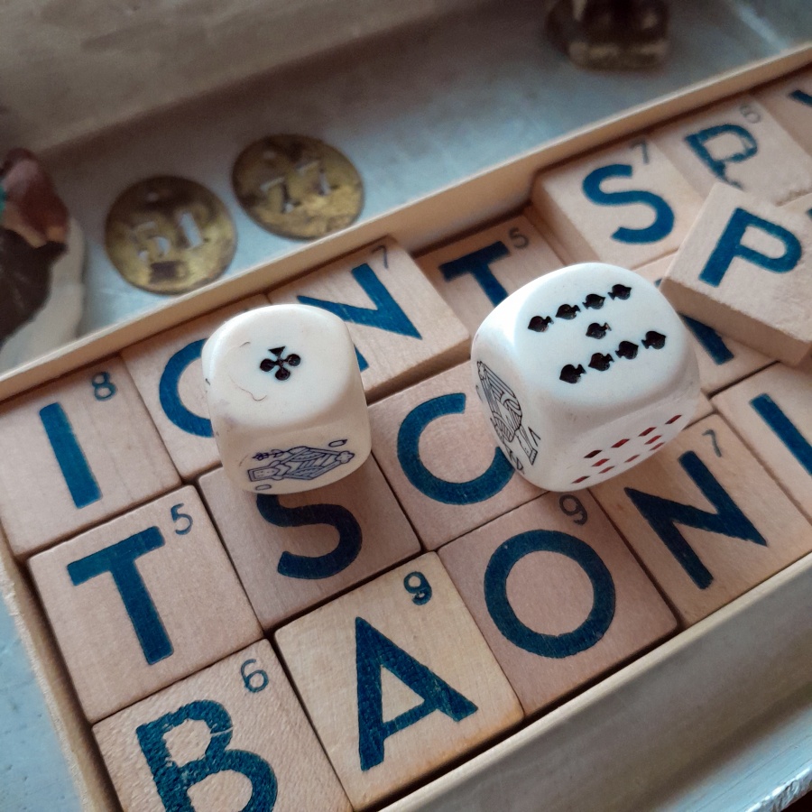ポーカーダイスという遊びで使われるさいころの二つセットです。