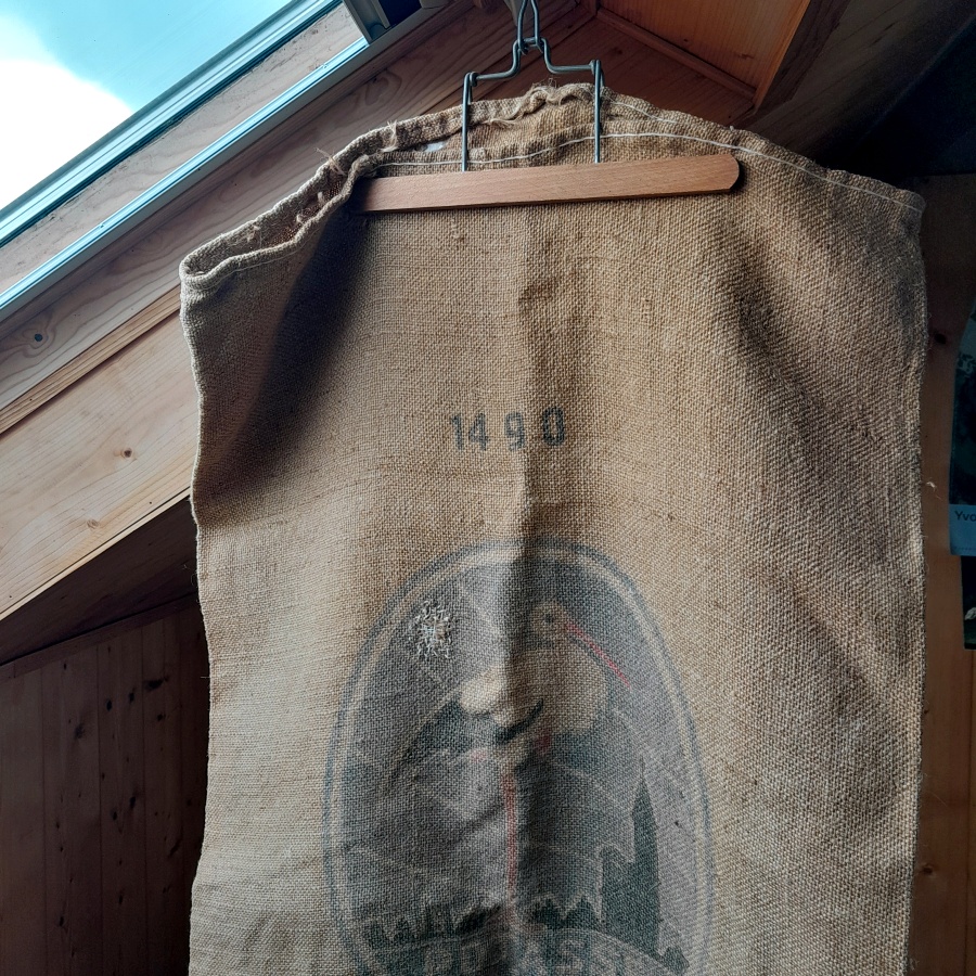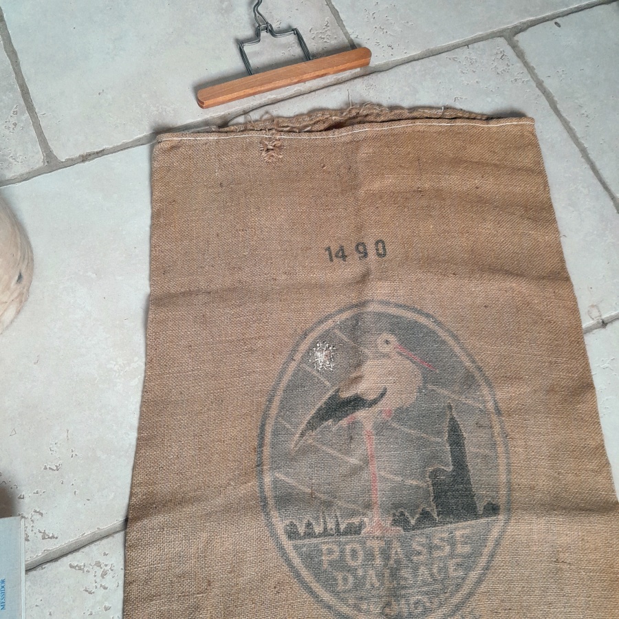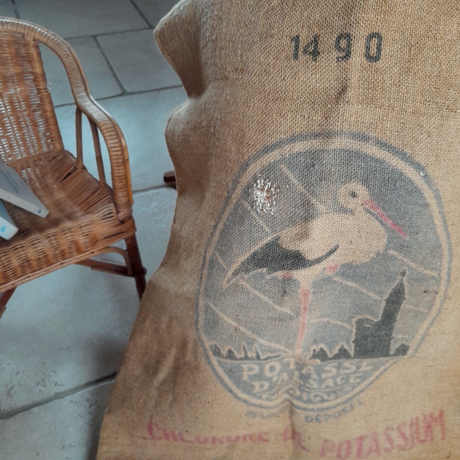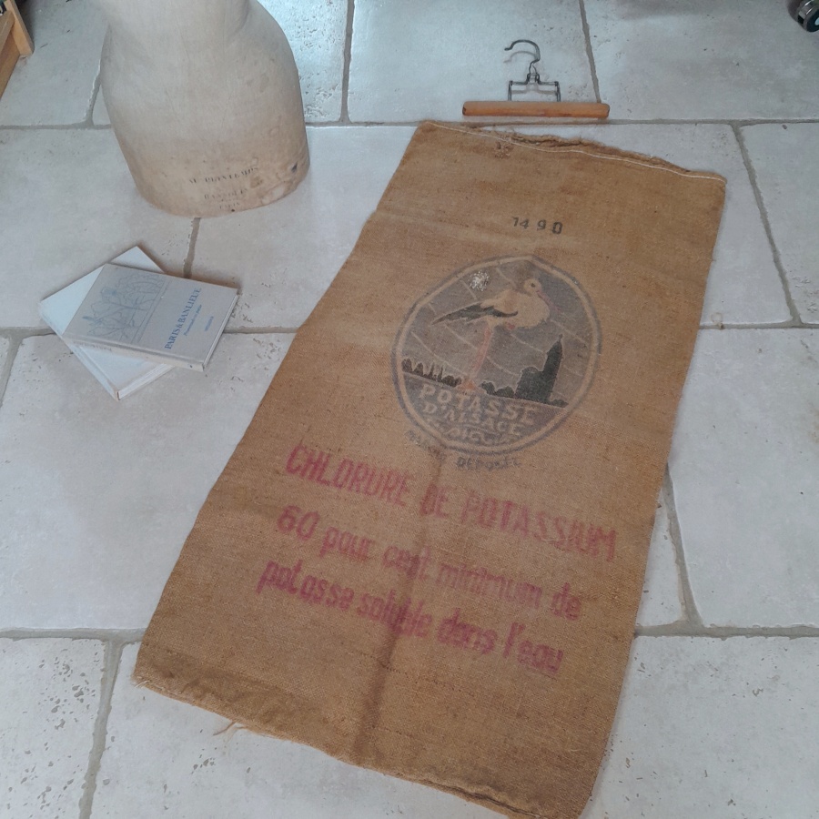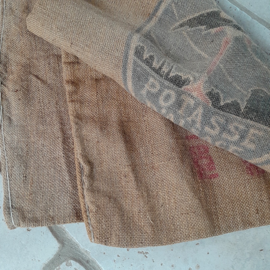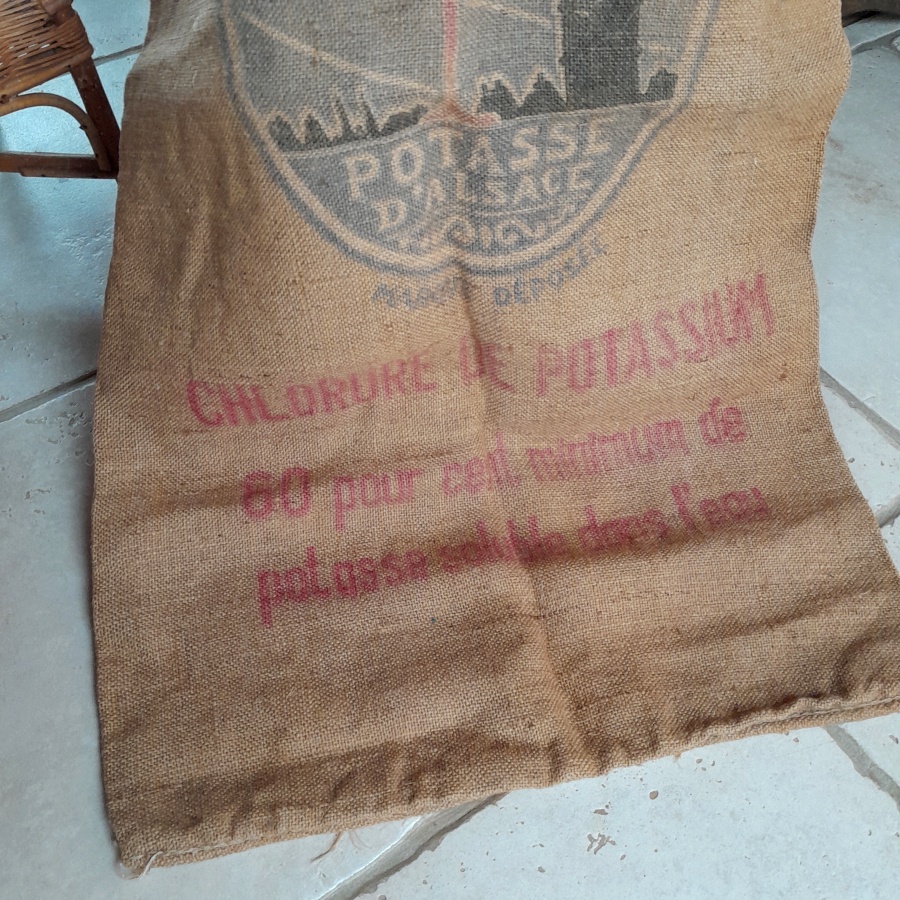 アルザス地方の会社のロゴと、60パーセント以上の水溶性カリを含む塩化カリウムとの表記があります。太めでも細かい目で編まれ、テロリとした質感です。麻の毛羽立ちでざらっとした手触りがあります。経年により色味は剥げぎみですが、破れが補修された跡もあり、どこかで大切に使用や保管されたいたようです。袋の口近くにもうひとつ、補修されていない穴があります。