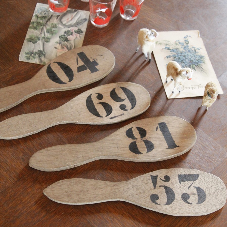 しゃもじのような形で、大きさもちょうどその位です。数字は裏表それぞれ違うものが入っています。04と55、69と15、81と29、53と02が対です。しっかりとした厚みがあり、表面は滑らかでマットです。