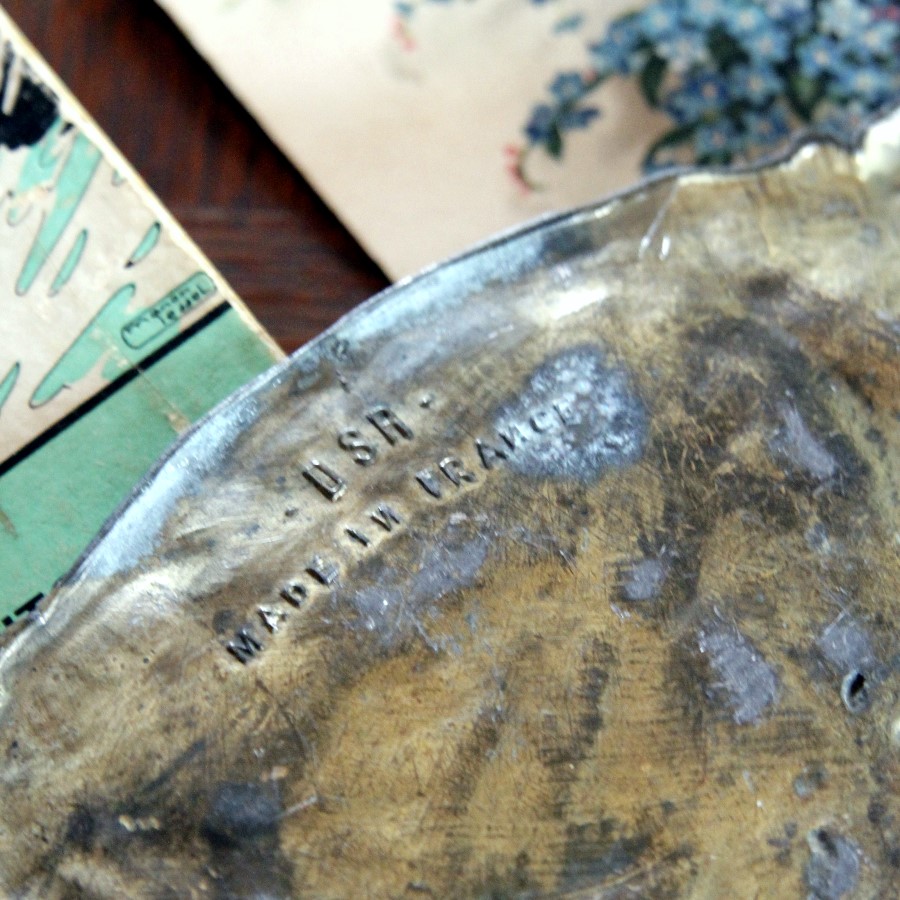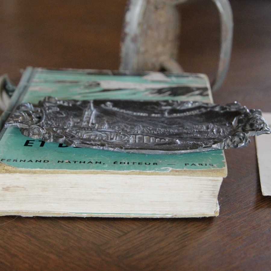 あまり深さがなく平らめで、表面の装飾の凹凸が大きいです。教会とその背景をバラのモチーフが囲んでいるデザインです。裏には、Nがひっくり返った少し怪しいフランス製という刻印入り。