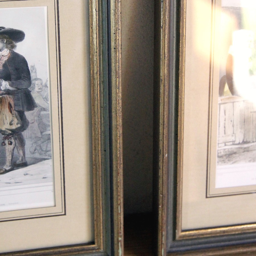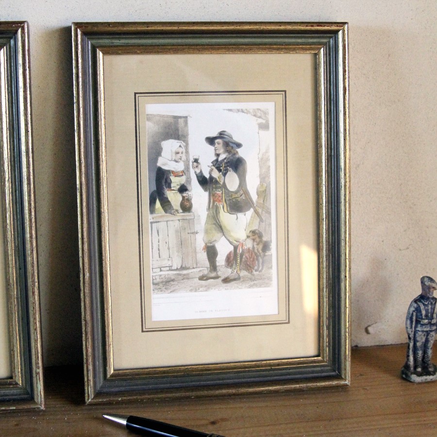 銅板画に着色をしたものと思われる絵が入った額を2枚まとめてお届けします。