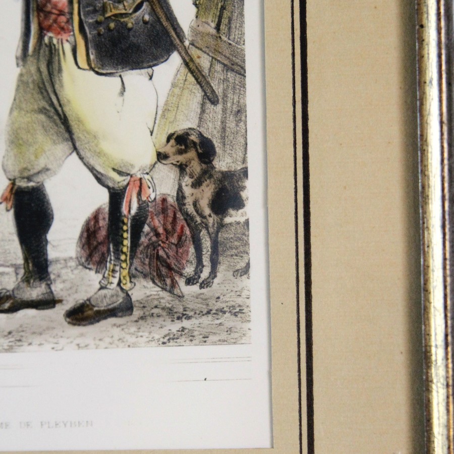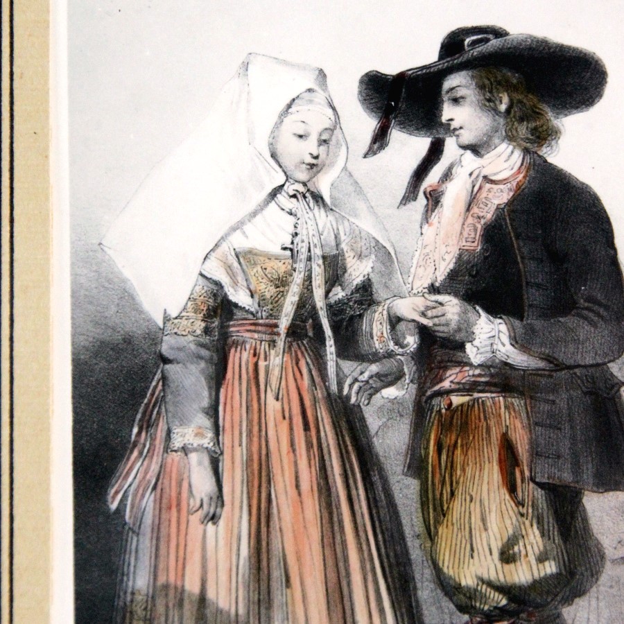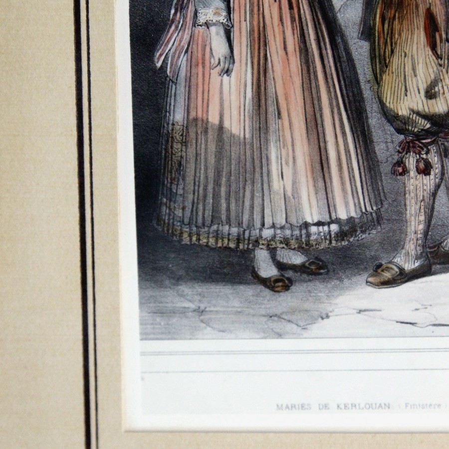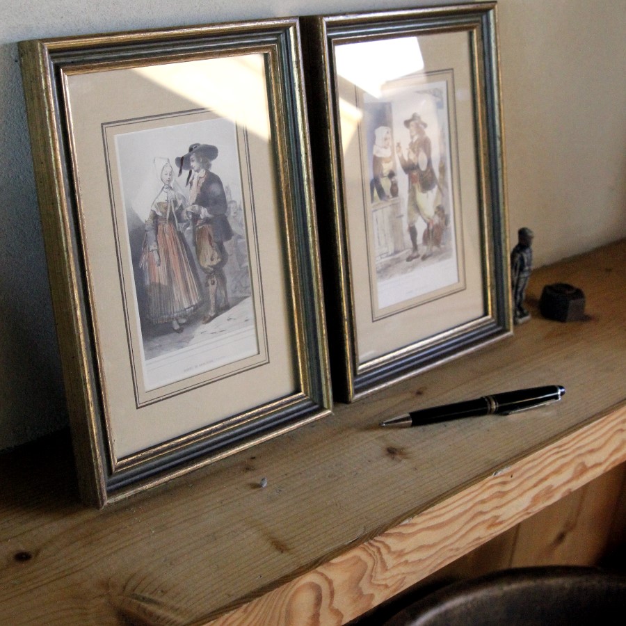 モチーフはブルターニュ地方の衣装を着た男女で、それぞれ「プレイベンの男」「ケールアンの夫婦」と題されています。線画は繊細で、着色も最低限ながら美しい効果を出しています。額縁は木製でガラス入り、しっかりとした作りです。
