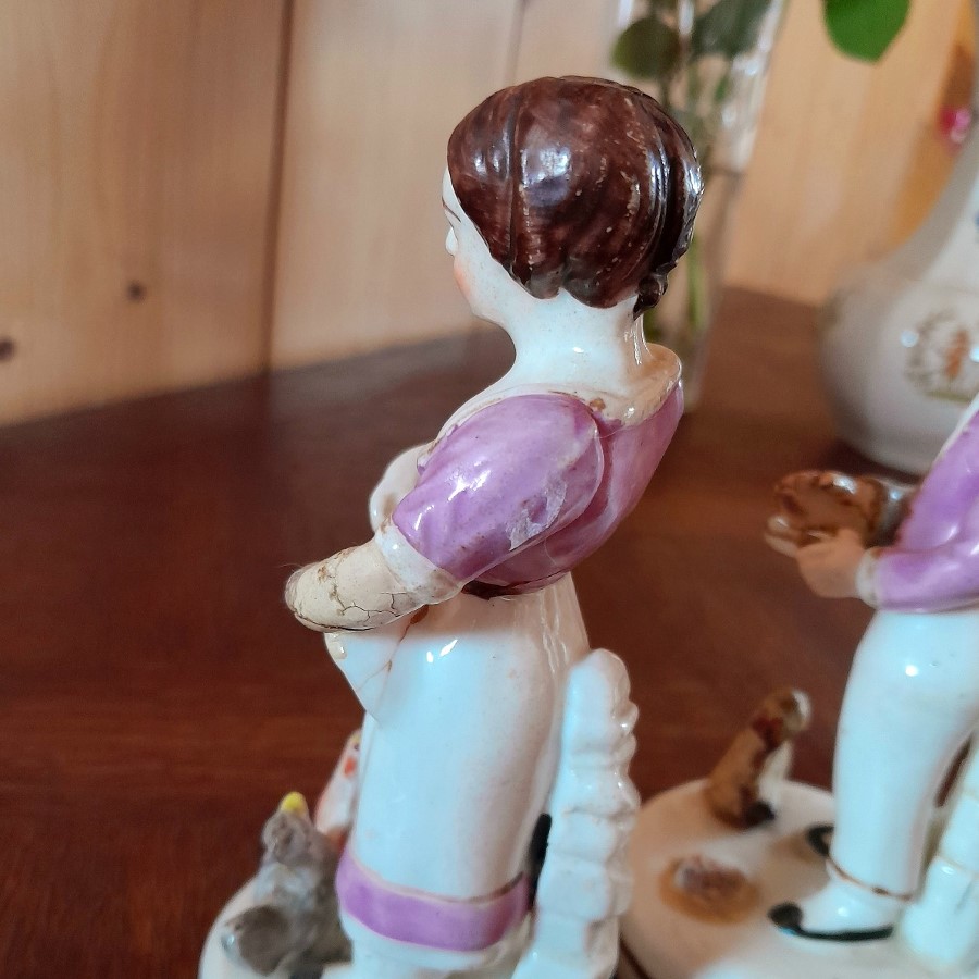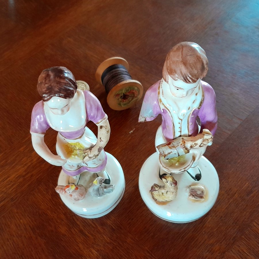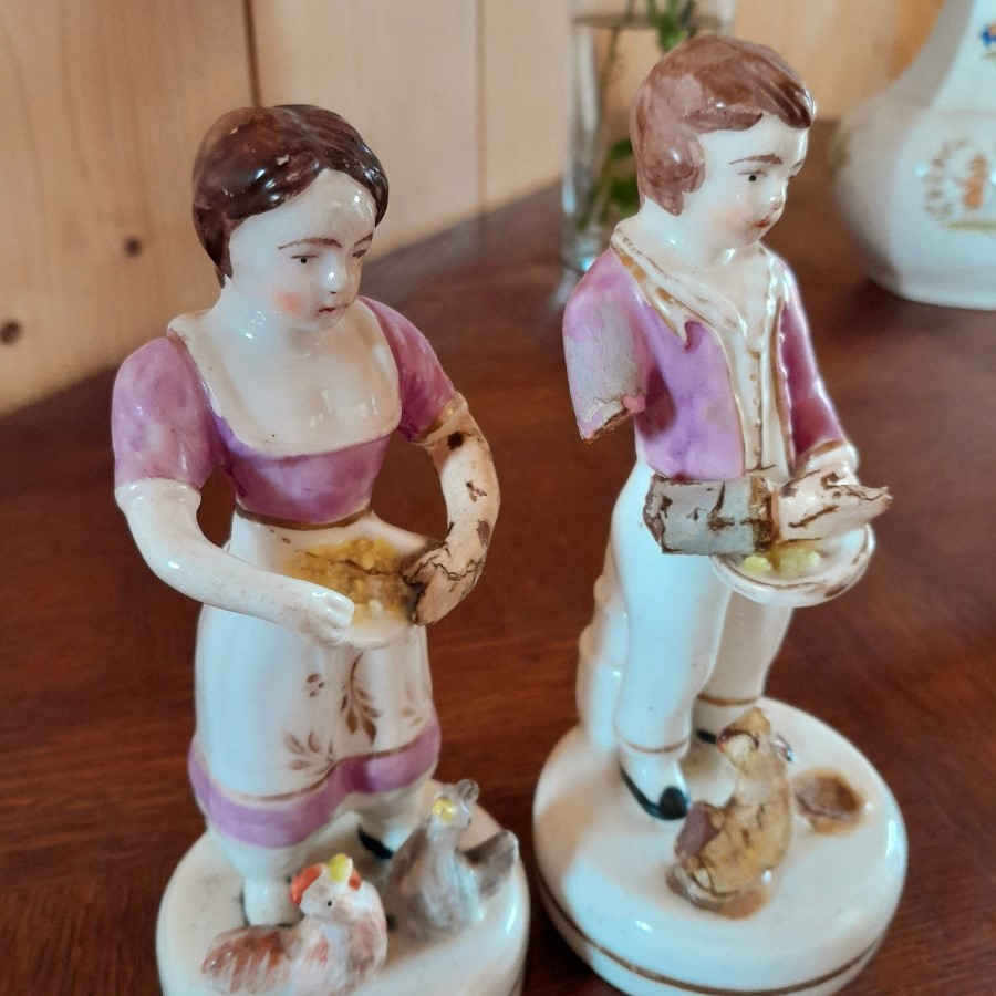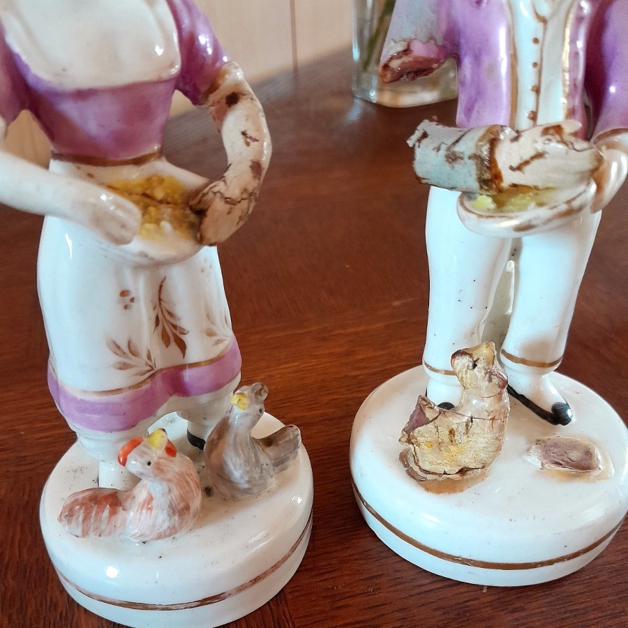 男性の腕が壊れて外れており、女性の腕からエプロンにかけてもかなり傷んでいます。男性側の鶏は一羽無くなり、もう一羽も傷んでいます。写真をご参照のうえ状態をご理解いただいてからご注文ください。