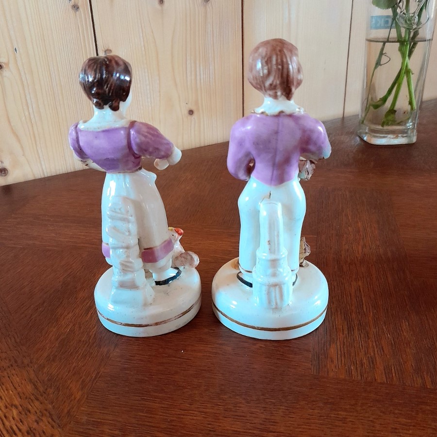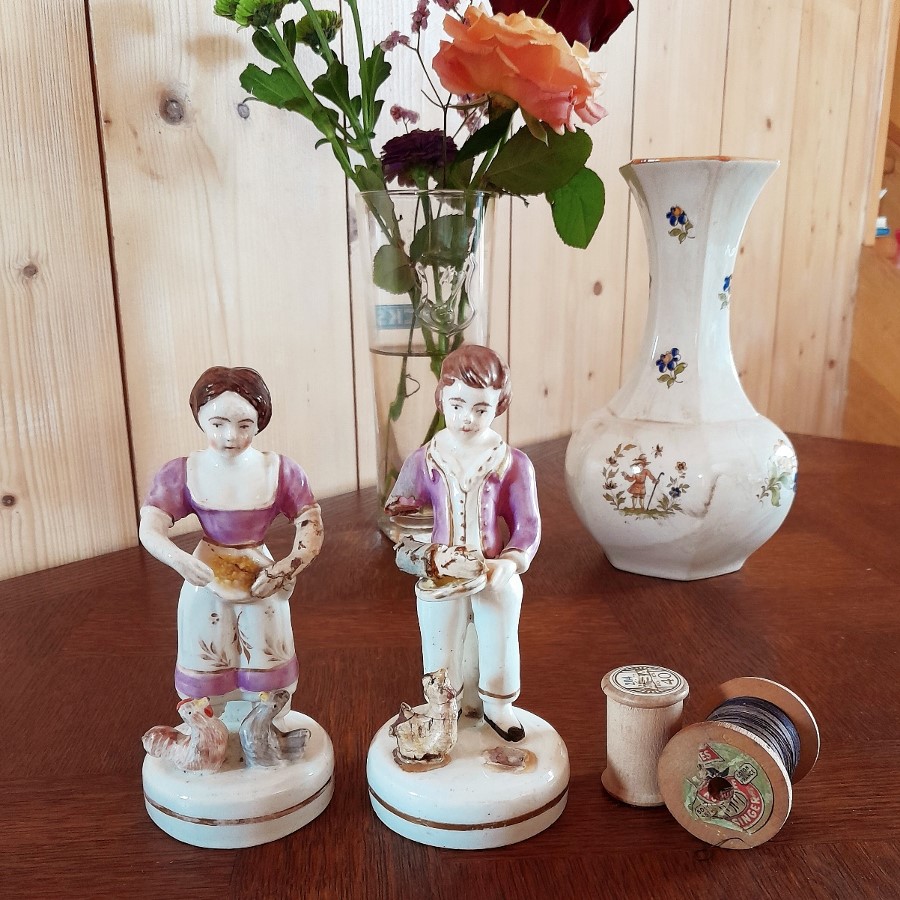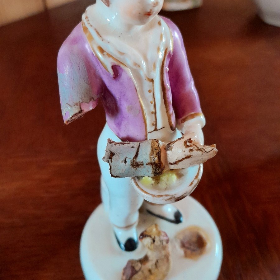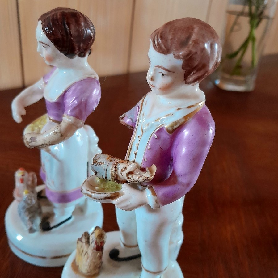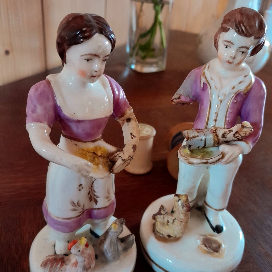 男性の腕が壊れて外れており、女性の腕からエプロンにかけてもかなり傷んでいます。男性側の鶏は一羽無くなり、もう一羽も傷んでいます。写真をご参照のうえ状態をご理解いただいてからご注文ください。