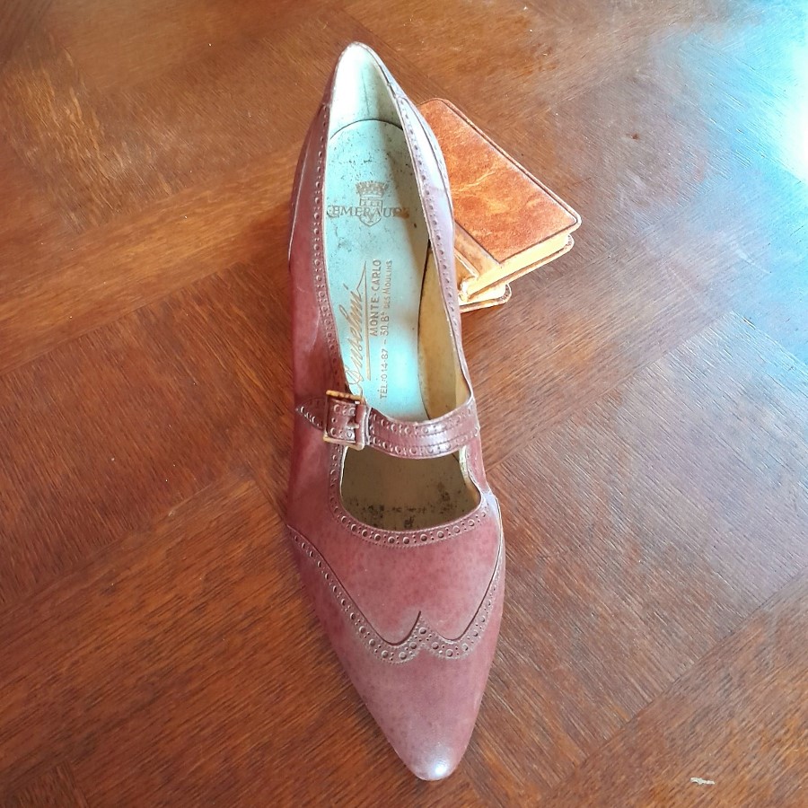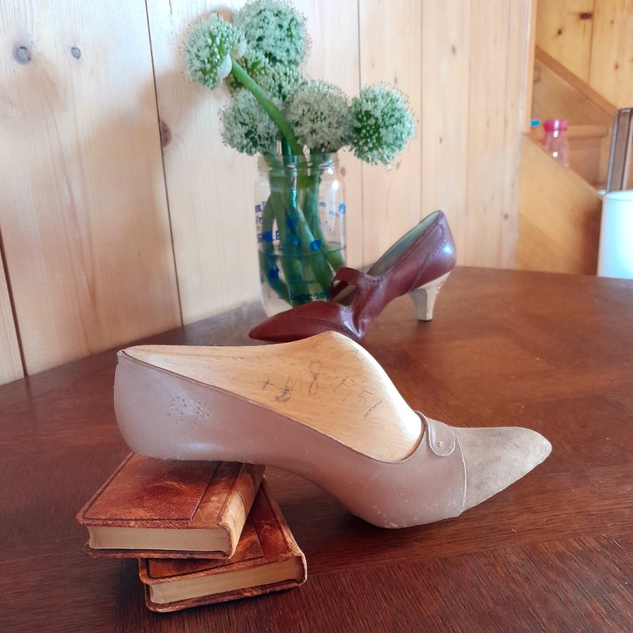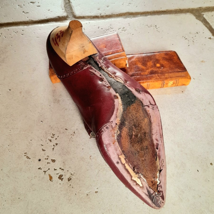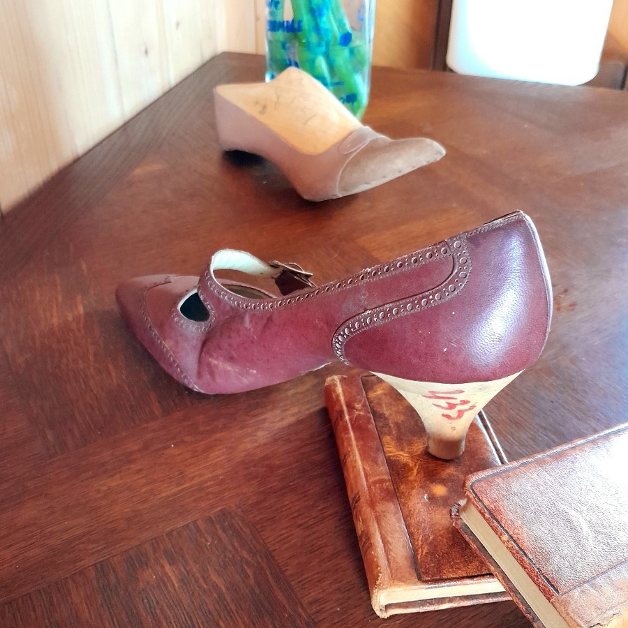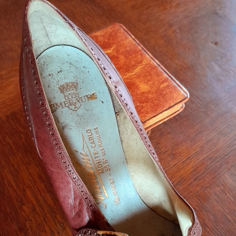 ひとつはボルドー色の革靴で、底とかかとが未完成の状態です。もうひとつは木の靴型に釘で革が付けられた状態のものです。ボルドー色の靴の内側にはモナコの靴屋さんの銘と住所などが印刷されています。もうひとつはベージュがかった薄いピンクで、表革と裏革の両面を使ったデザインです。