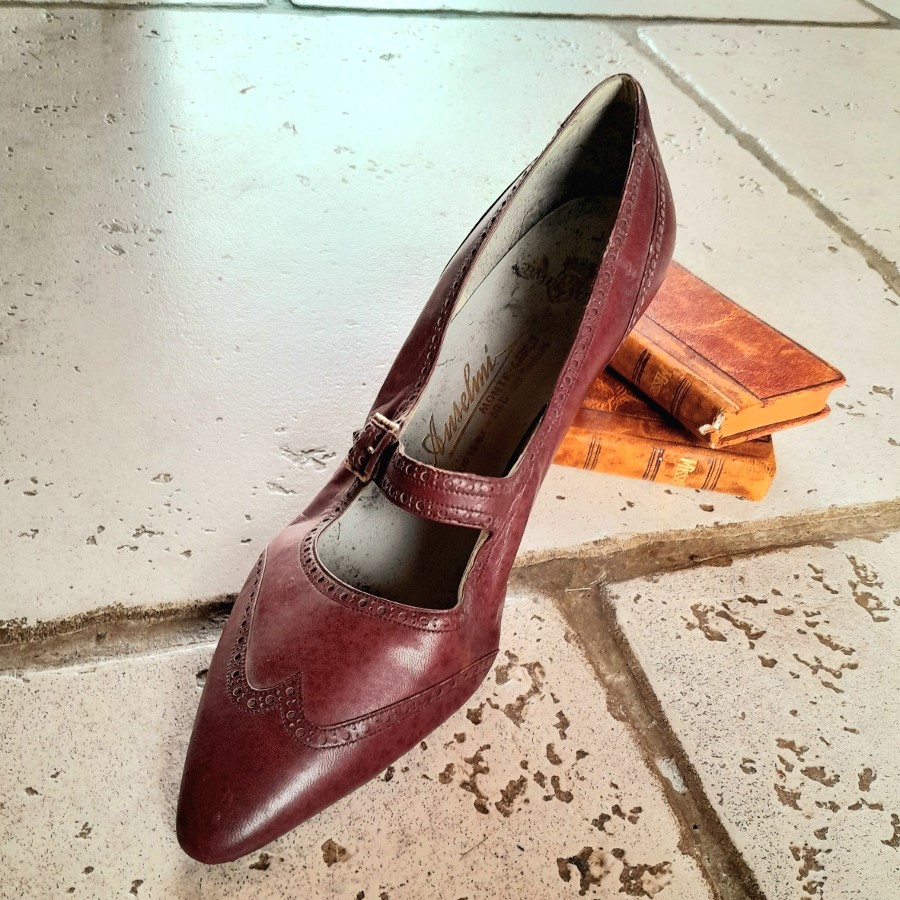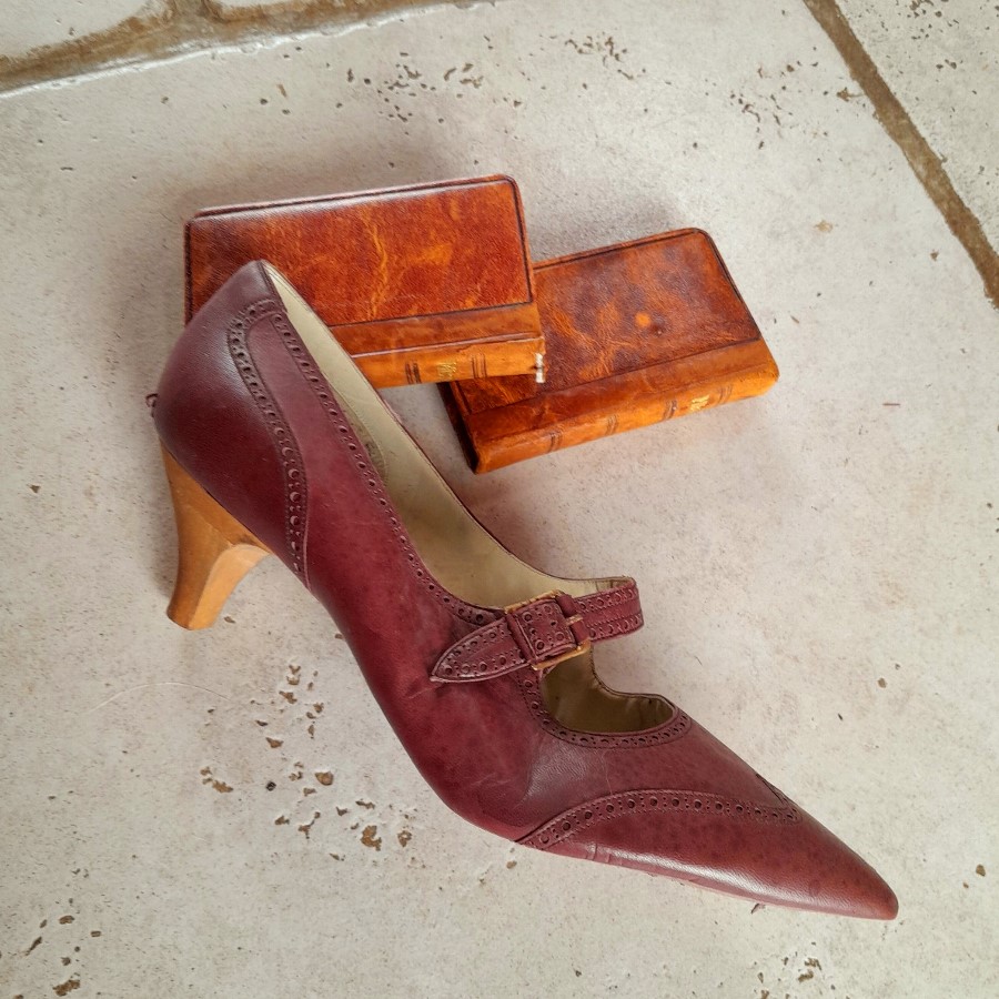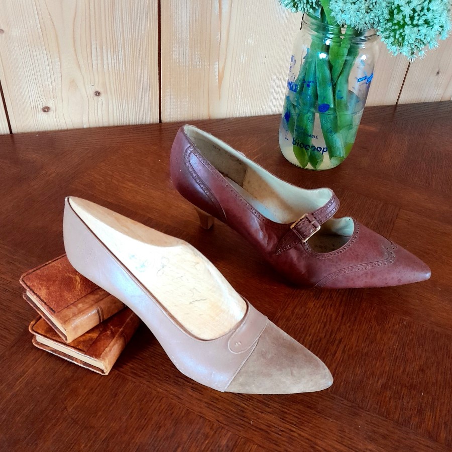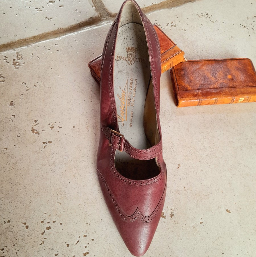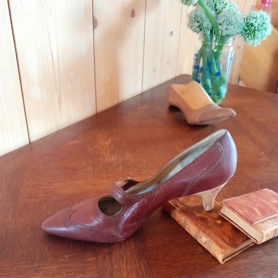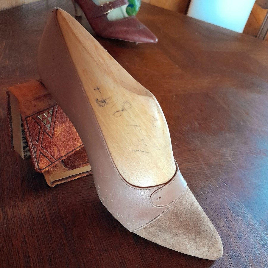 ひとつはボルドー色の革靴で、底とかかとが未完成の状態です。もうひとつは木の靴型に釘で革が付けられた状態のものです。ボルドー色の靴の内側にはモナコの靴屋さんの銘と住所などが印刷されています。もうひとつはベージュがかった薄いピンクで、表革と裏革の両面を使ったデザインです。