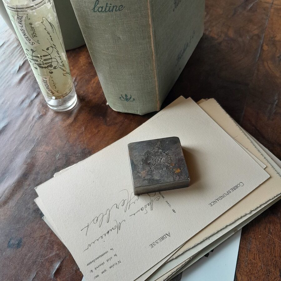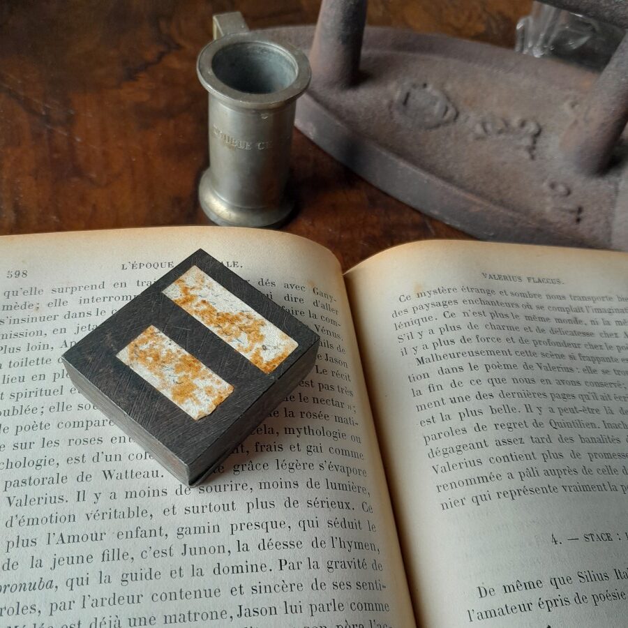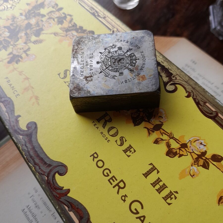 おそらく鉛が入っている金属のほぼ正方形のピースで、厚みがありずっしりと重くなっています。中央のエンブレムのデザインは細かく荘厳な雰囲気で、印刷面はきれいに残っています。