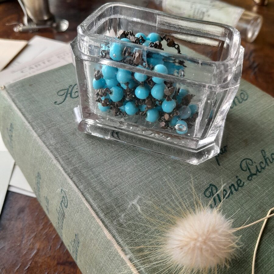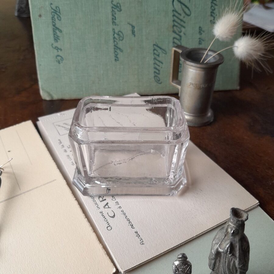 厚みのあるガラスの入れものは、ふたが無くなっておりラベルもついていないので正体は不明です。